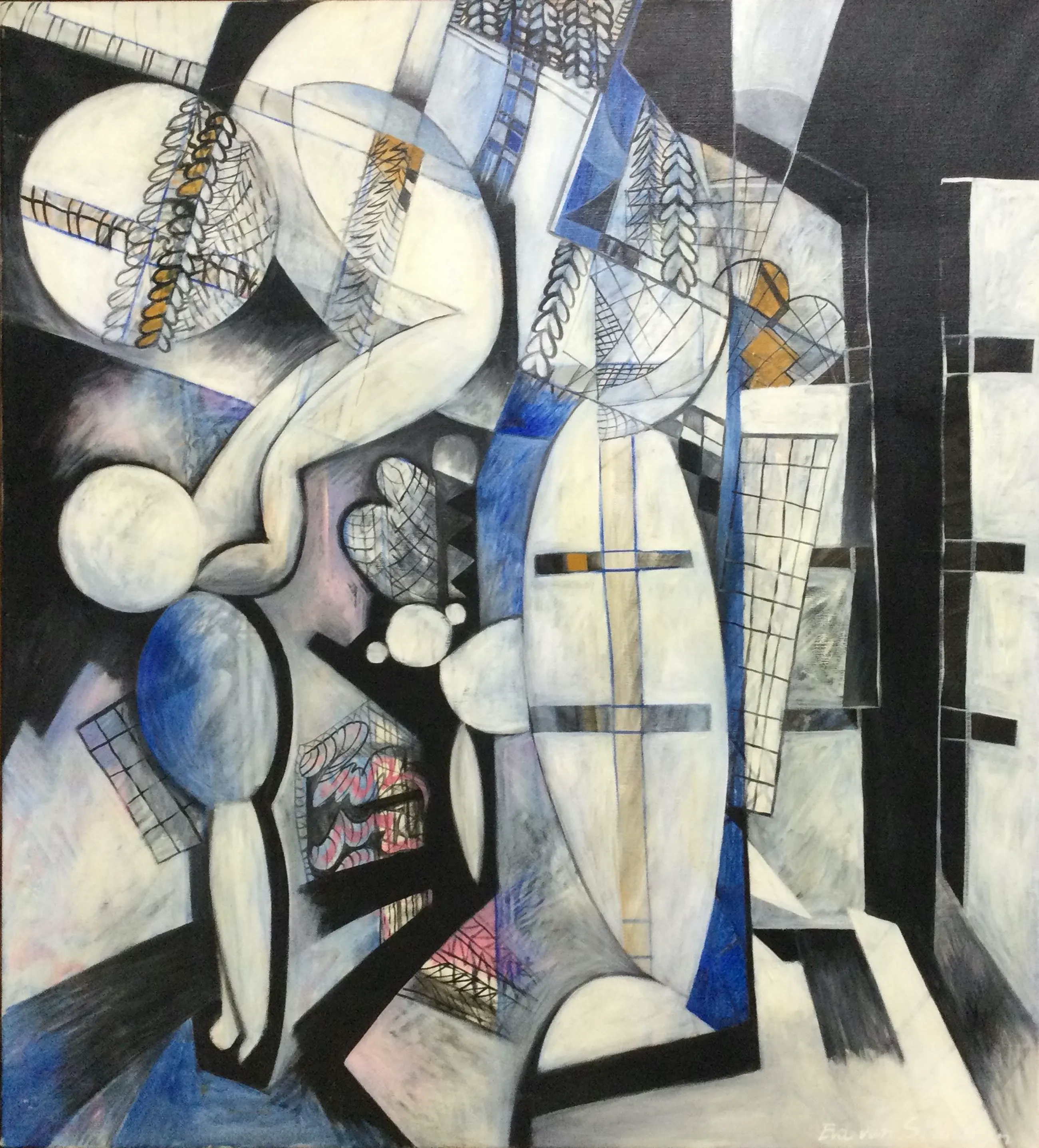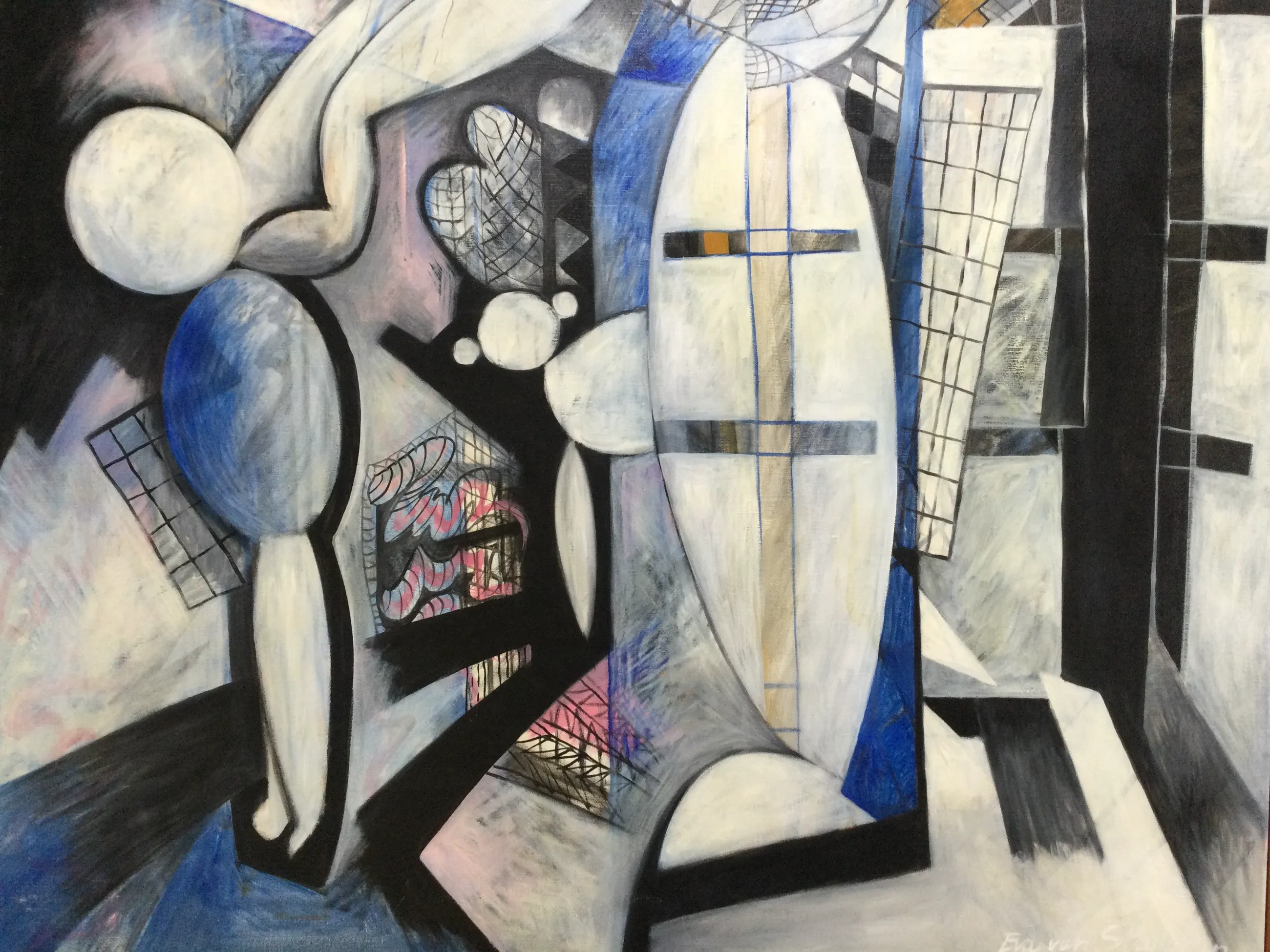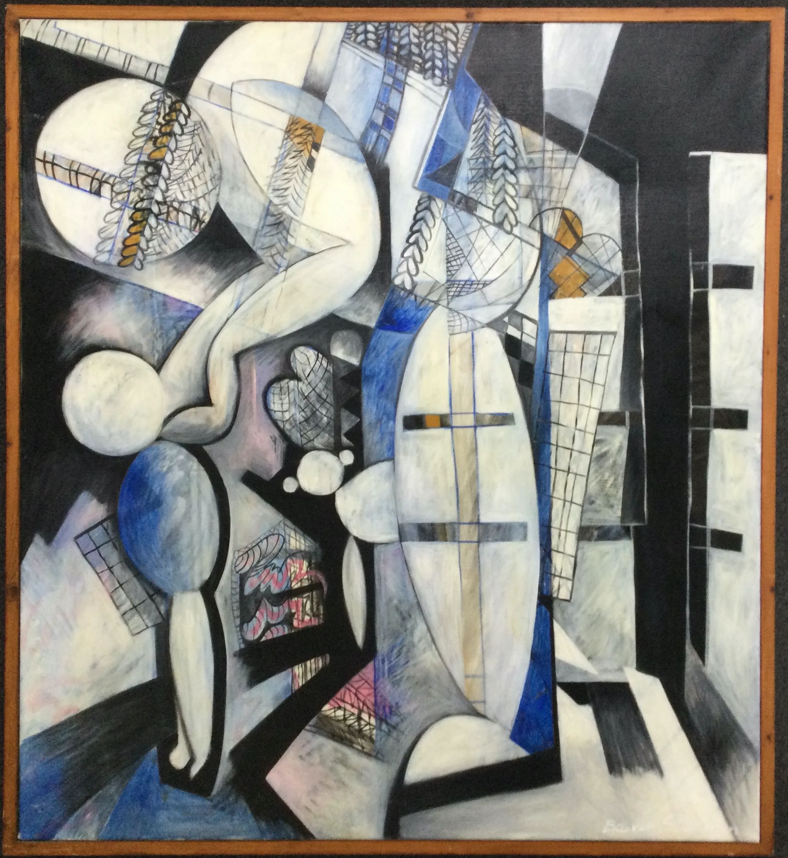 Dit schilderij -zonder titel- heeft een figuratief karakter met gebruik van geometrische vormen. Opvallend (subtiel) kleurgebruik.