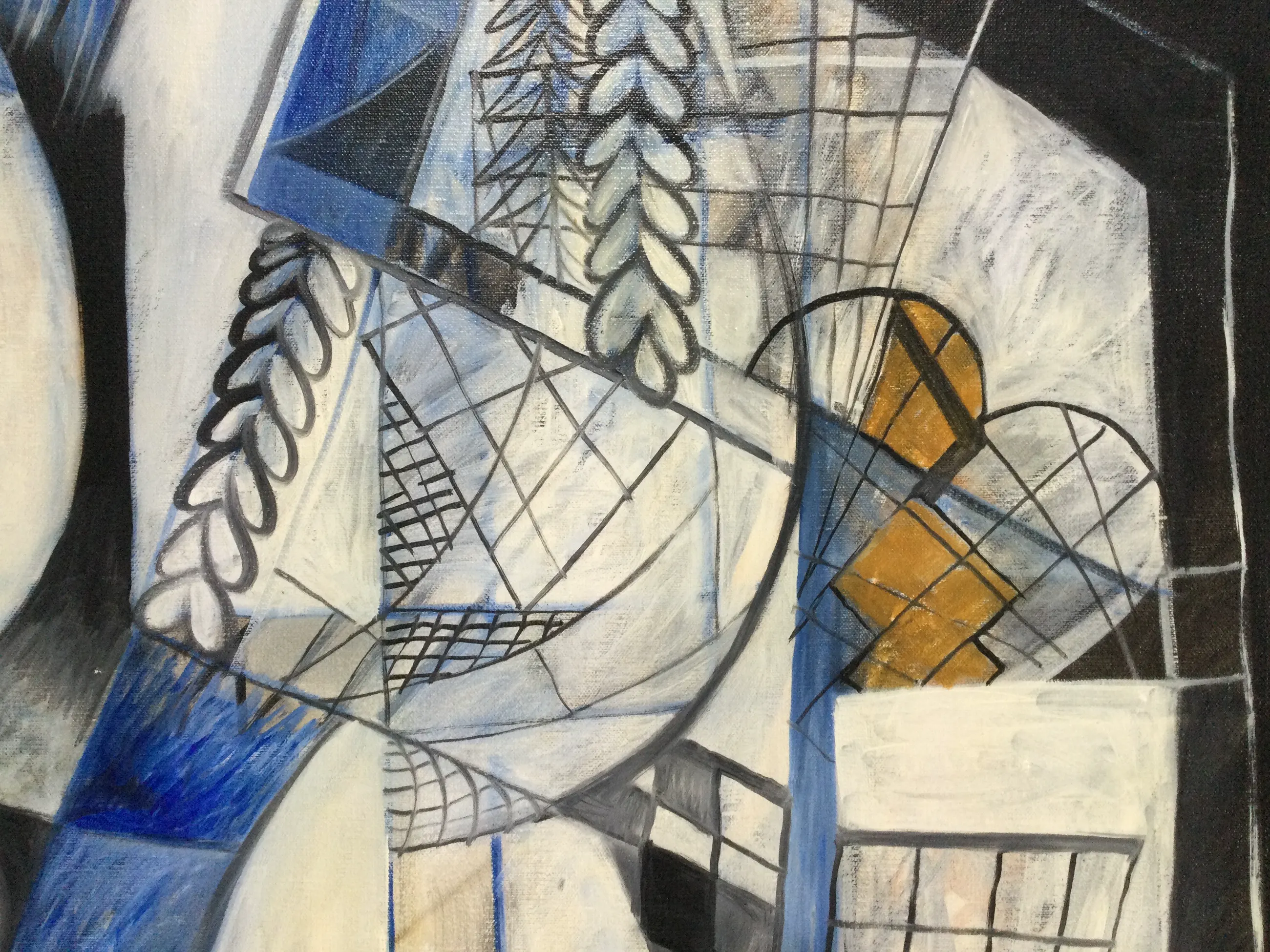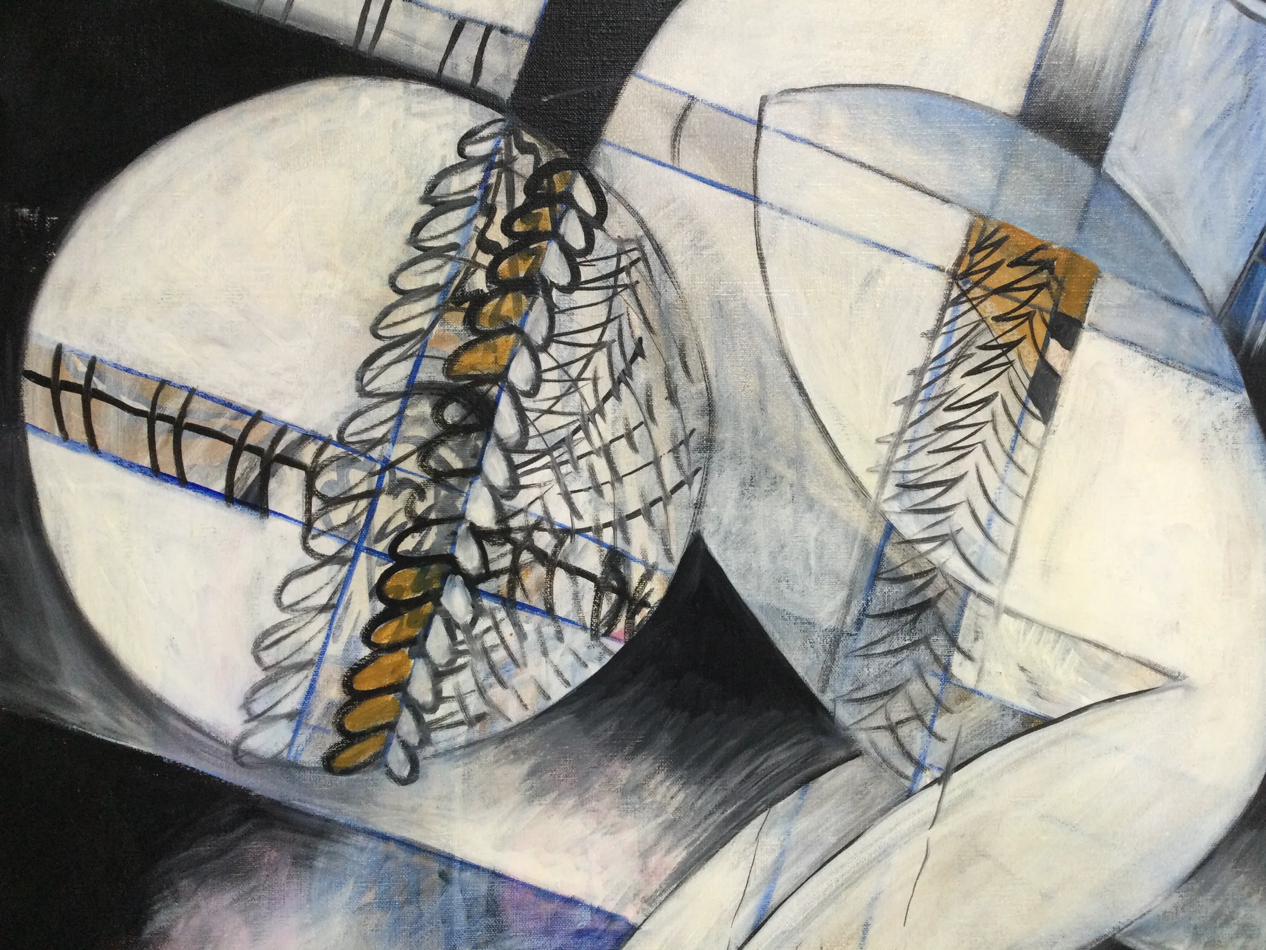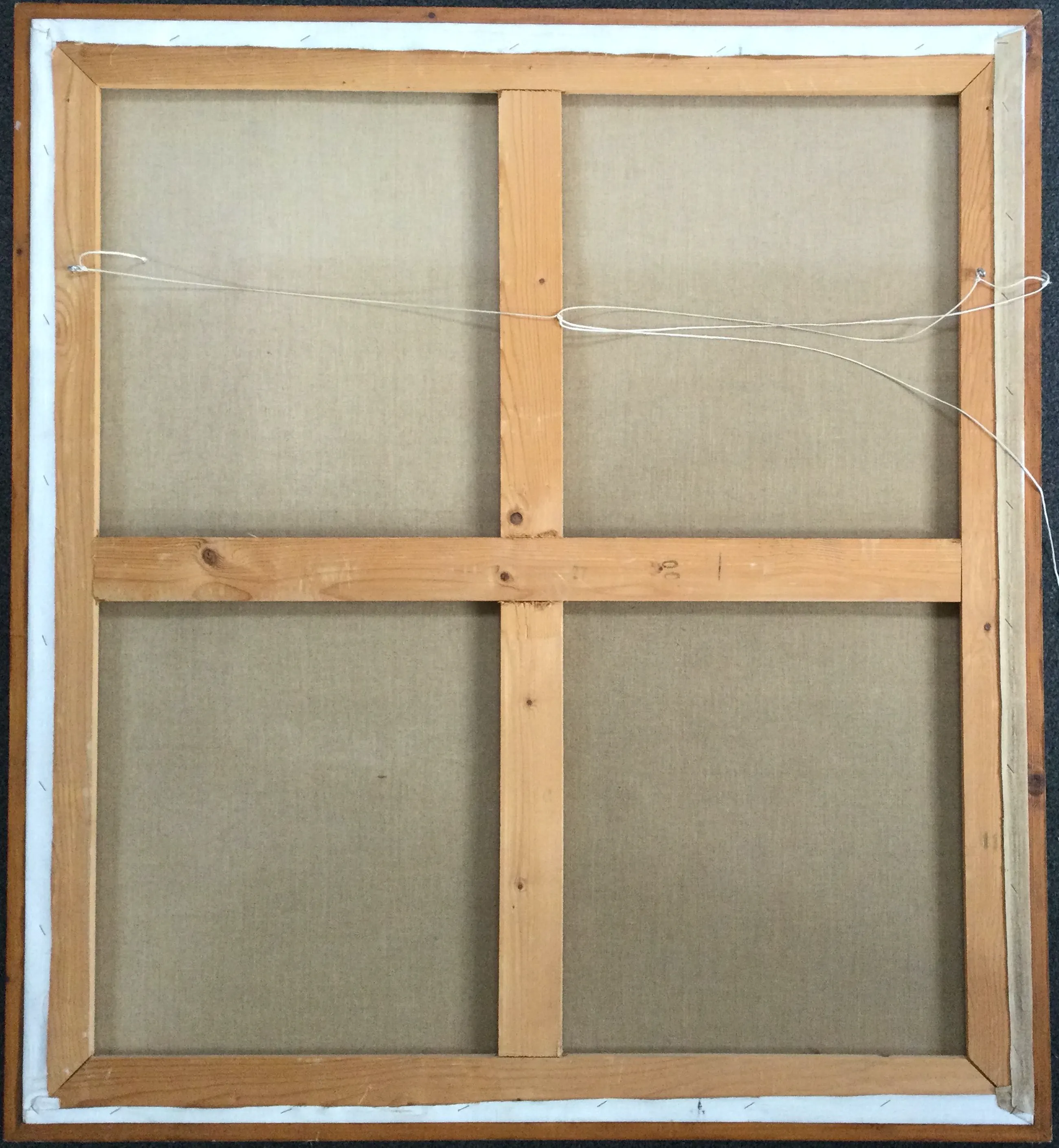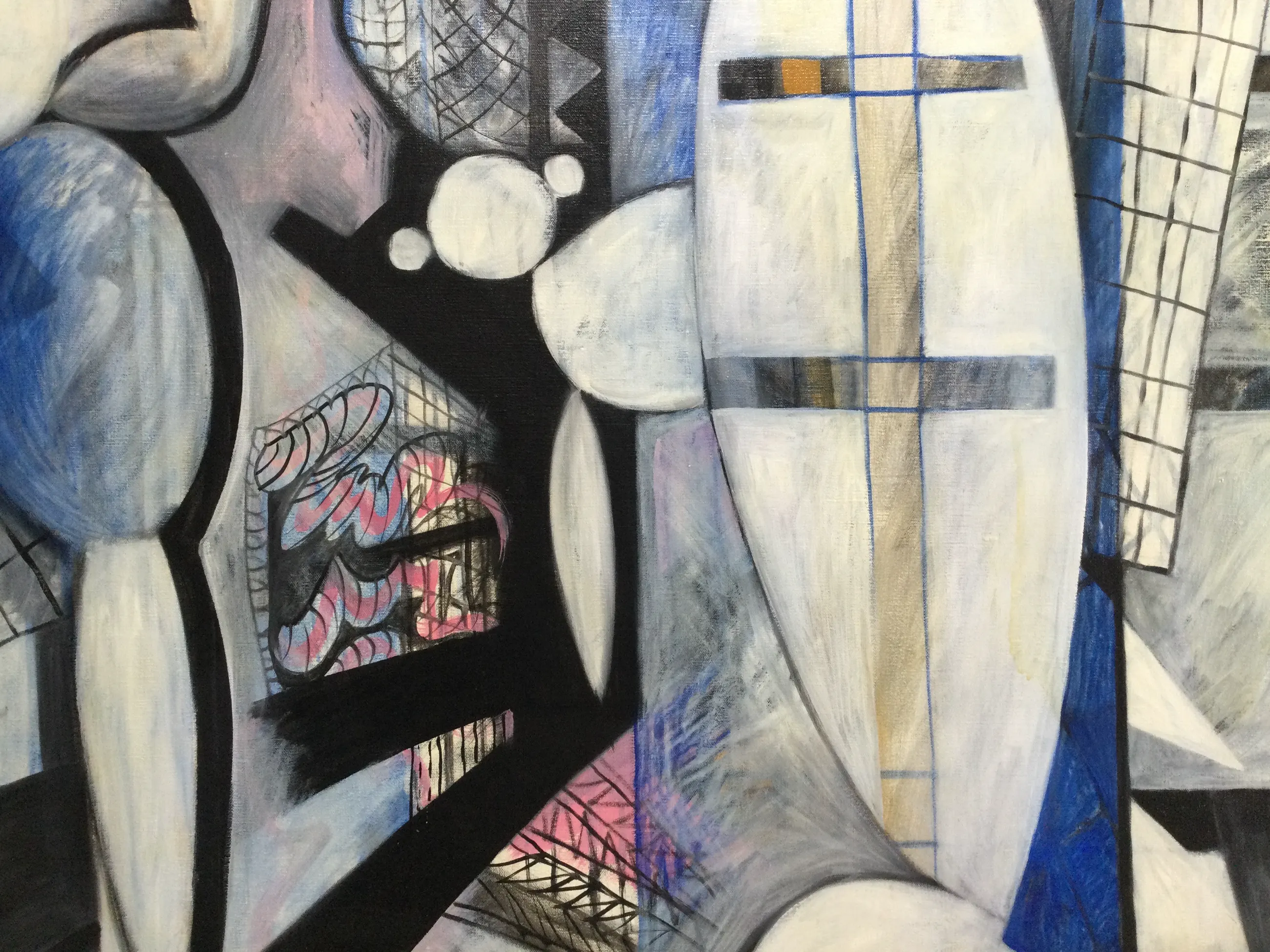 Dit schilderij -zonder titel- heeft een figuratief karakter met gebruik van geometrische vormen. Opvallend (subtiel) kleurgebruik.