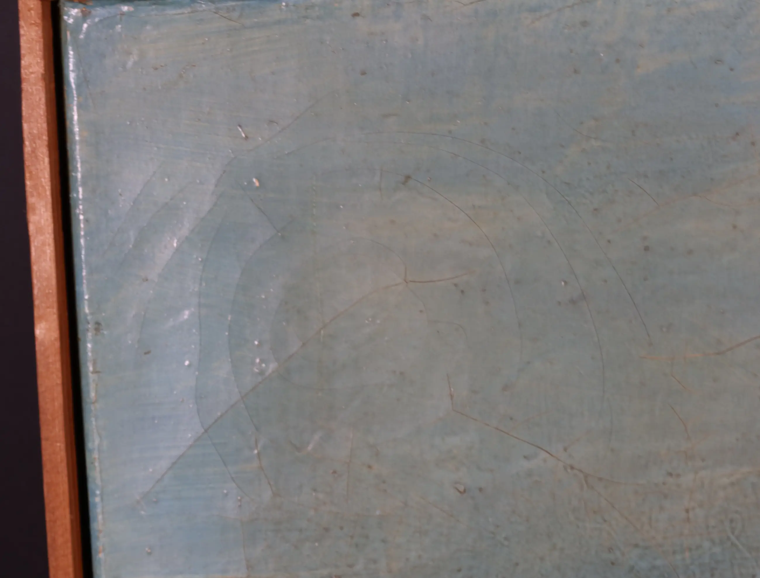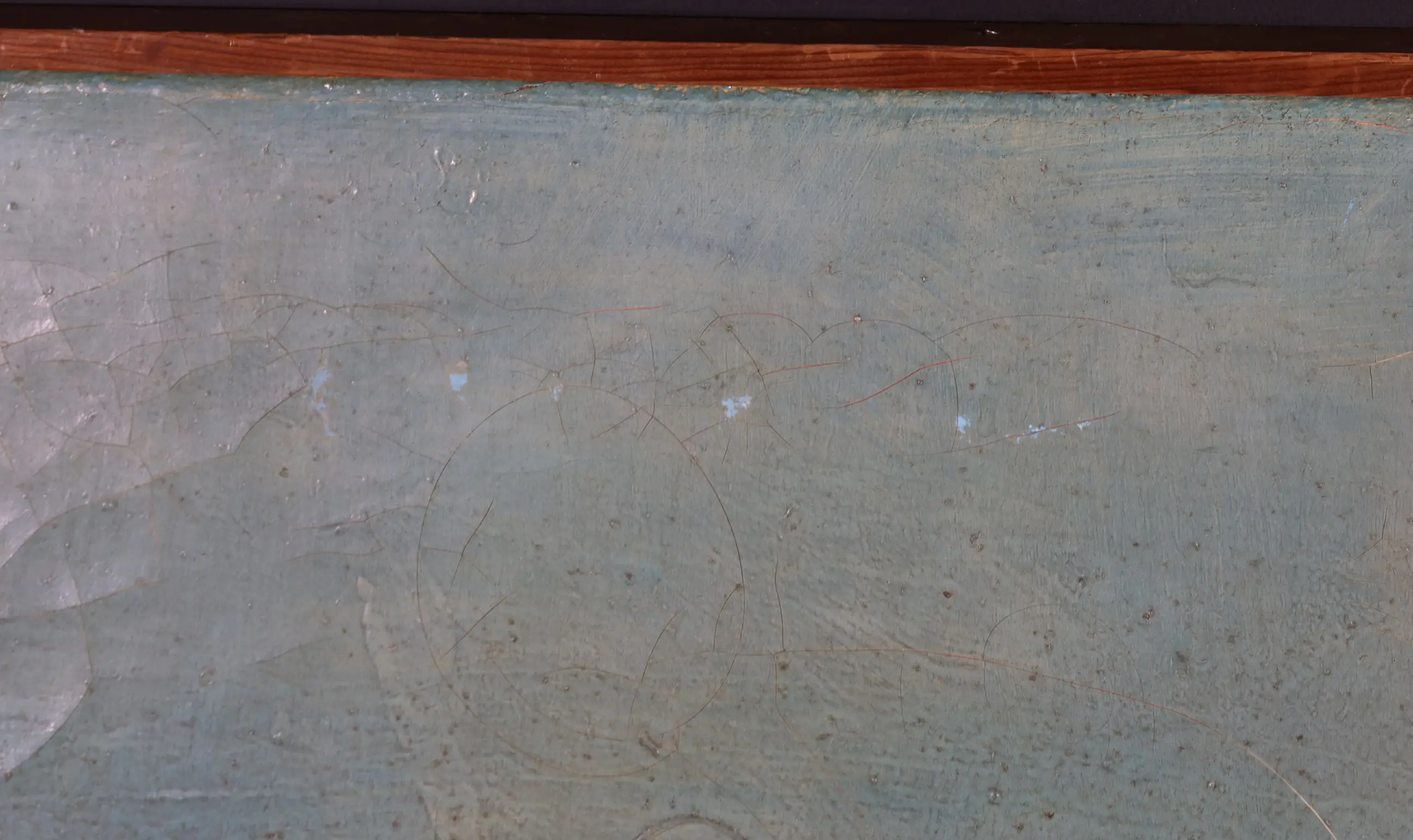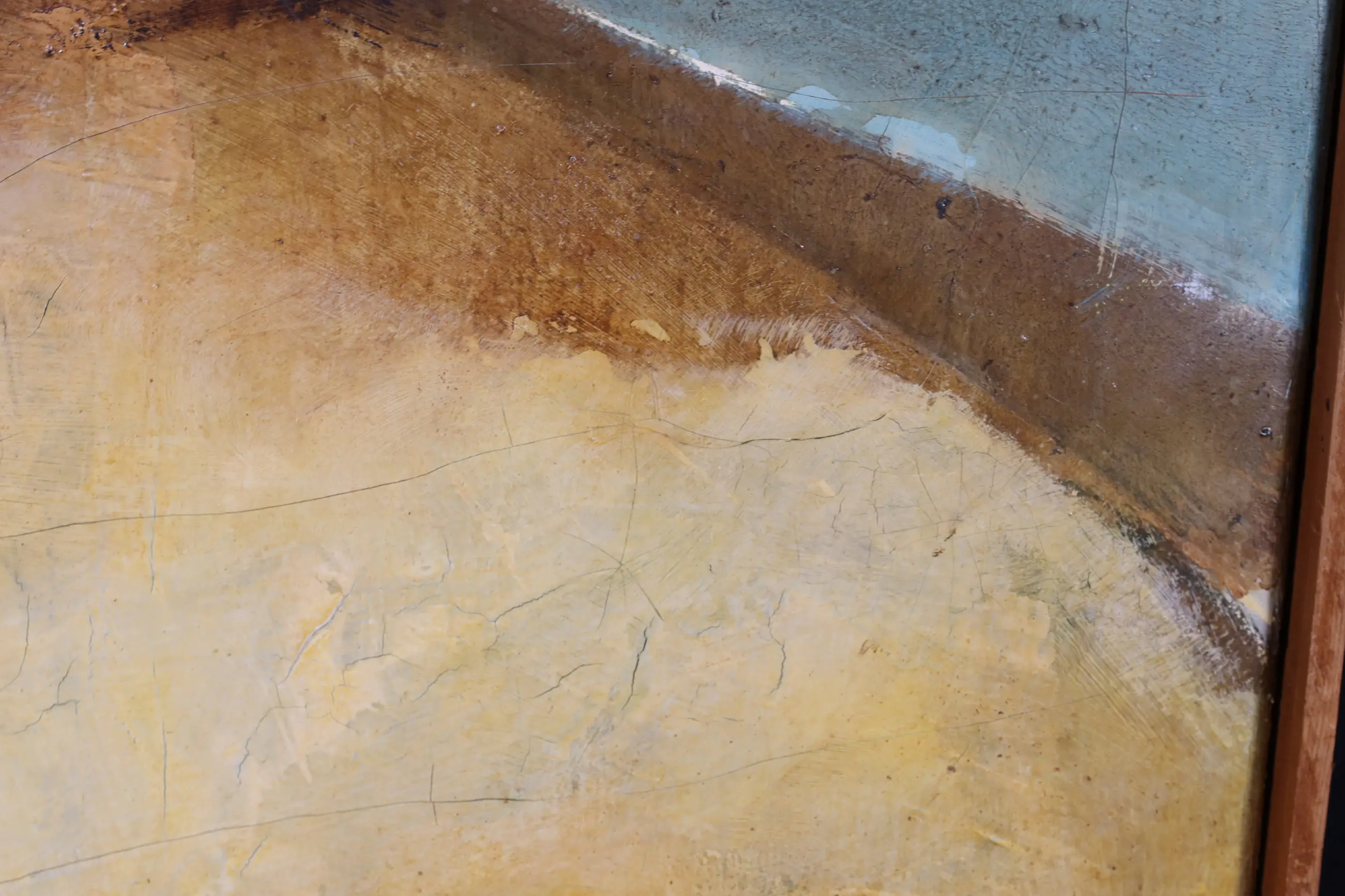 | craquelevorming en vuil over het gehele oppervlak. enkele deukjes in het doek | |