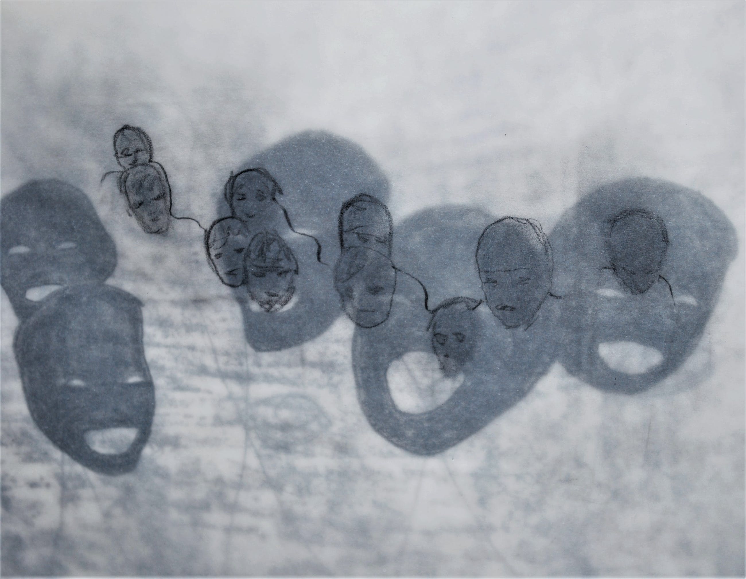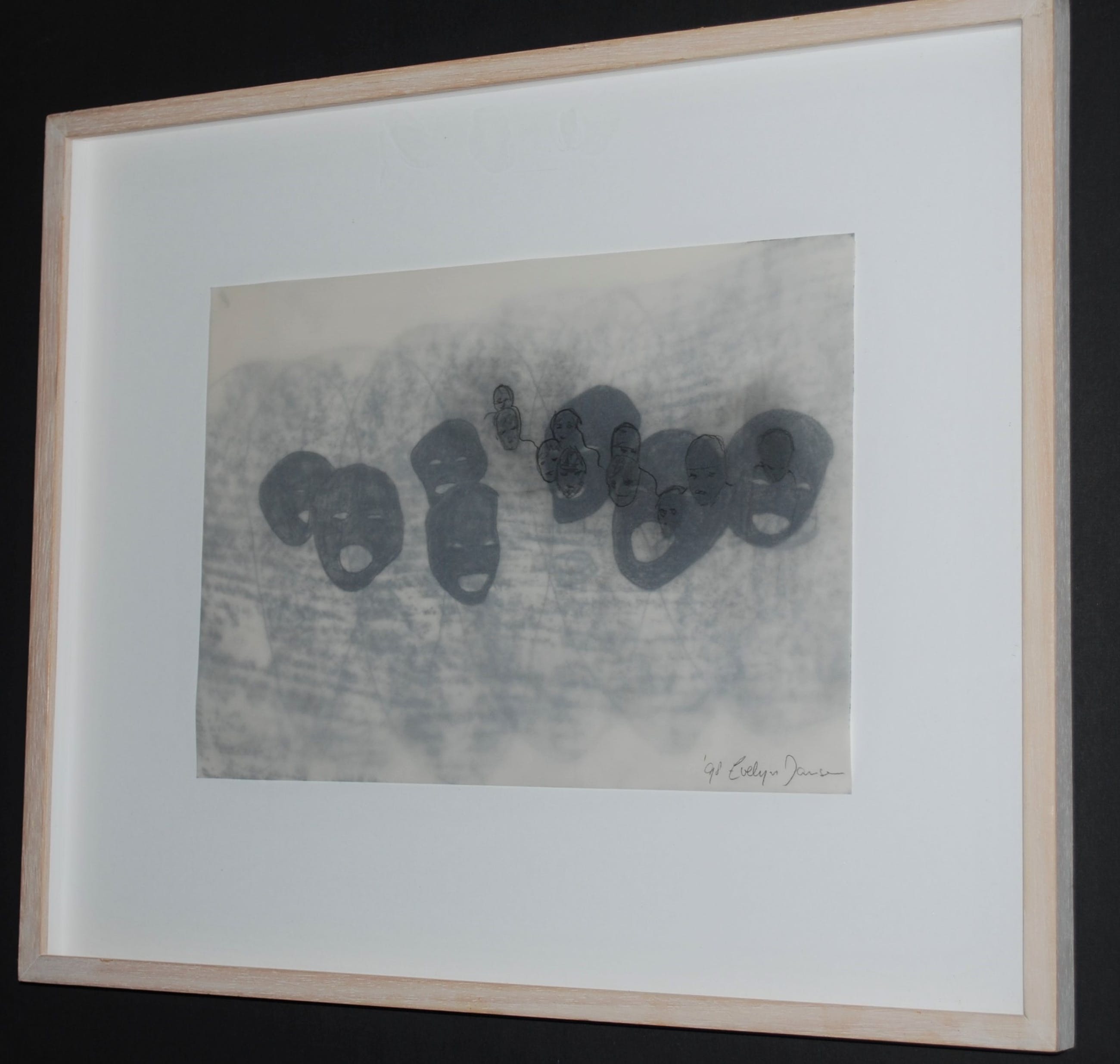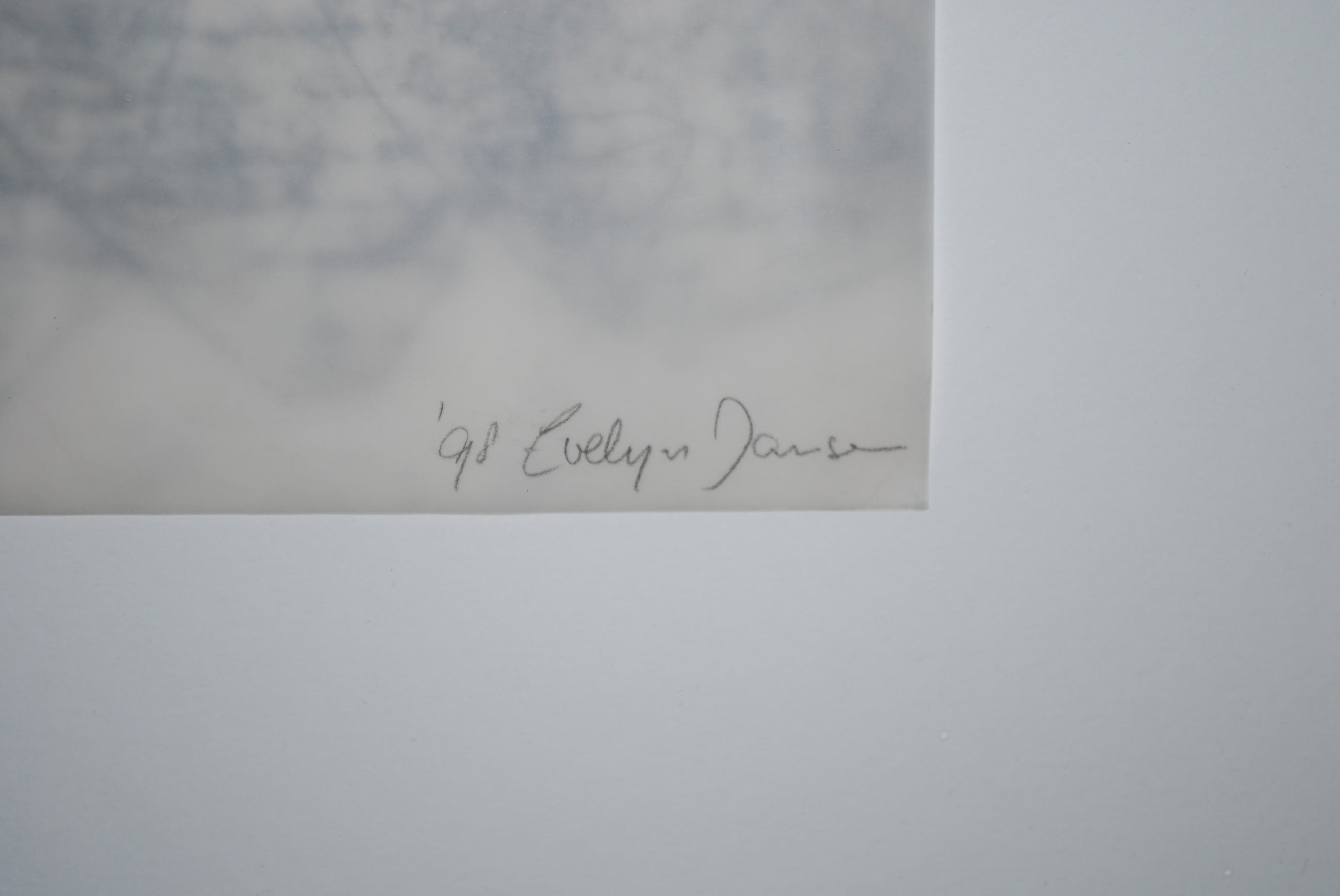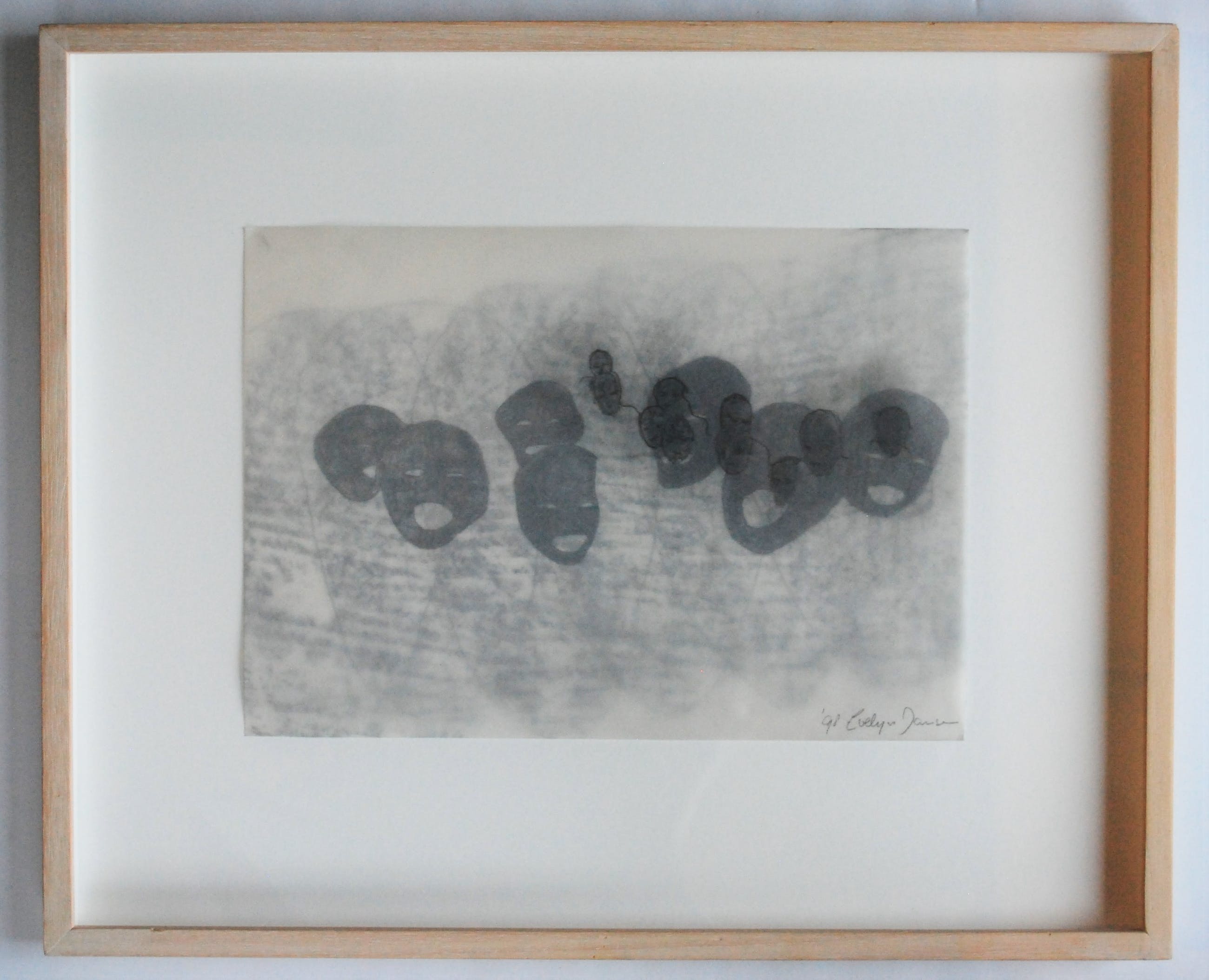 Inkt en aquarel/verdunde verf op doorschijnend papier. Zwevend gemonteerd op karton. Achter (plexi)glas, in een fraaie strakke houten lijst (gebruikssporen).