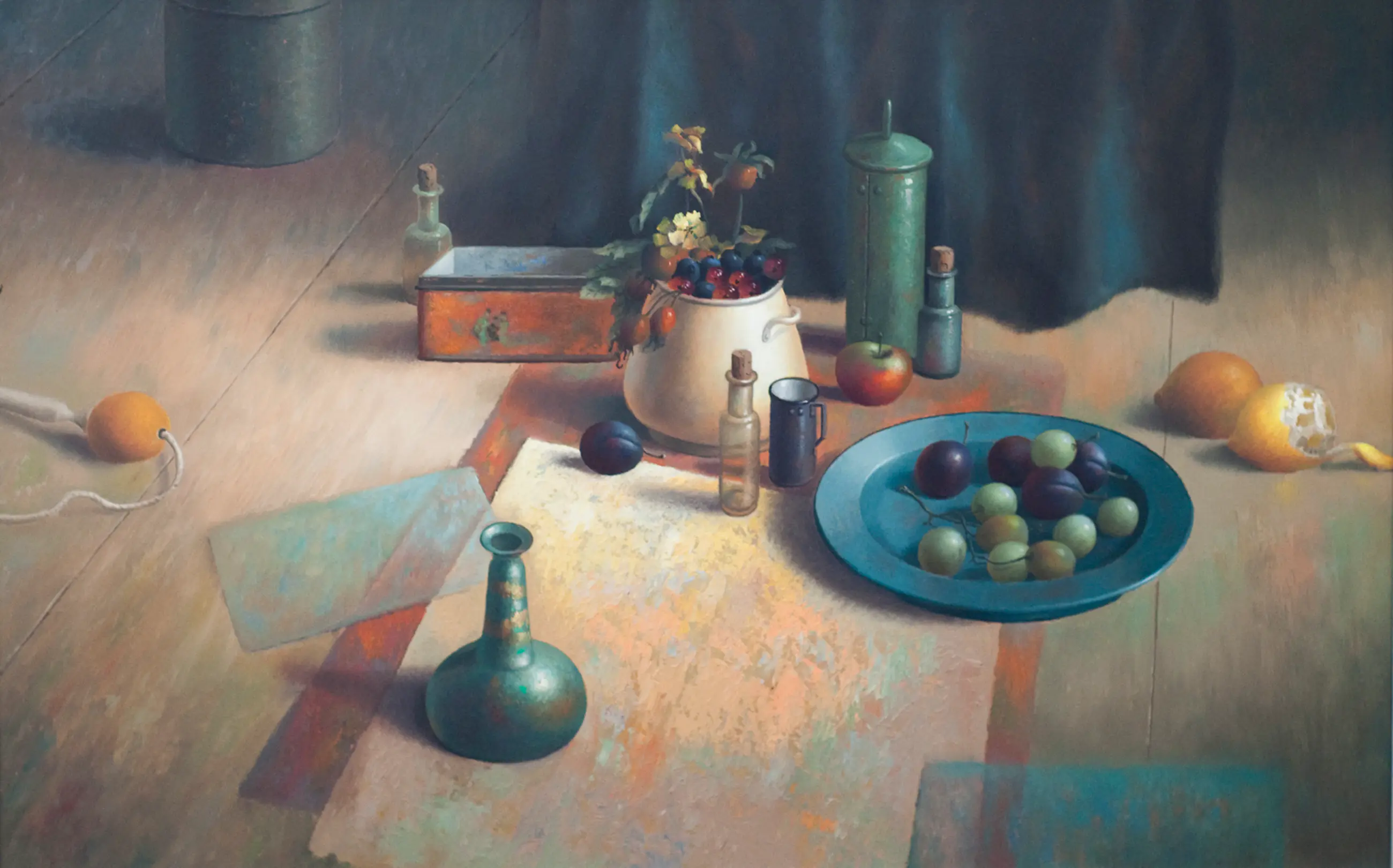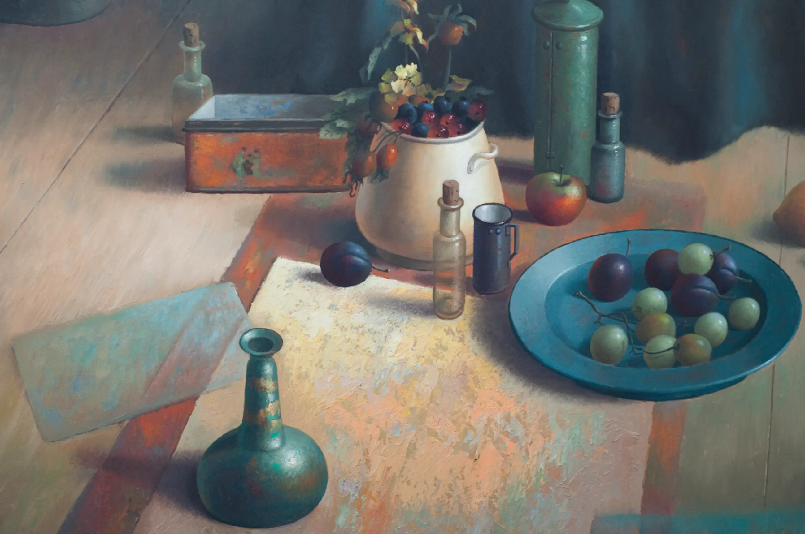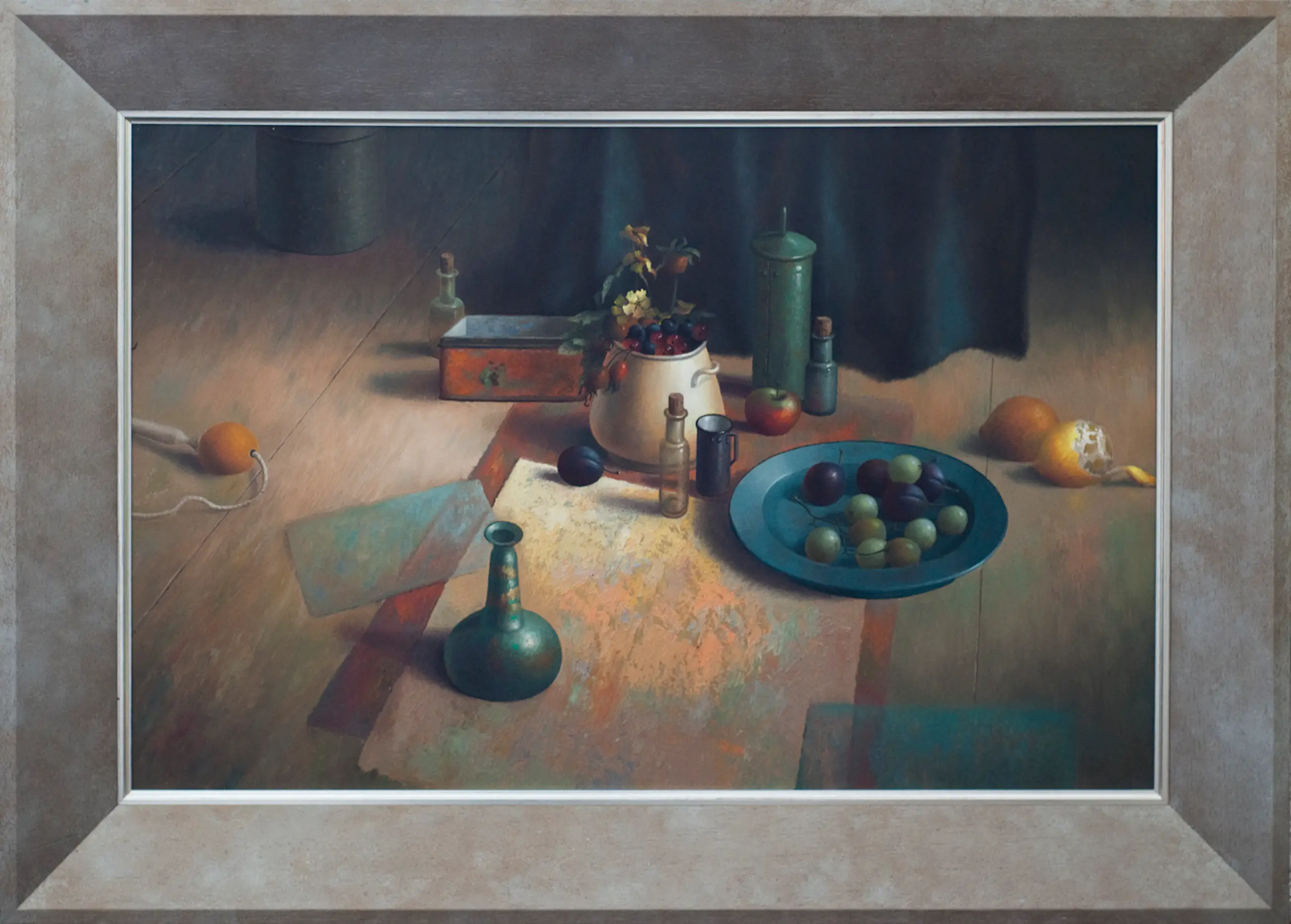 Evert Dijkstra (1948) besloot in de jaren 80 om stilleven schilder te worden. Hij sluit daarbij aan bij de klassieke meesters van de 17e eeuw, maar geeft naast bv. fruit en bloemen ook eigentijdse voorwerpen weer, zoals flesjes, speelgoed, blikken voorwerpen. Ook de compositie is heel eigentijds. Met de precieze gedetailleerde weergave sluit hij juist weer aan bij het werk van de oude meesters. Hij typeert zijn werk zelf als ‘een wereld van stilte, meditatie en licht.’ In dit werk komt dat goed tot uiting. Je kunt er heel lang naar kijken.