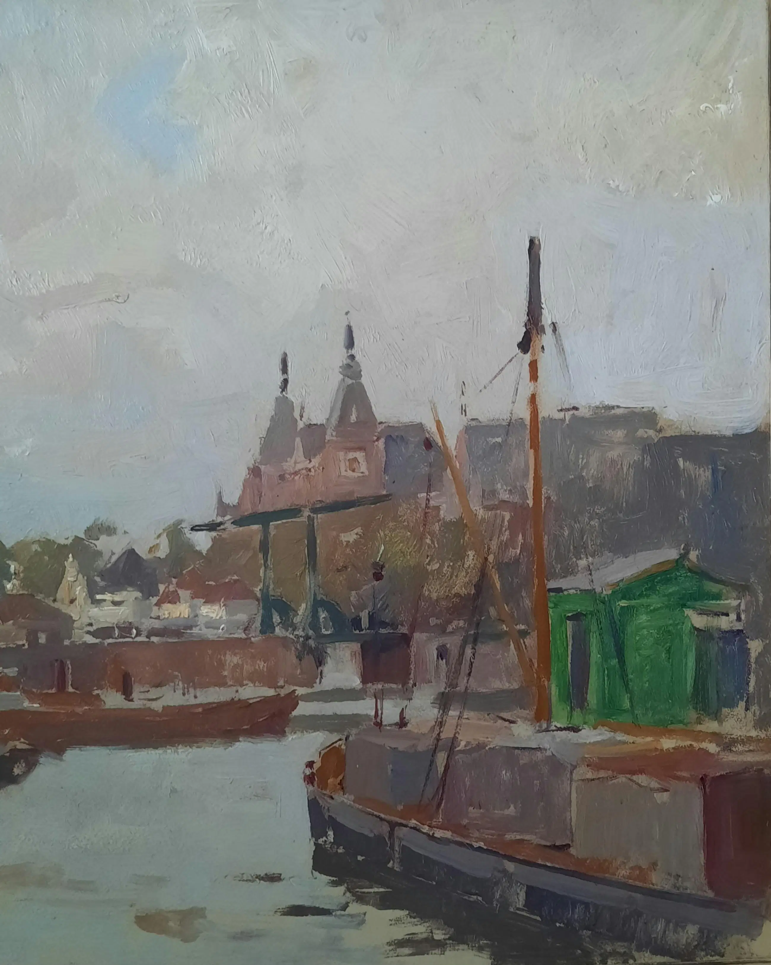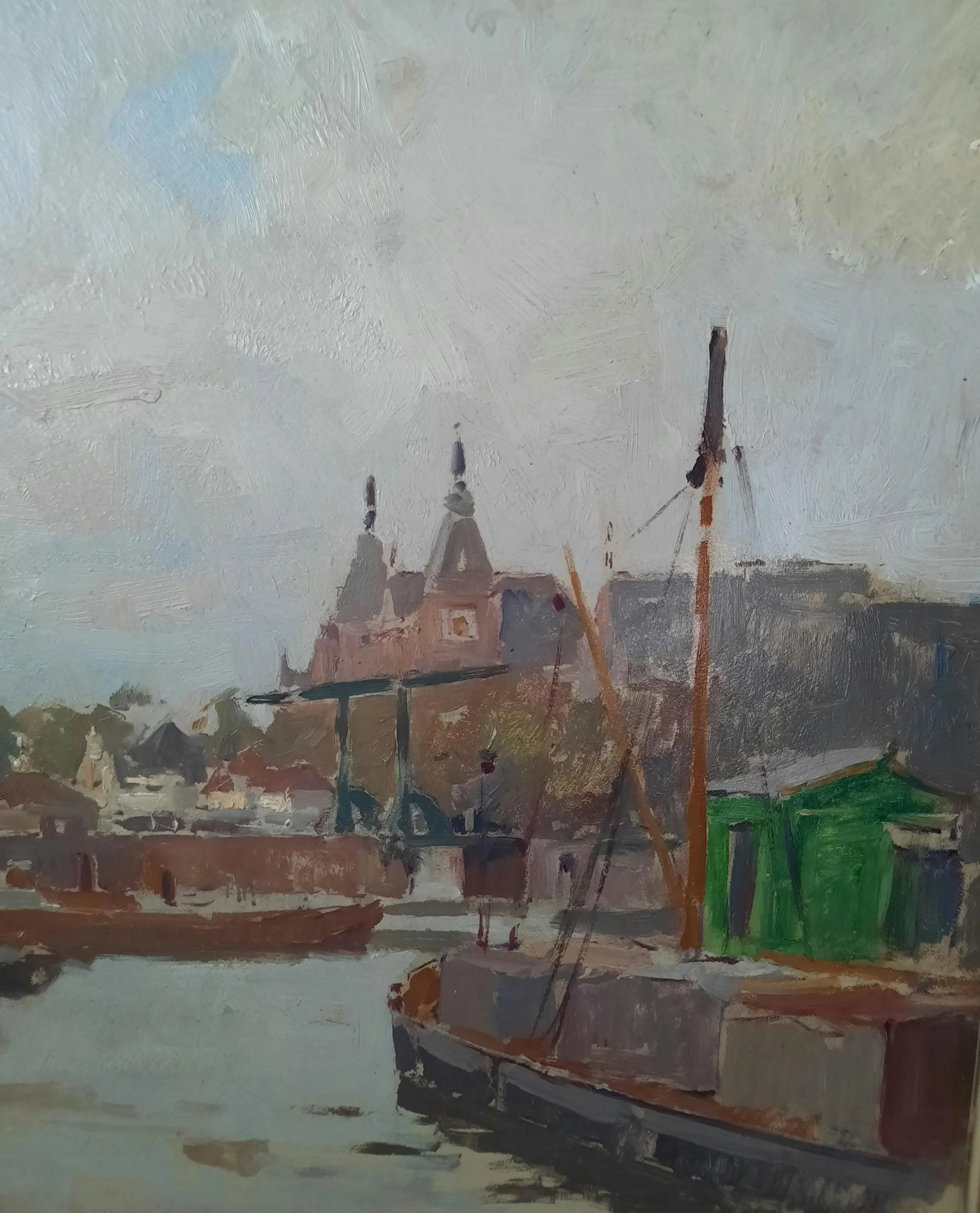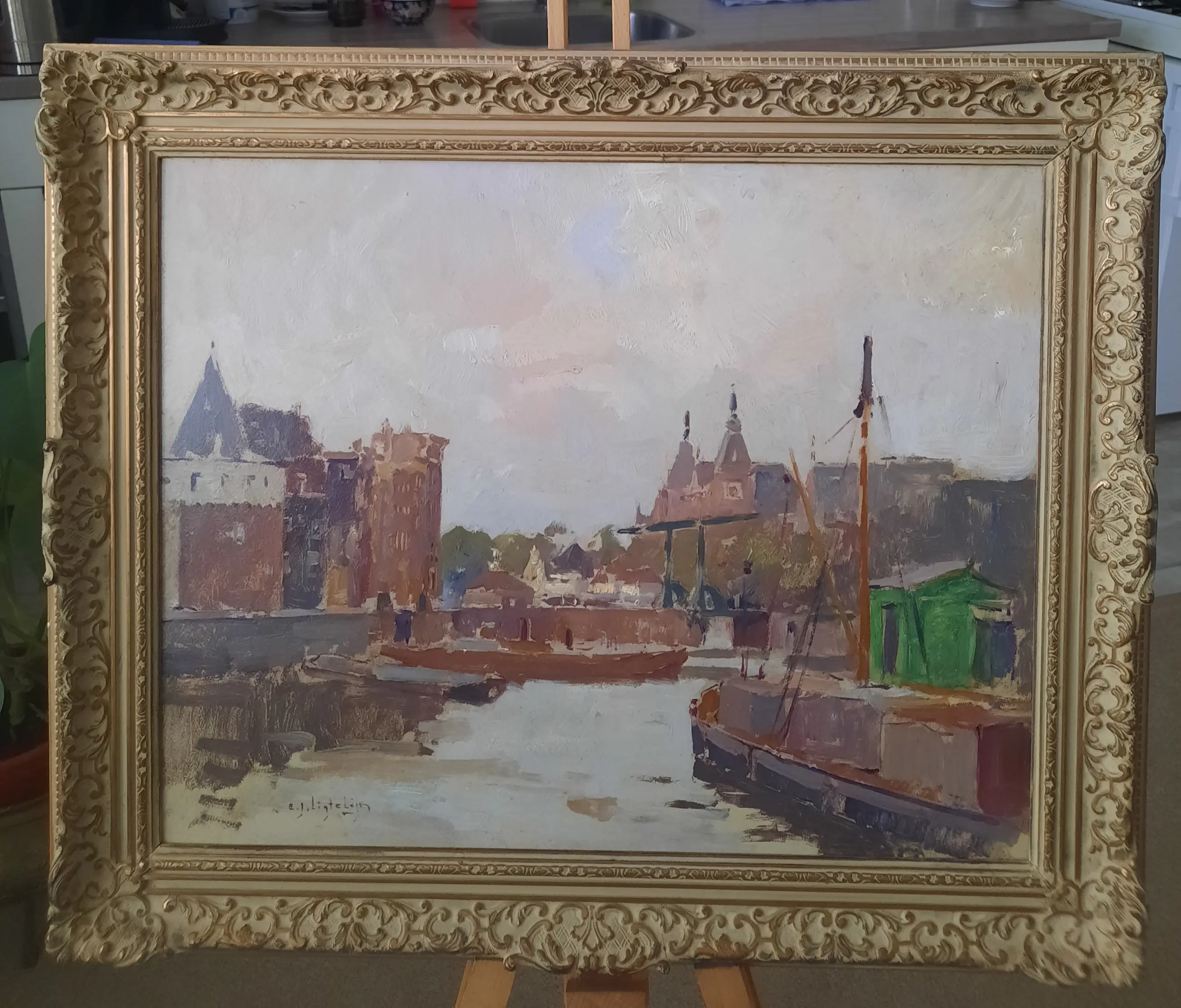 Vlot geschilderd stemmingsvol stadsgezicht van Evert Jan Ligtelijn. Knap in impressionistische stijl neergezet, helder van kleur. Met een goed gekozen beperkt kleurenpalet. In Heijdenrijk lijst.