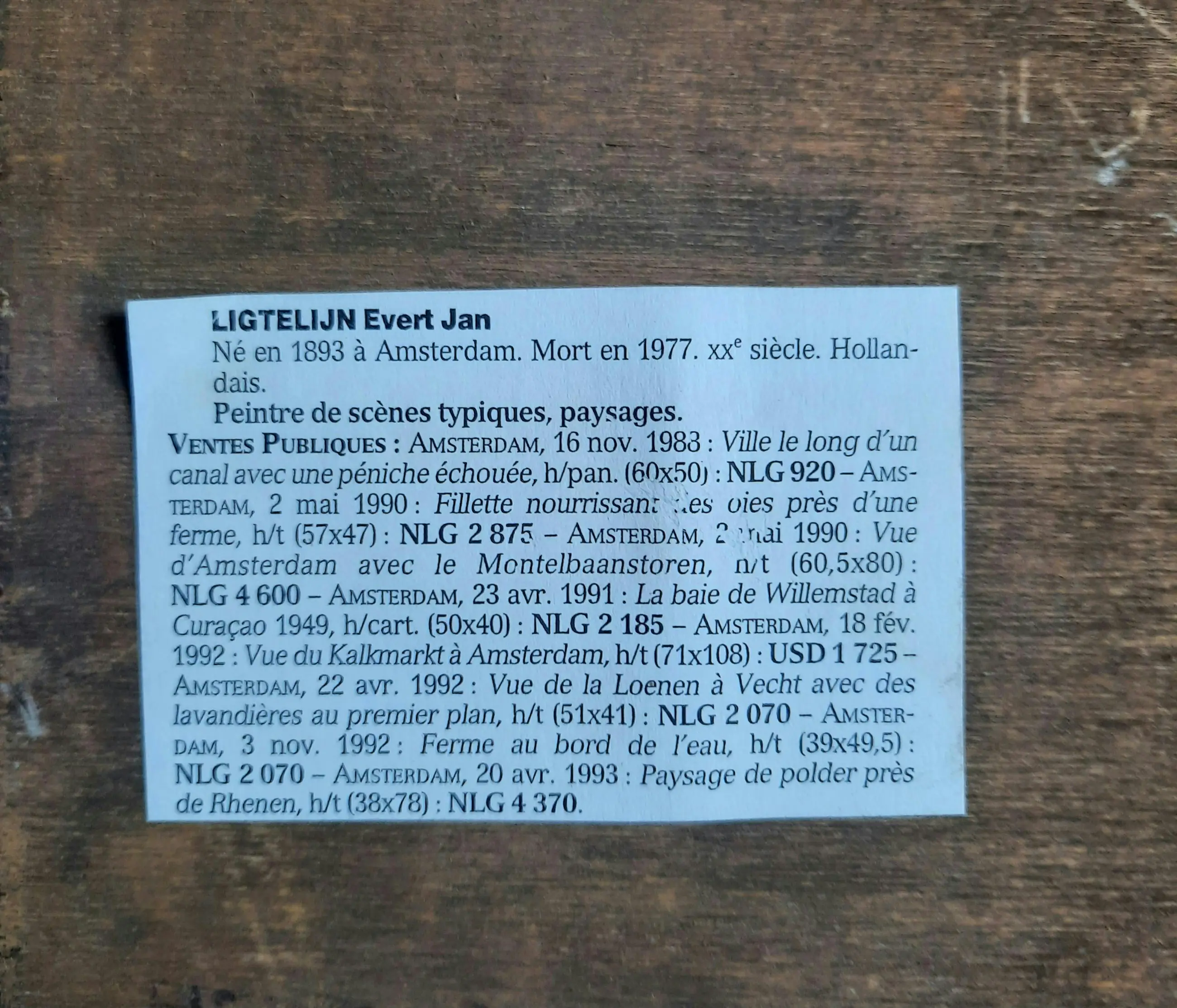 Evert Jan (E.J.) Ligtelijn schilderde als geboren en getogen Amsterdammer veel Amsterdamse stadsgezichten. Maar hij zocht ook de natuur op bij Laren en Blaricum, Loosdrechtse plassen, de Vecht. En in het buitenland: Canarische Eilanden en Curaçao. Hij was bevriend met Harrie Kuyten en Nico Bruijnestein.
