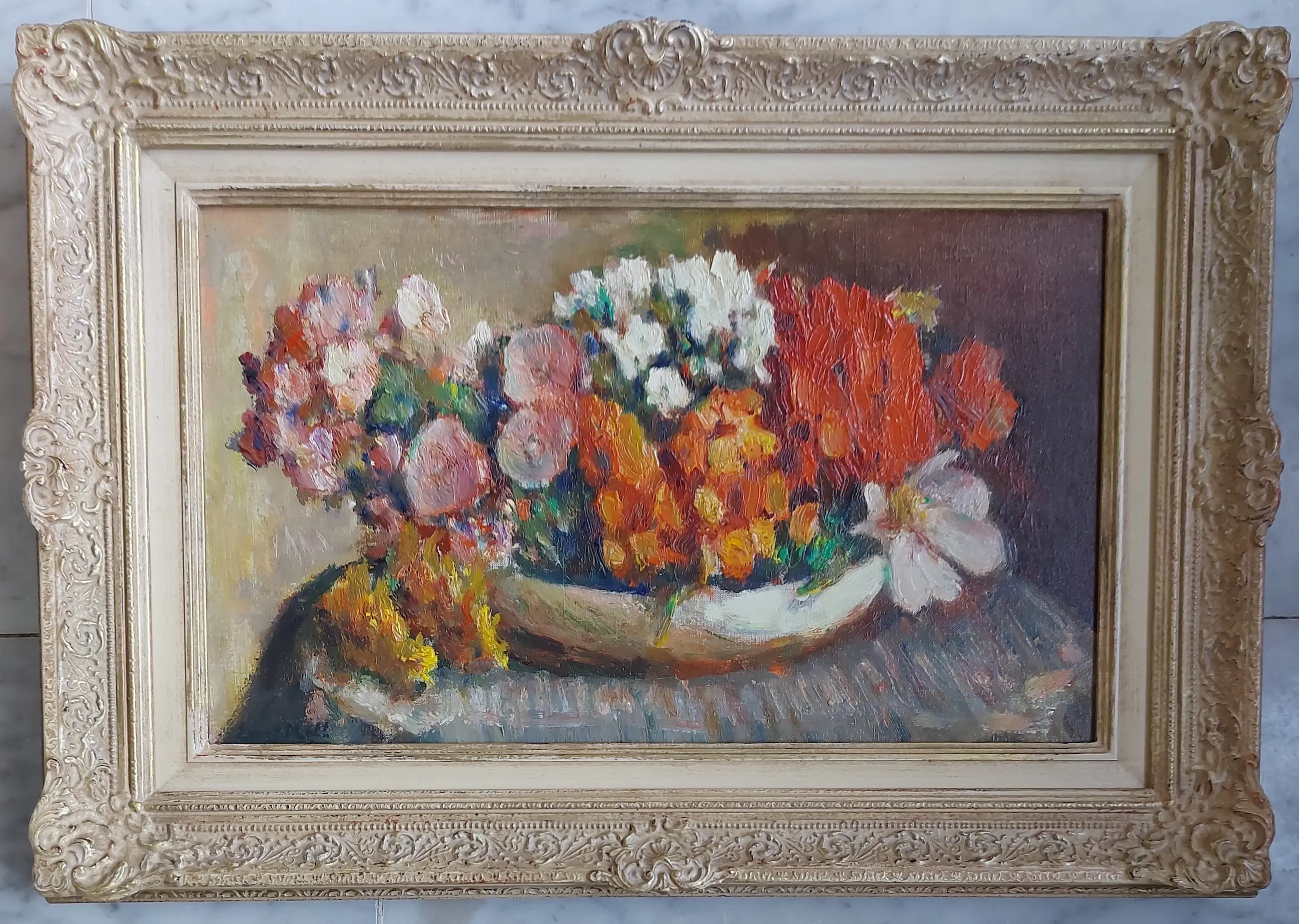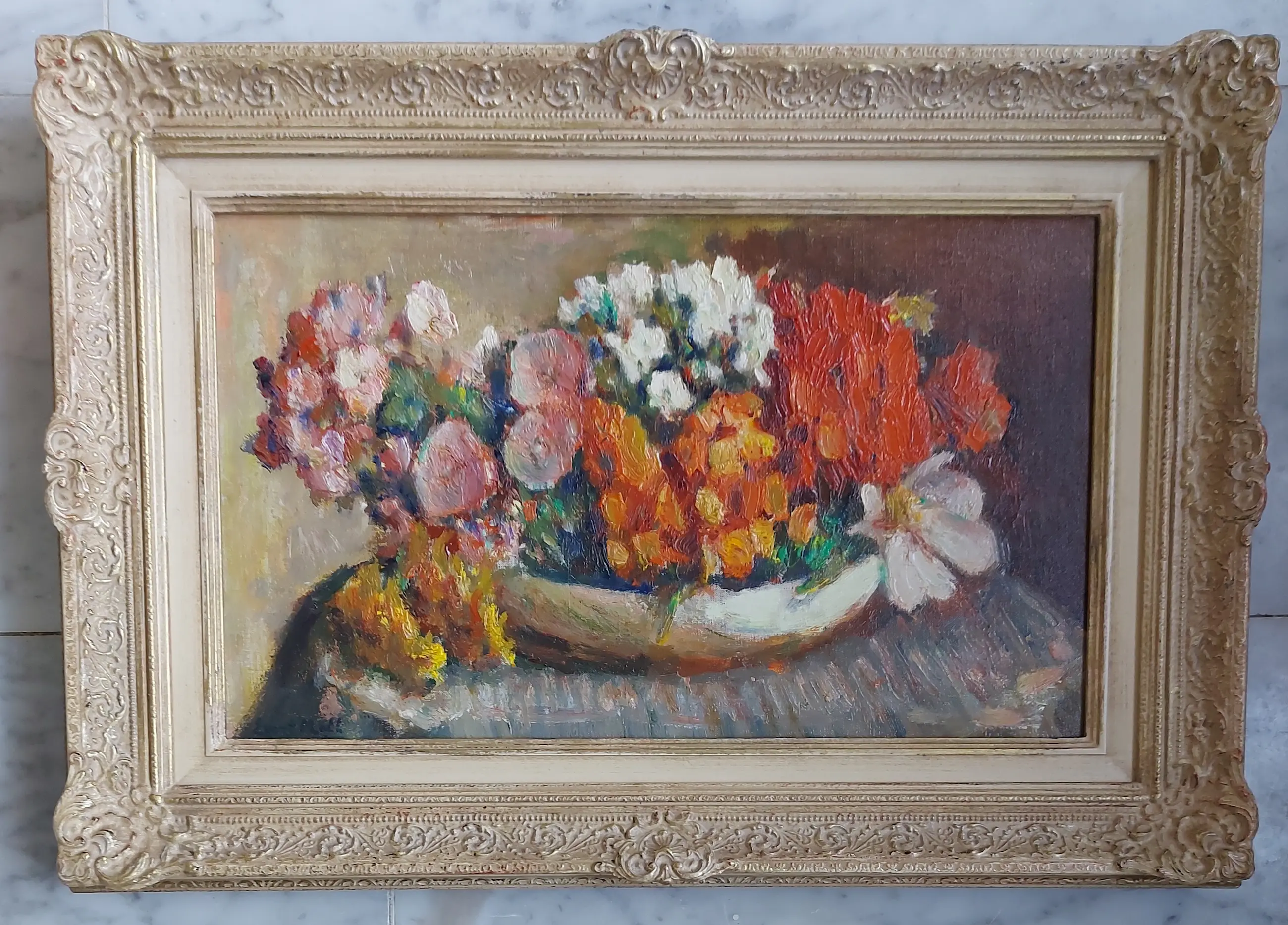 Een bloemstilleven van Ever Moll 1878 - 1955 Olueverf op doek en gesigneerd links onder - afmeting is bij benadering Het kunst zit ingelijst in een prachtig bijpassende omlijsting