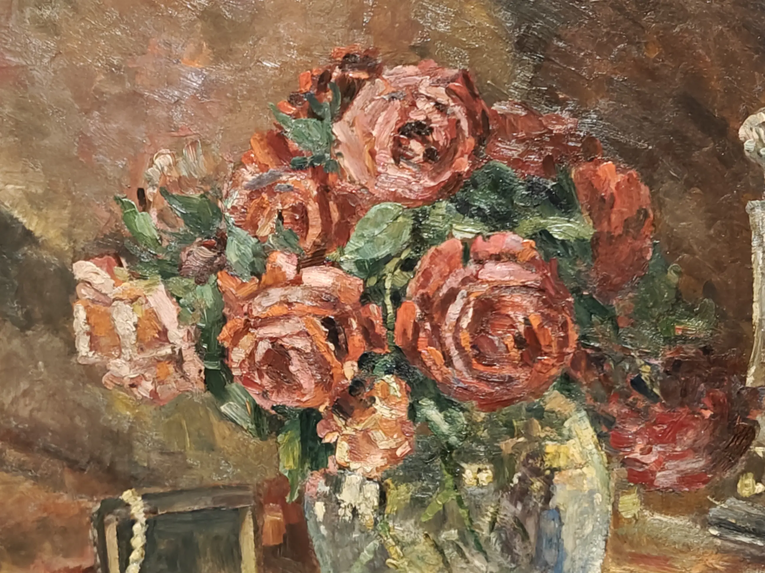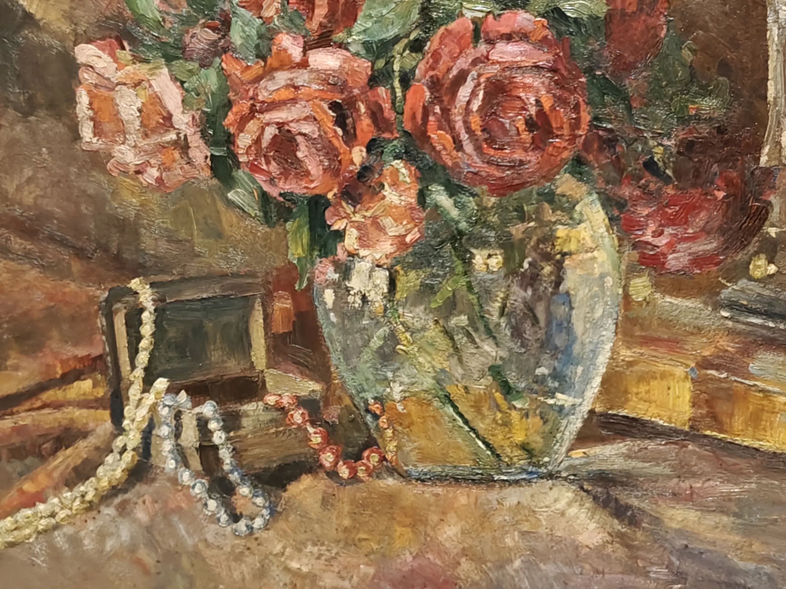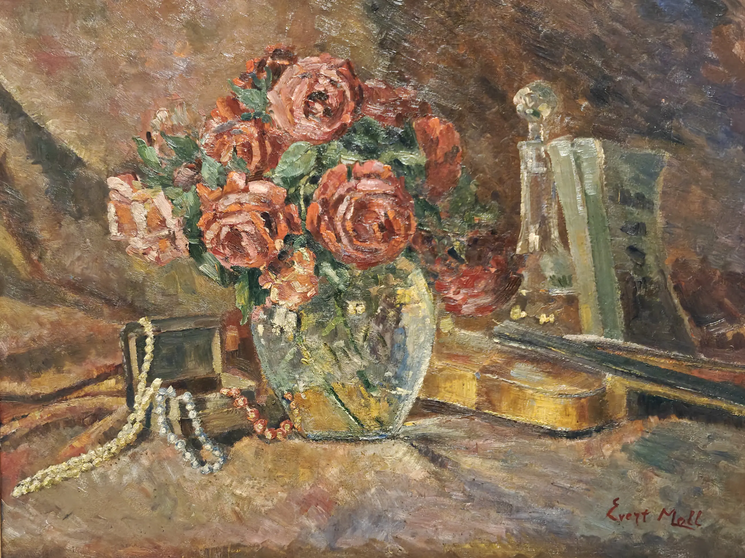 Mooi stilleven van Evert Moll, te zien is een vaas met rozen , een viool en sieraden. Er zit een mooie lijst omheen, de kleuren zijn fraai.