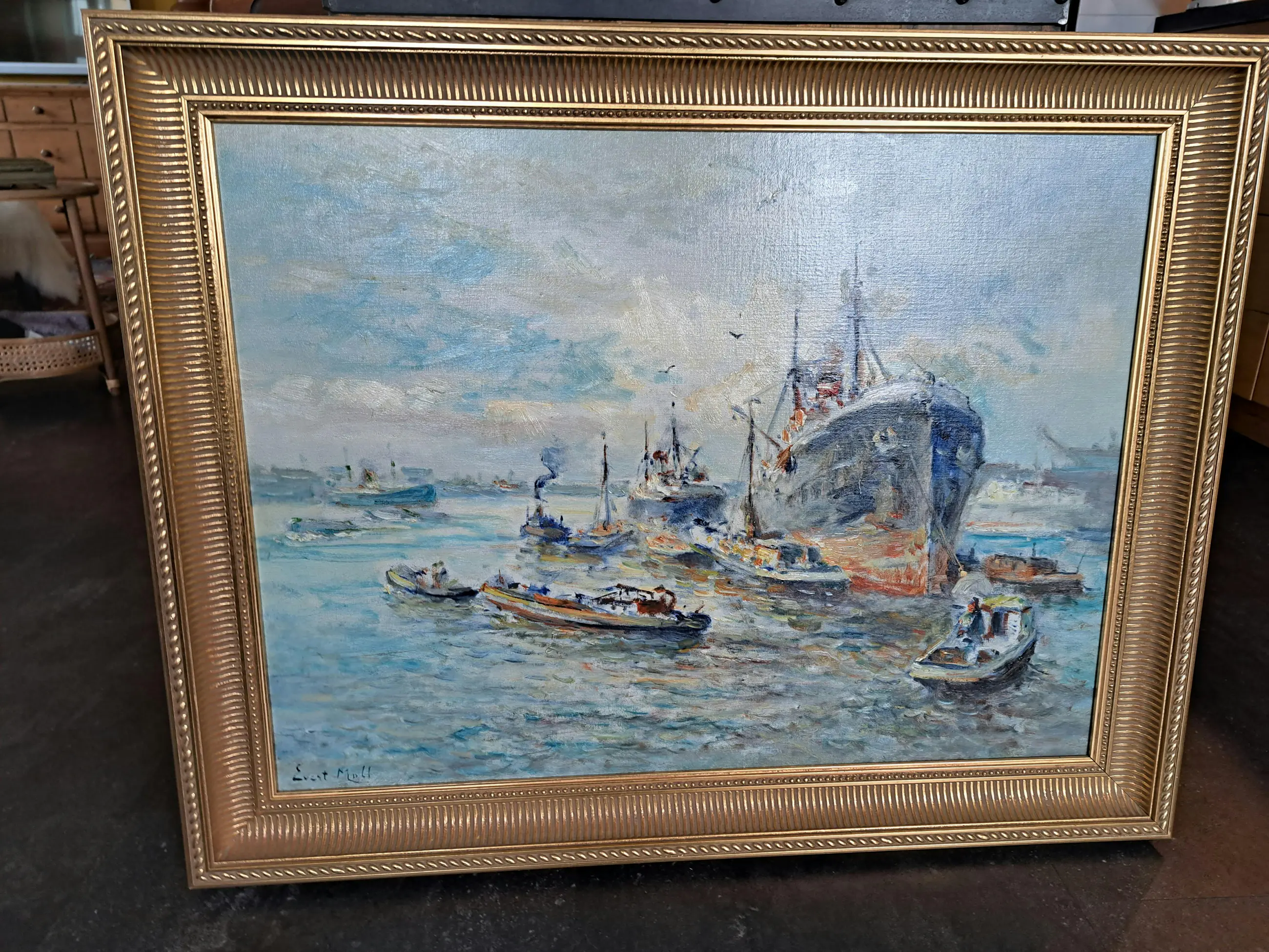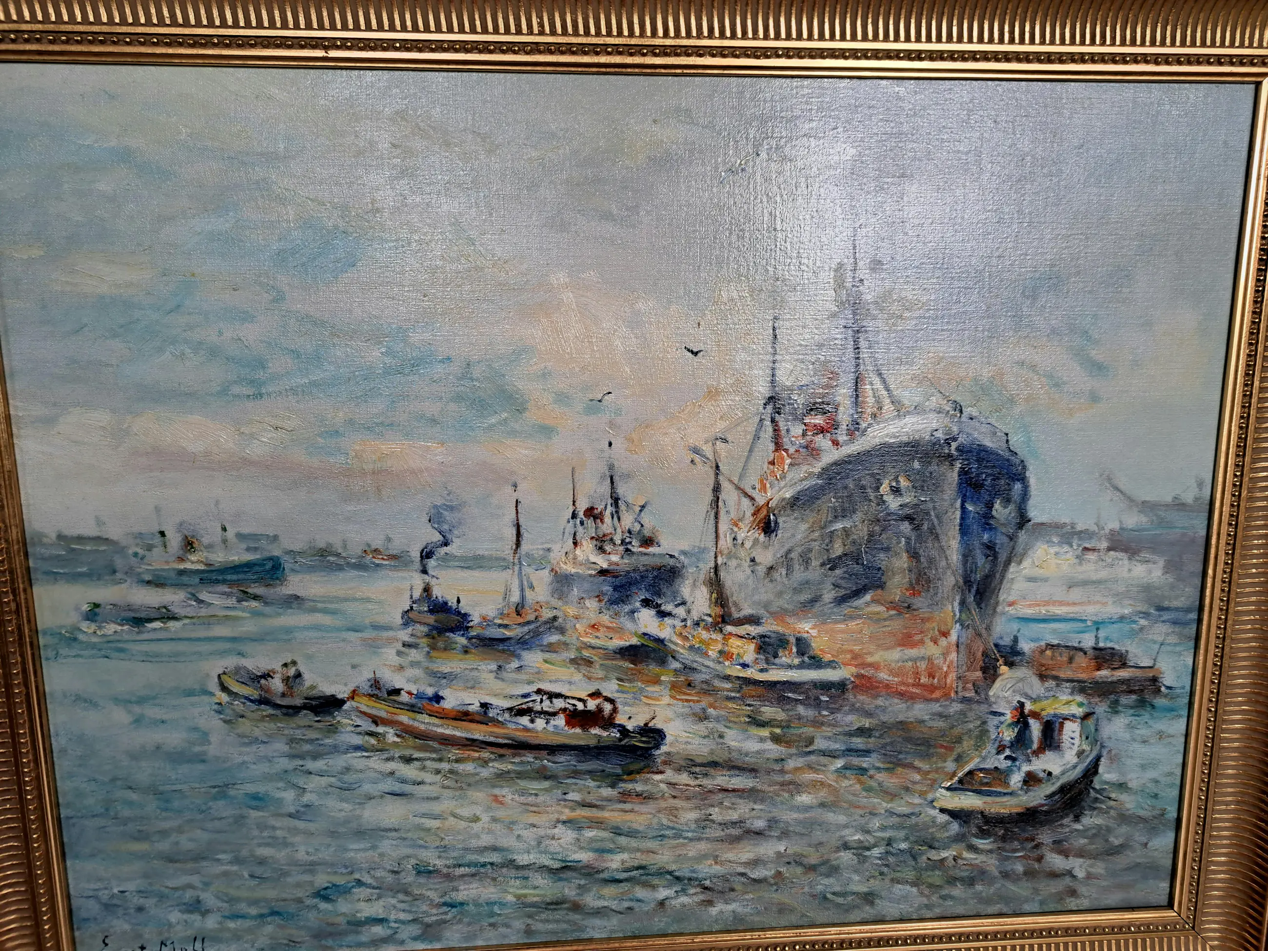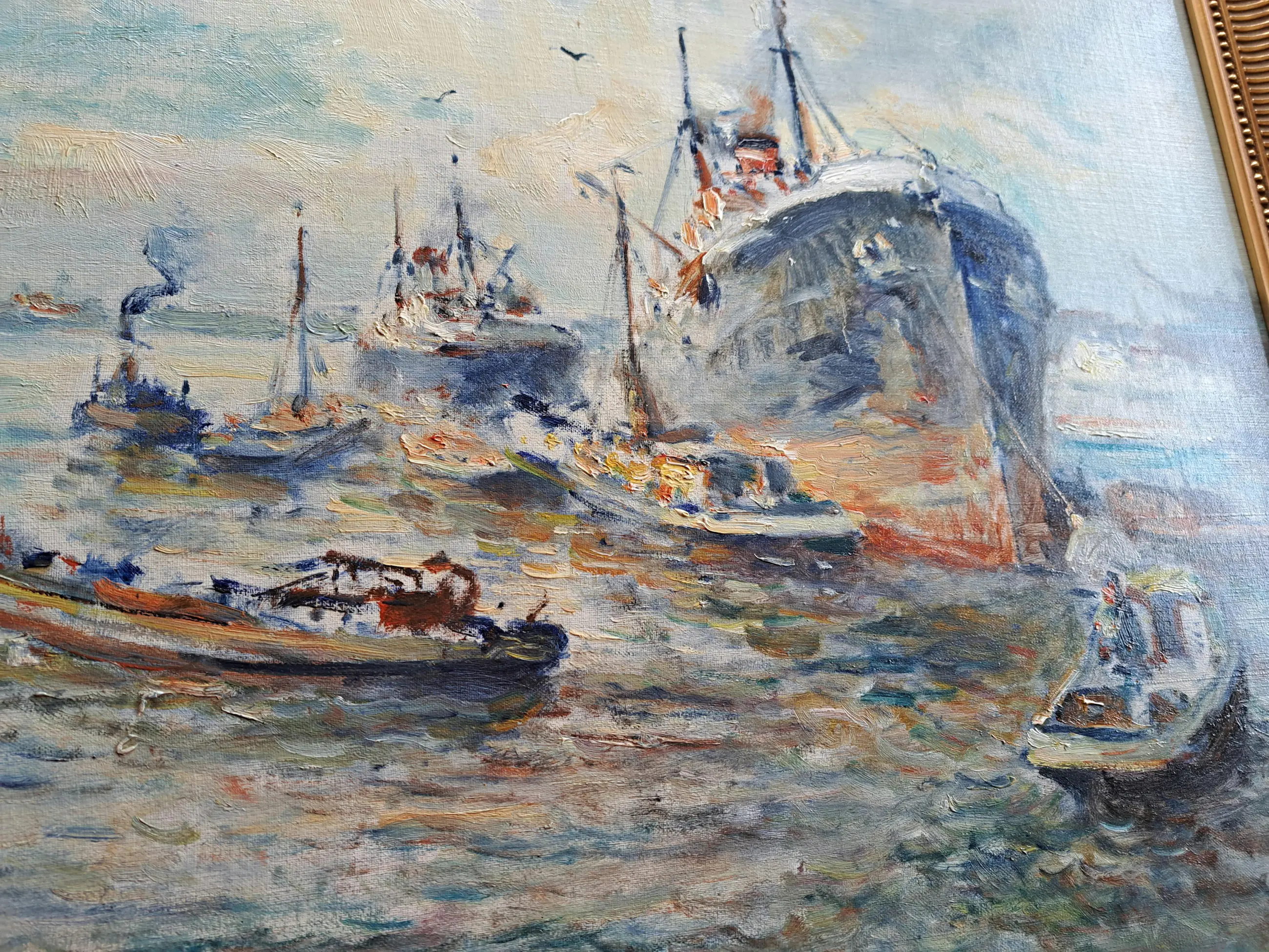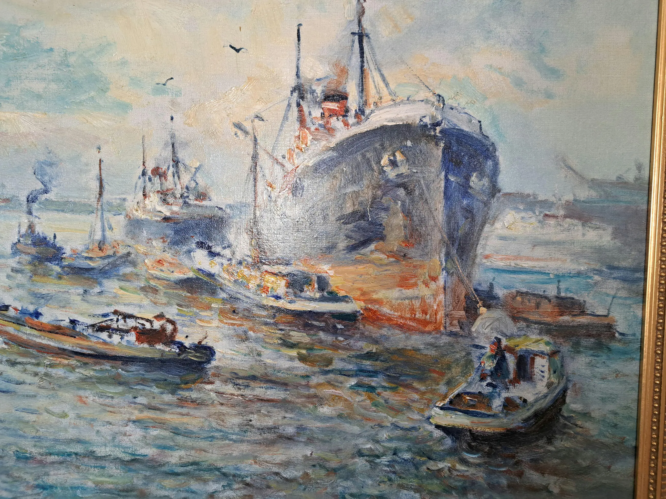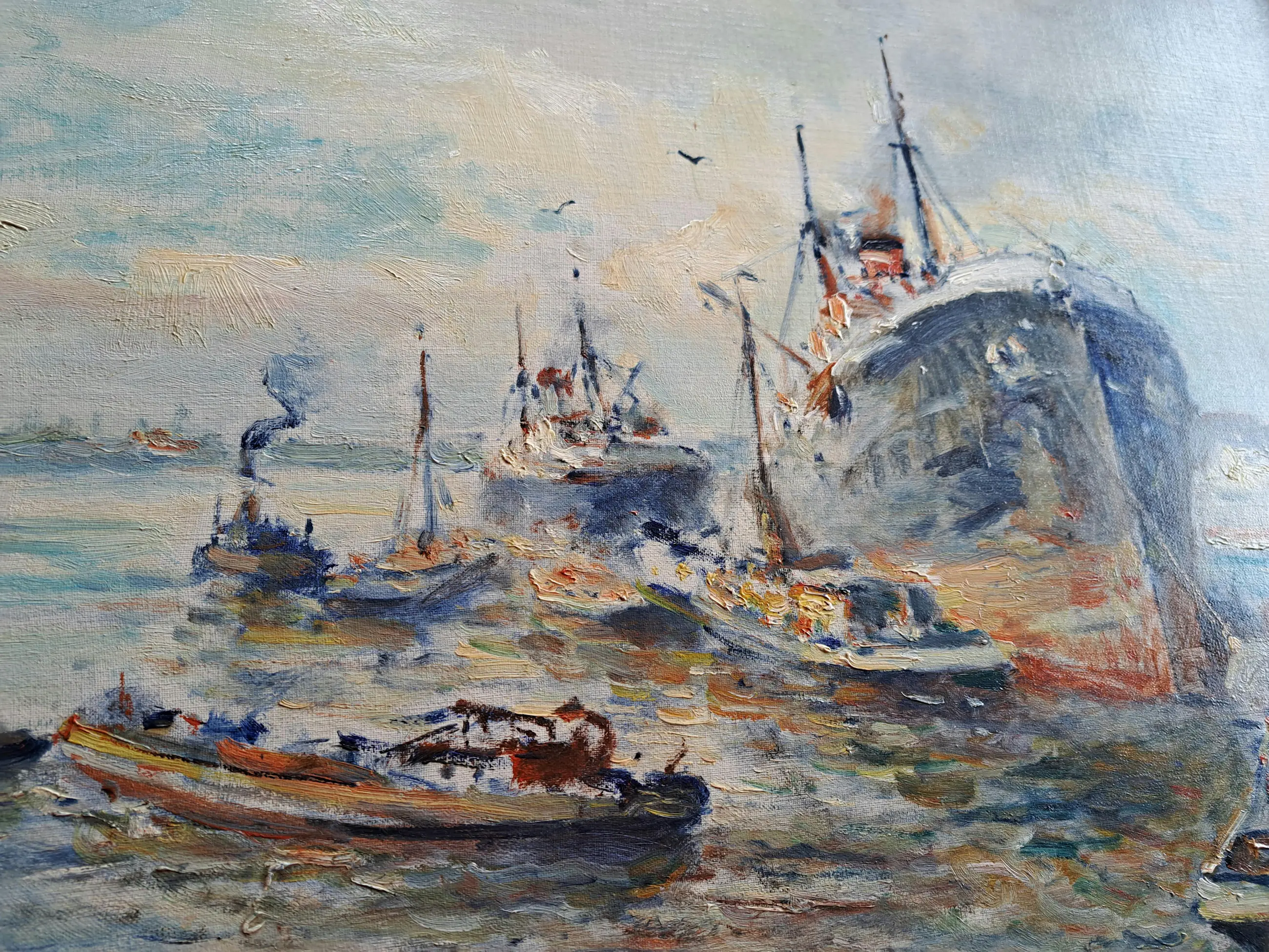 Het aangeboden schilderij laat een havengezicht (Rotterdam) zien met een zeer fraaie compositie en kleurgebruik. Het is absoluut een van zijn betere werken uit zijn oeuvre.