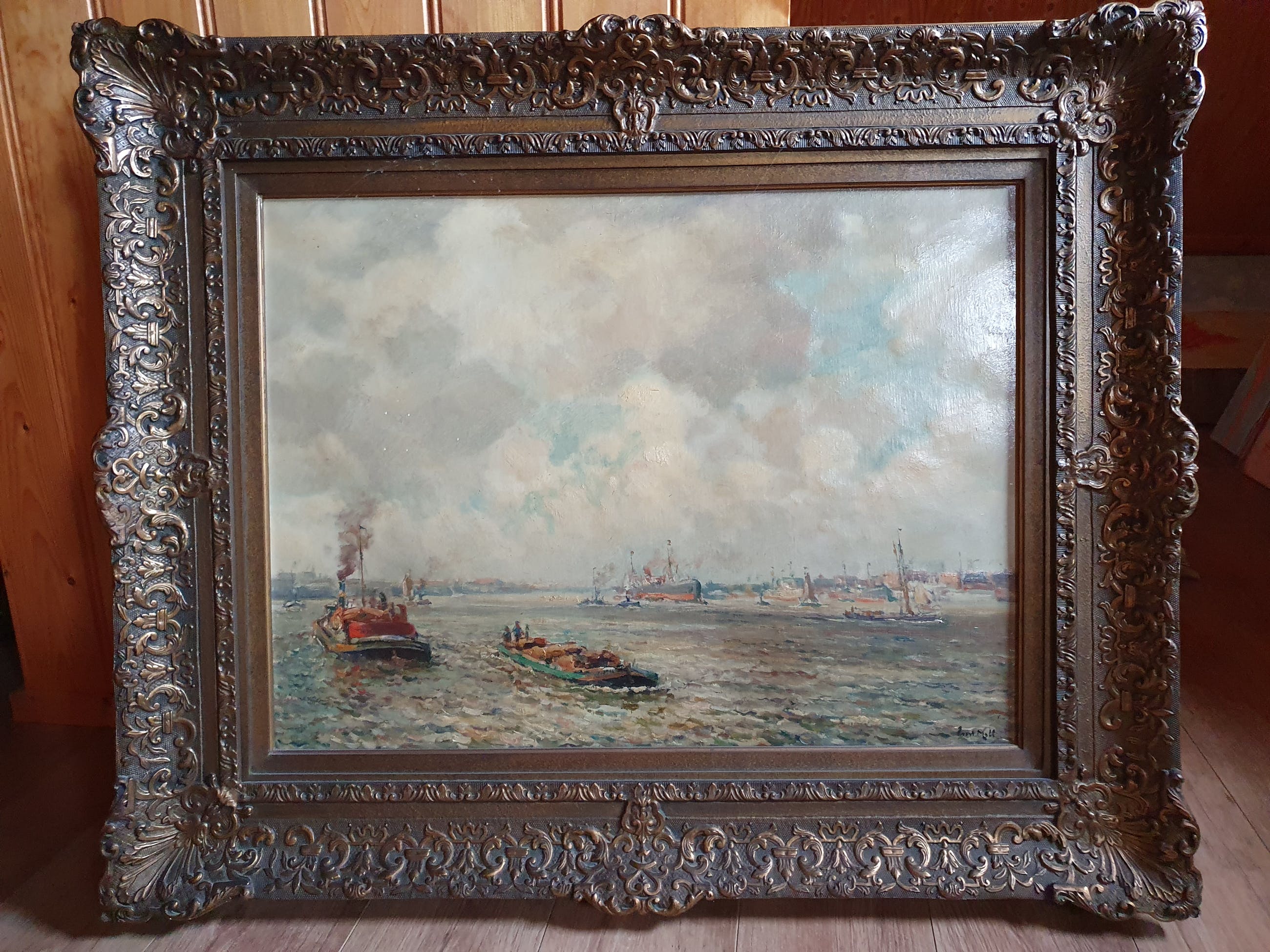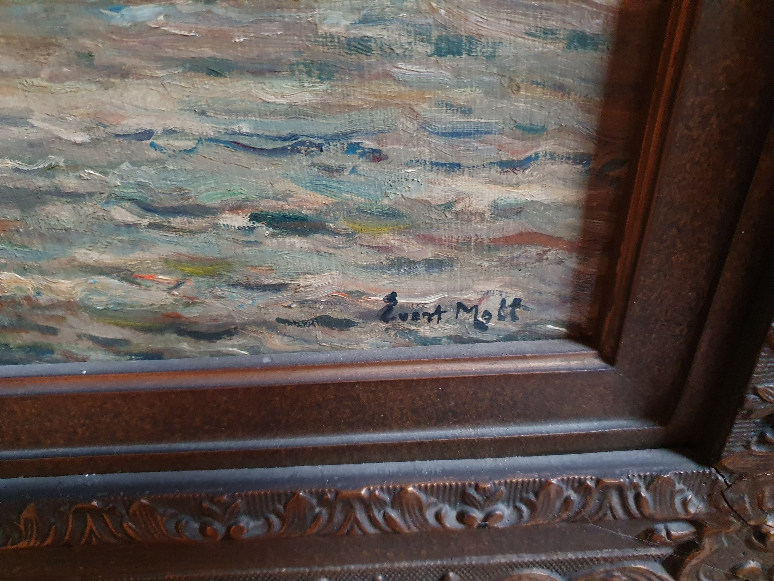 Evert Moll schilderde vooral voorstellingen van de Rotterdamse haven en de scheepvaart op de Nieuwe Maas. Hij schilderde in de jaren 20 en 30 van de vorige eeuw. Hij werd vooral geïnspireerd door de Haagse School. Dit schilderij is door Evert Moll rechts onder met de hand gesigneerd.