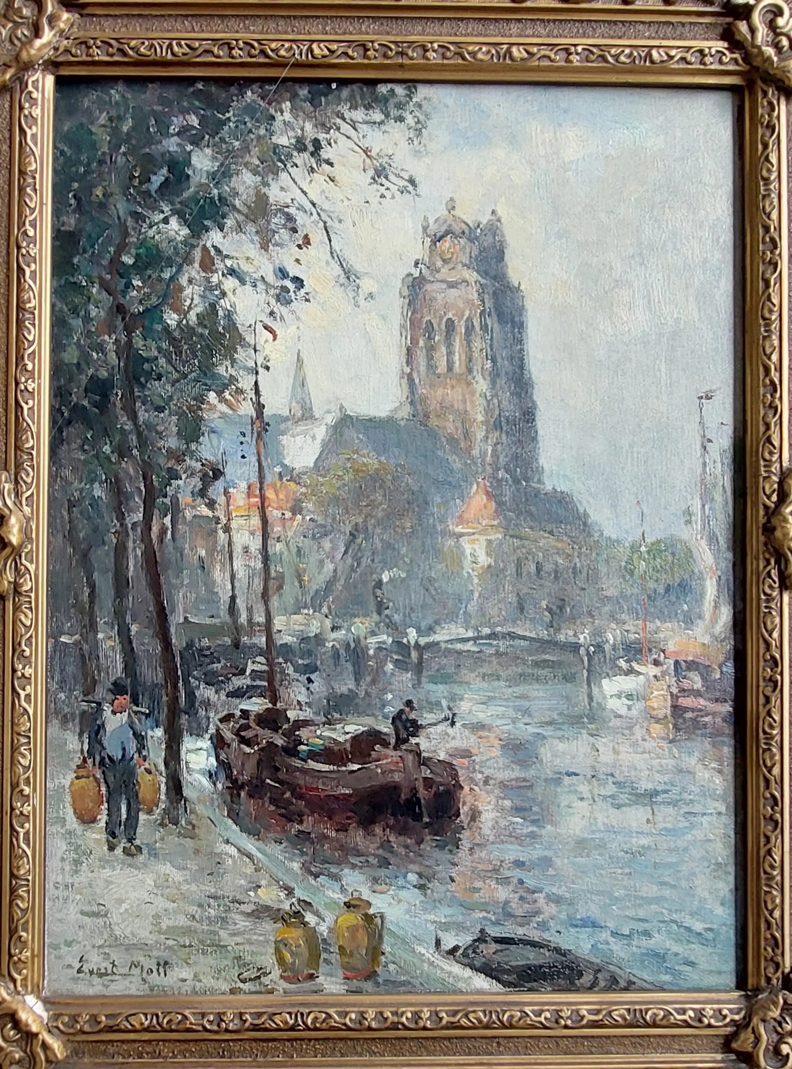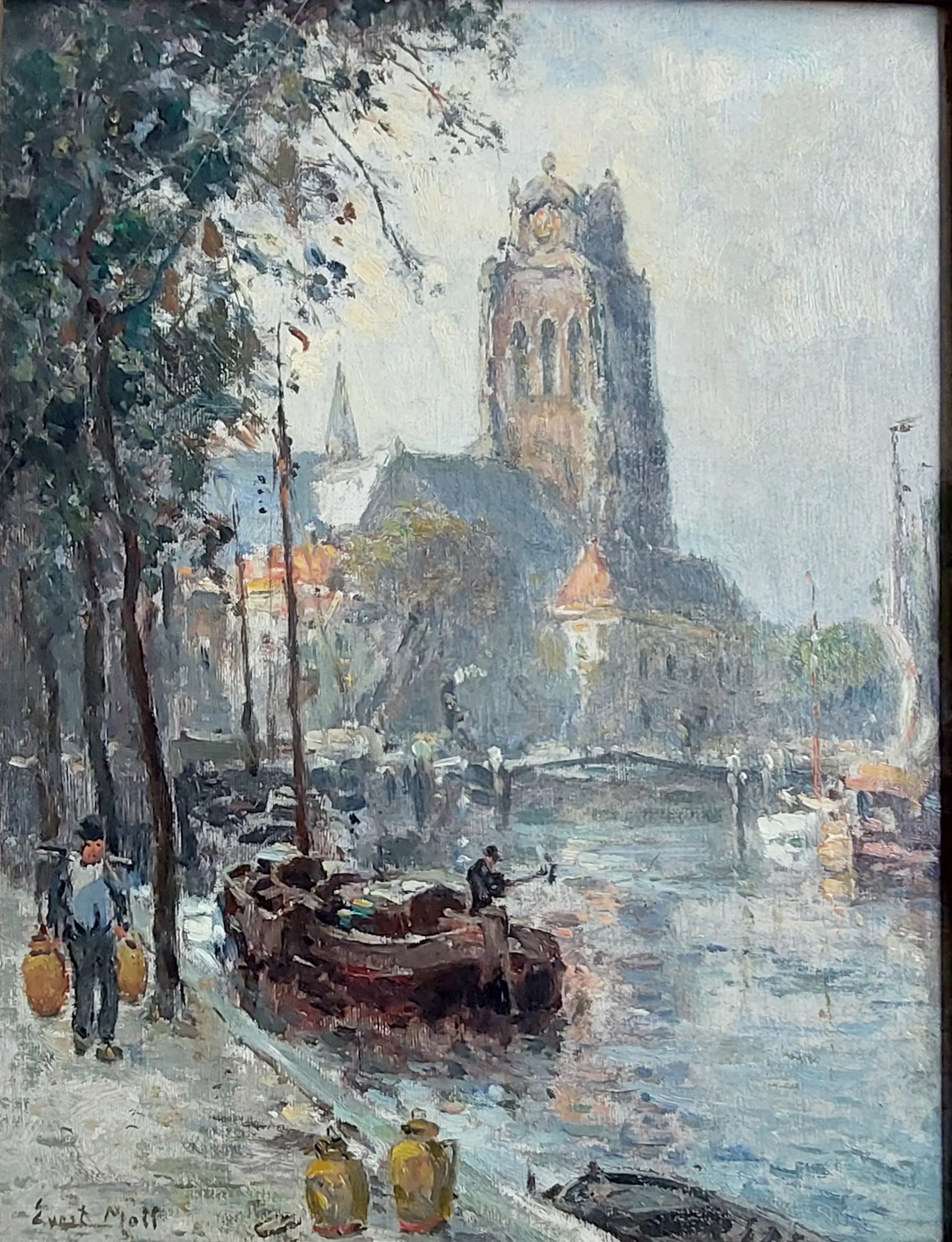 Zicht op de St. Laurenskerk - Rotterdamse binnen haven Olieverf op doek Gesigneerd linksonder Afmeting is bij benadering