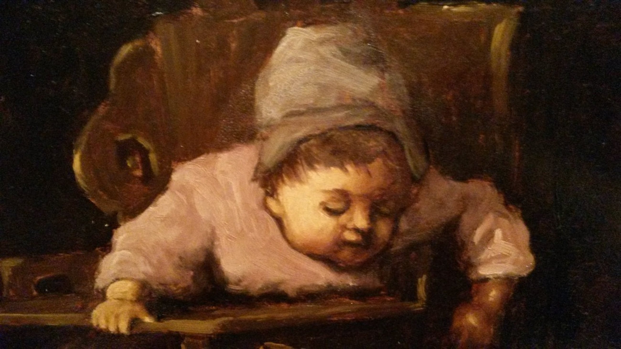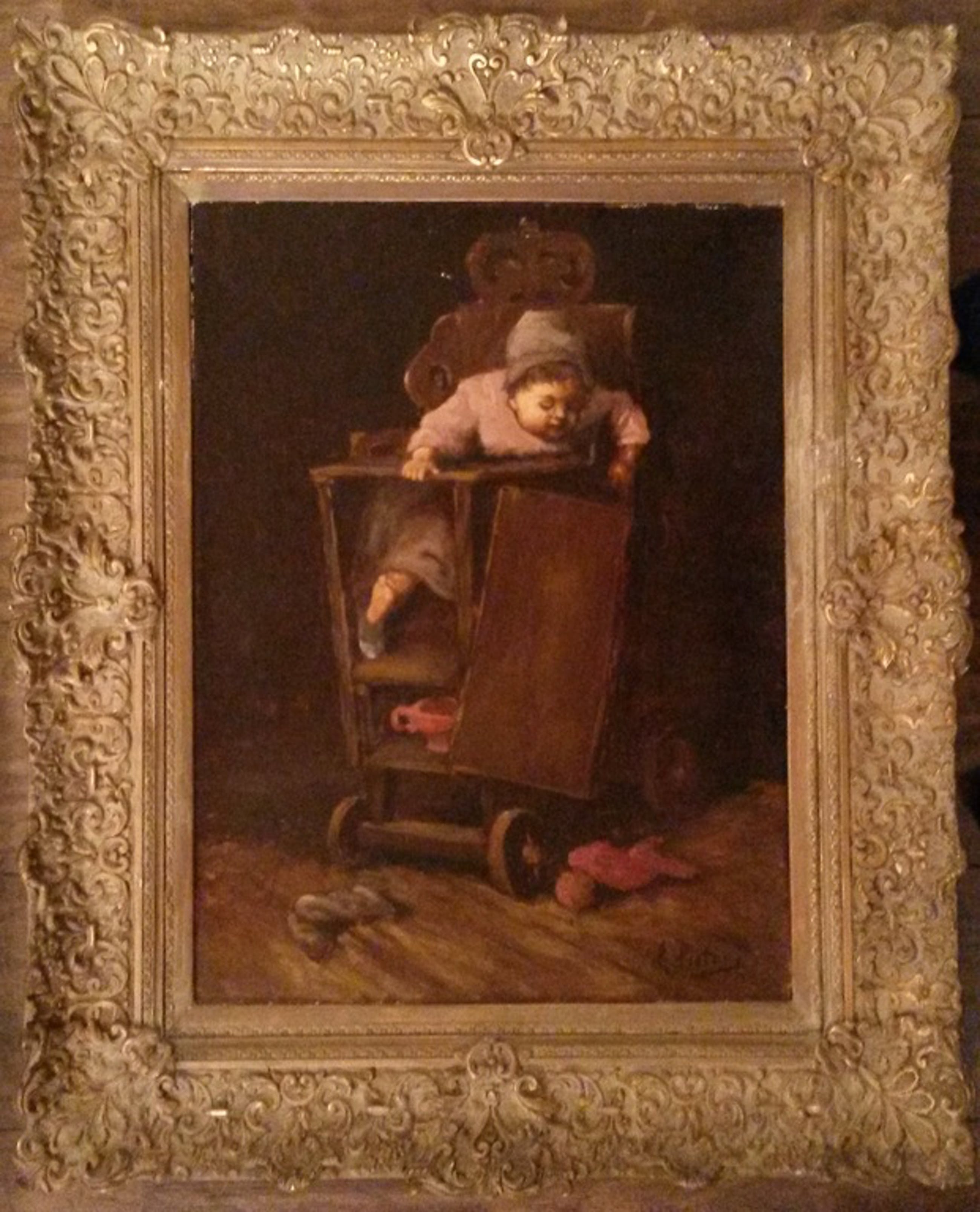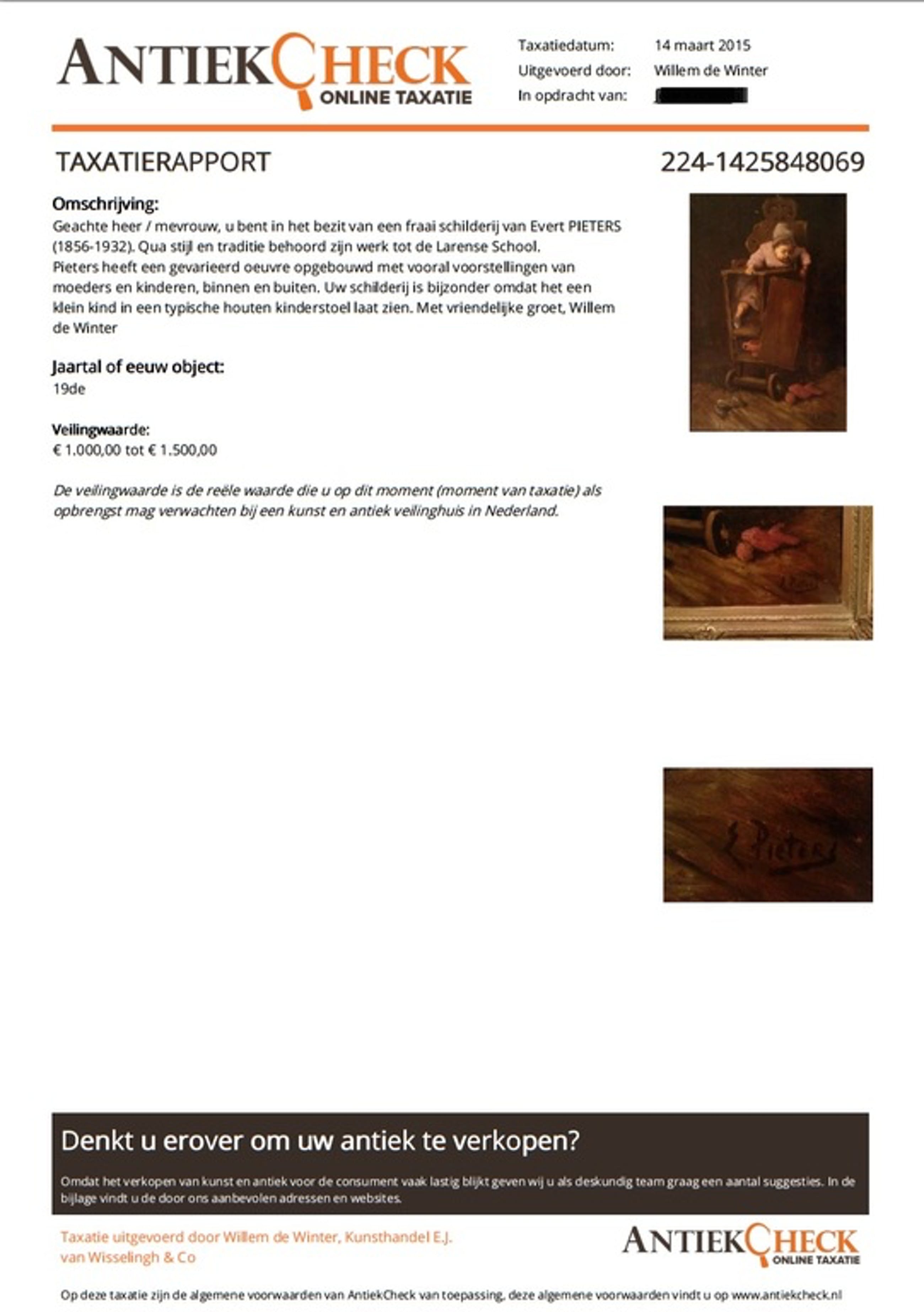 Geachte heer / mevrouw, u bent in het bezit van een fraai schilderij van Evert PIETERS (1856-1932). Qua stijl en traditie behoord zijn werk tot de Larense School. Pieters heeft een gevarieerd oeuvre opgebouwd met vooral voorstellingen van moeders en kinderen, binnen en buiten. Uw schilderij is bijzonder omdat het een klein kind in een typische houten kinderstoel laat zien. Met vriendelijke groet, Willem de Winter