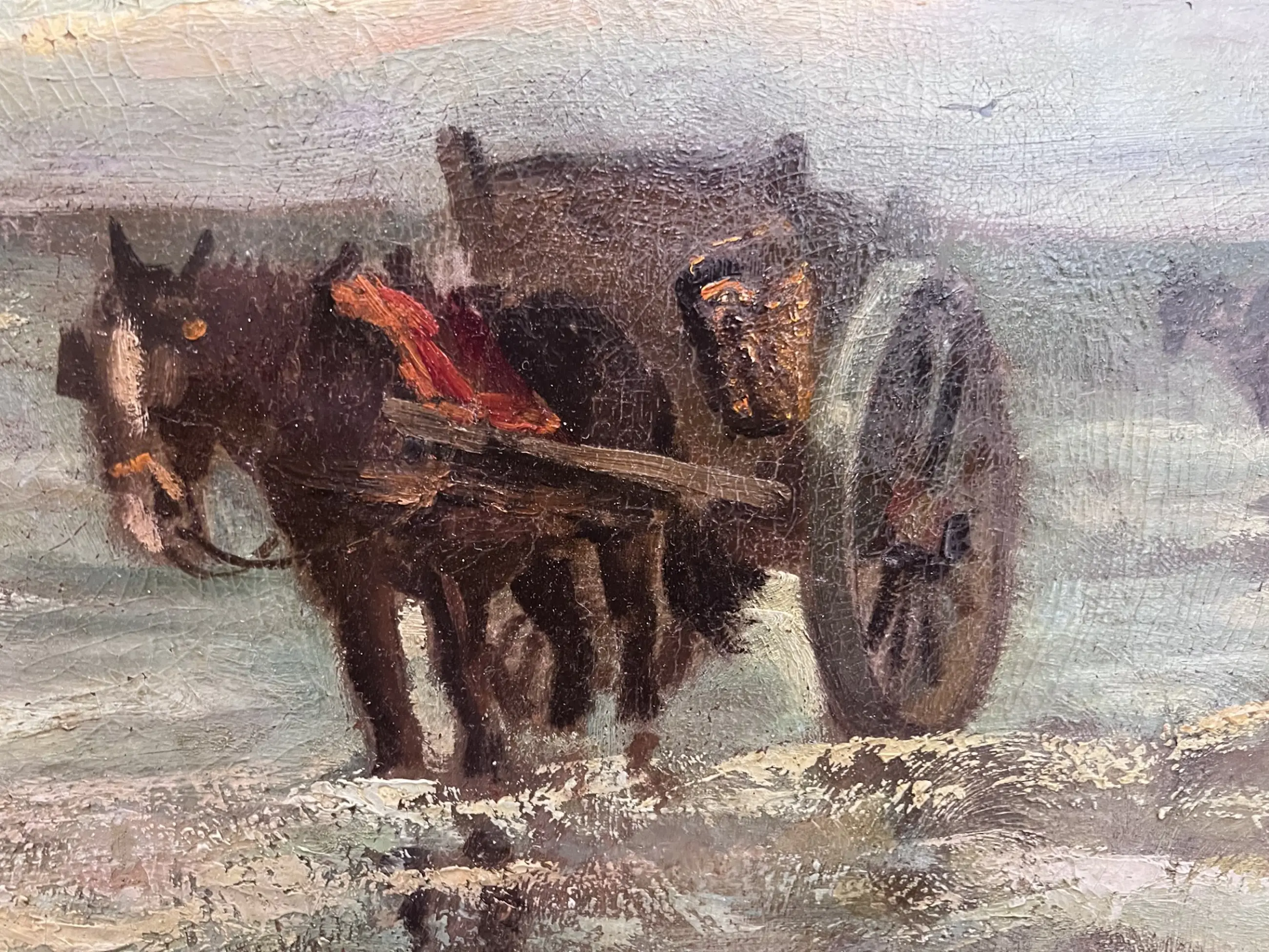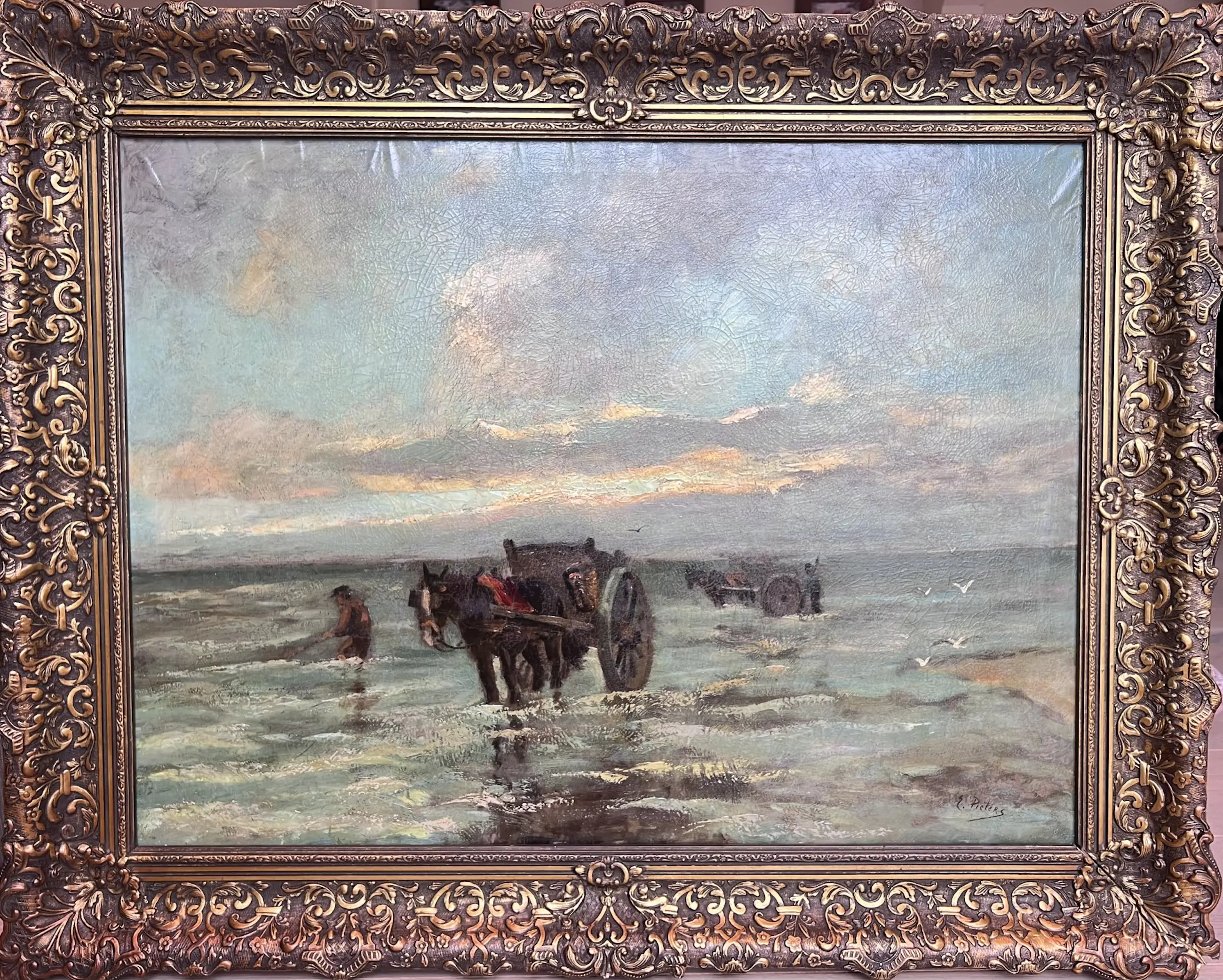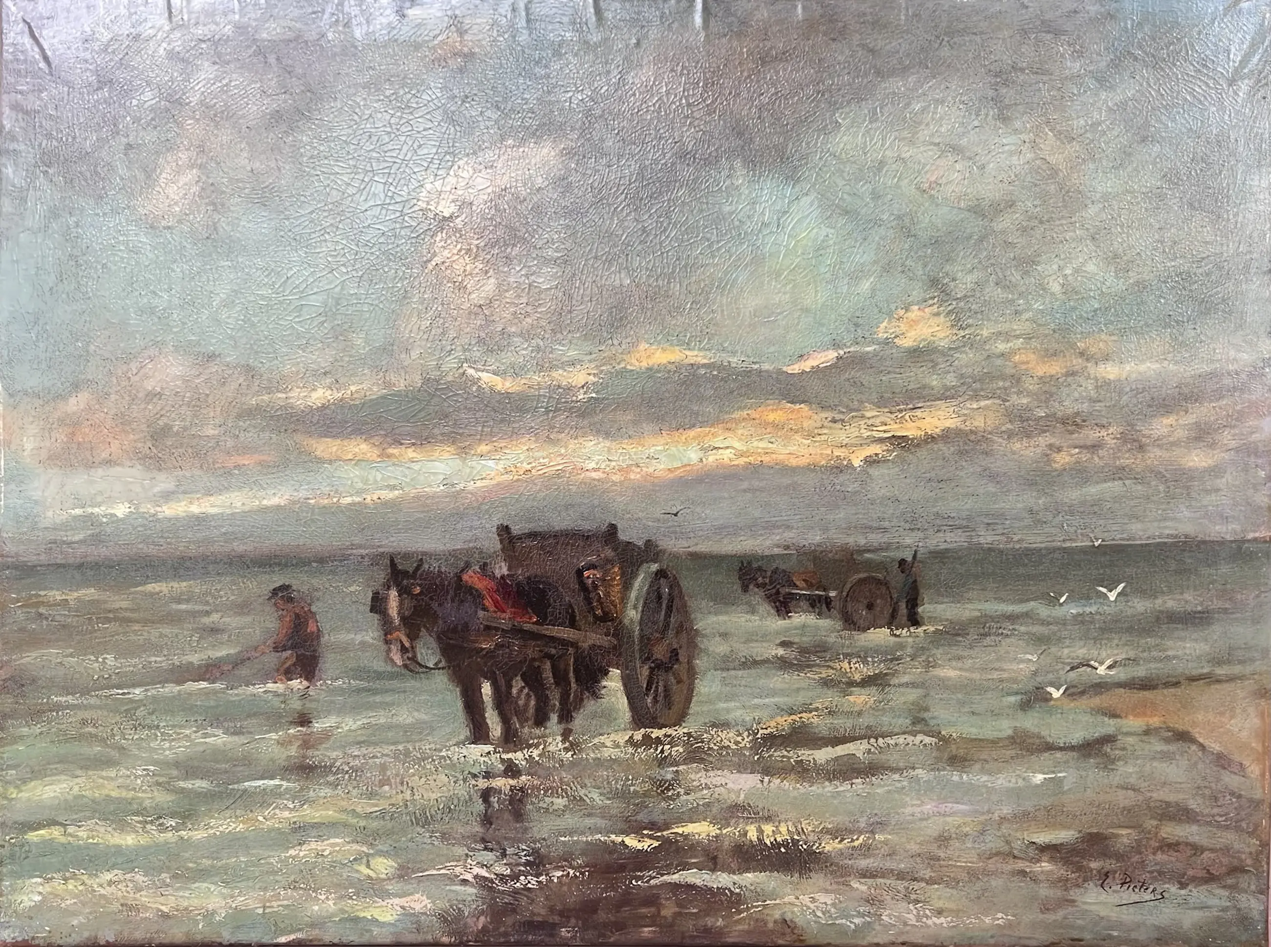 Prachtig en sfeervol kusttafereel van de bekende Nederlandse schilder Evert Pieters (1856–1932), met een zeldzame weergave van de traditionele handmatige garnalenvisserij aan de Noordzee. Pieters legt hier een iconisch stukje Nederlands maritiem erfgoed vast: vissers die door de ondiepe branding waden, begeleid door een krachtig werkpaard en kar — een harmonieuze en poëtische combinatie van licht, arbeid en landschap.