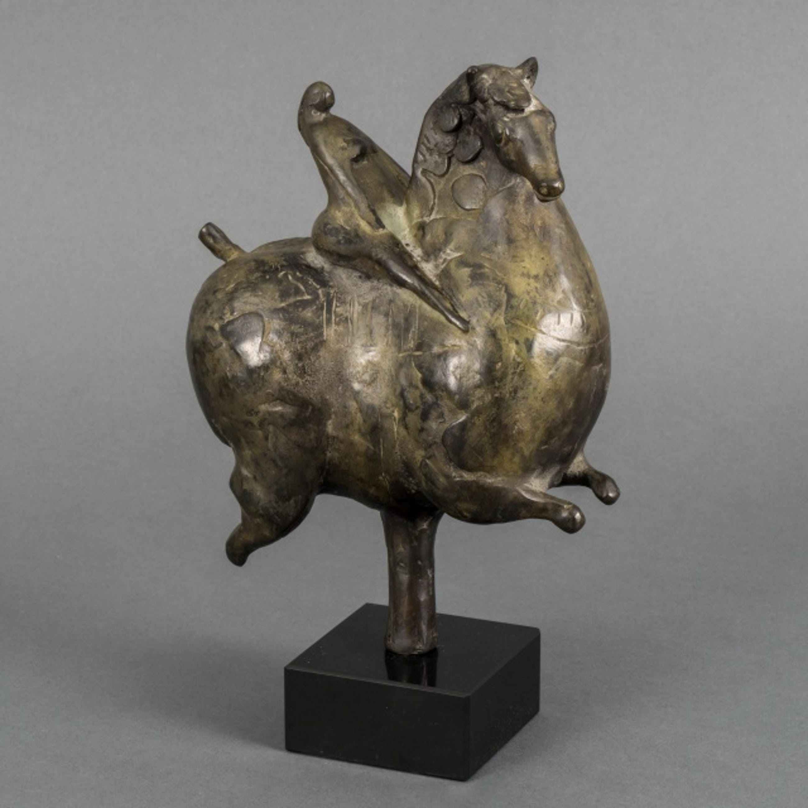 Prachtig bronzen beeld op zwart stenen basement van Evert van Hemert. Titel: Ochtend rit. Het werk is gesigneerd.