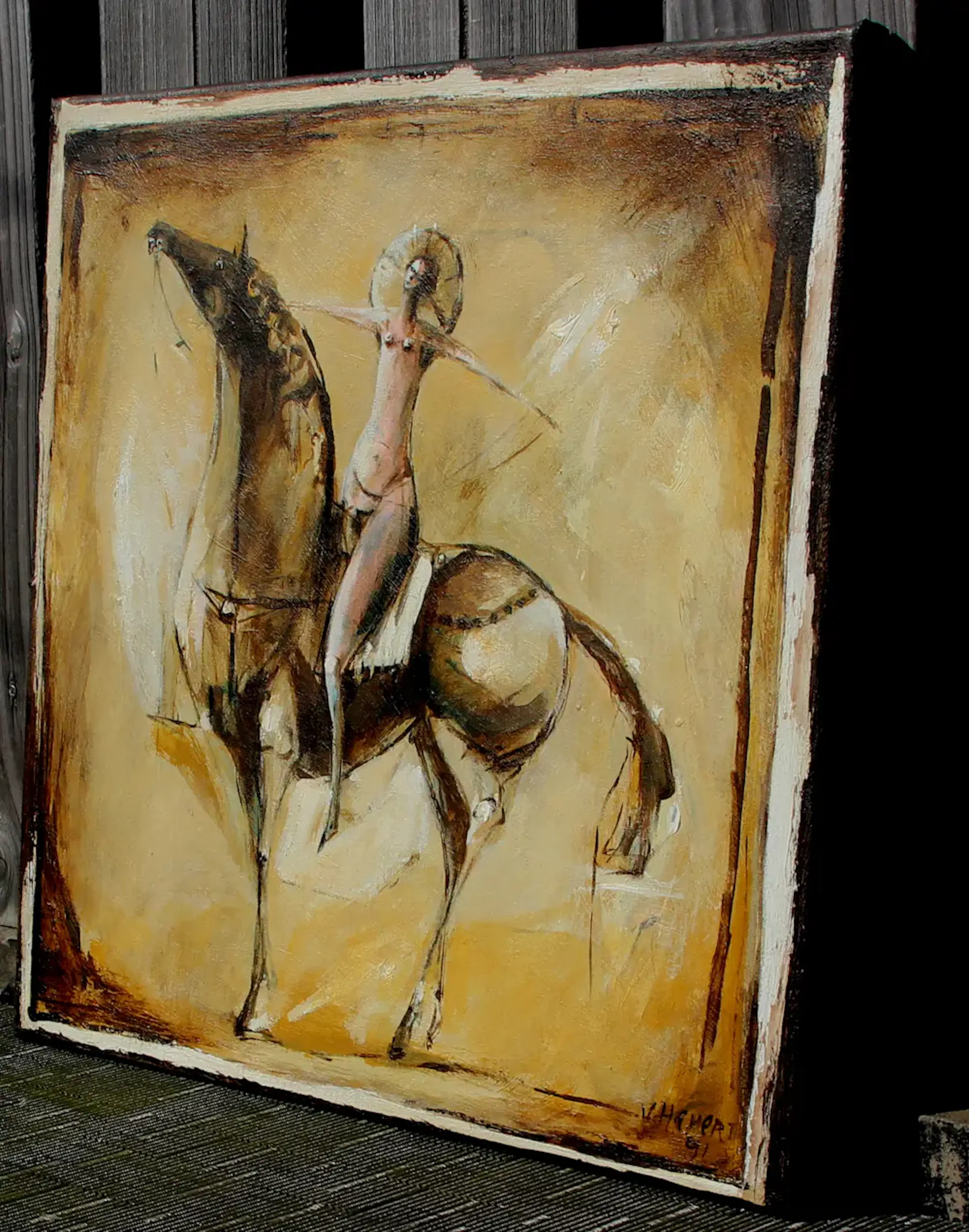 Olieverf op doek met Evert van Hemert. Jaar: 1991. Voorstelling van een naakte dame op een paard. Afmetingen doek: H50 x b50cm. Het werk is rechts onderaan gesigneerd door de kunstenaar. De authenticiteit van het aangeboden werk wordt volledig gegarandeerd. Een certificaat van echtheid kan, op aanvraag, worden gemaild.