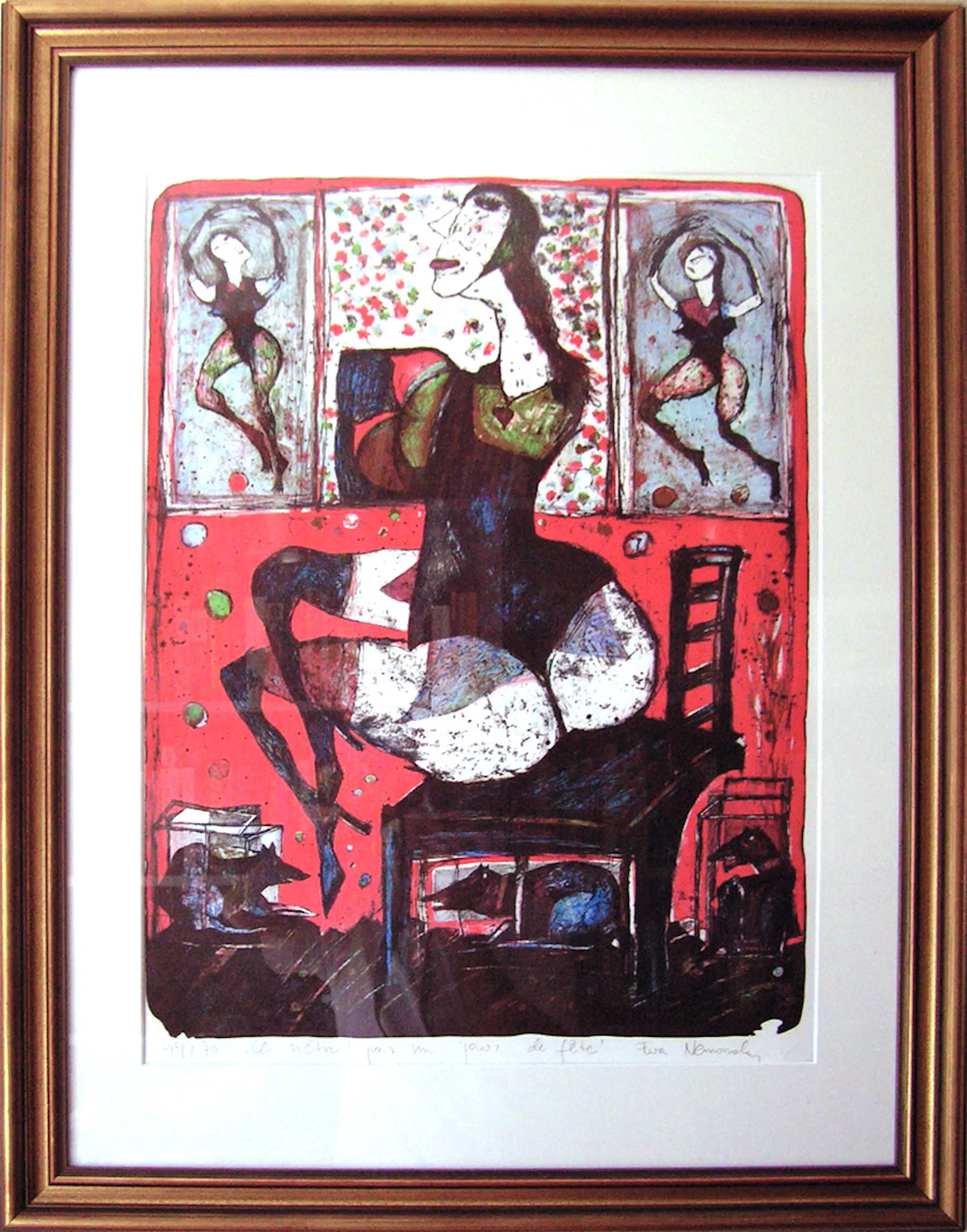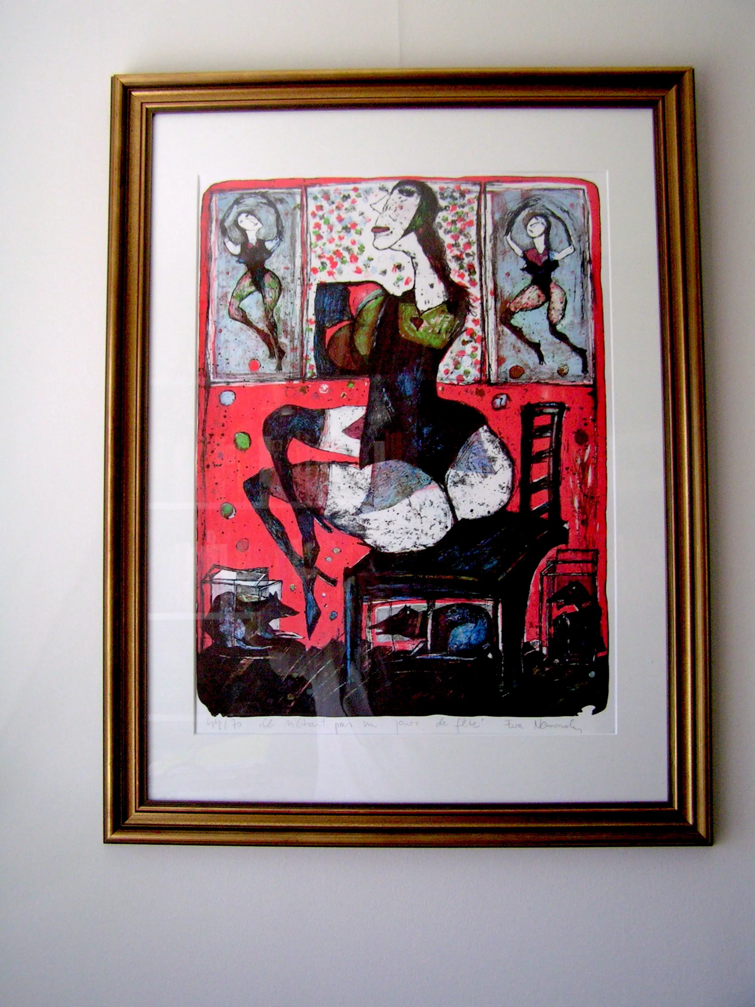 "... The oeuvre of painter, printmaker, as well as fashion and costume designer Ewa Nemoudry is well rooted in her studies at UMPRUM in Prague under the world-renowned scenographer Josef Svoboda. Her images, whether acrylics, watercolours, collages or lithographs, present figurative compositions displaying poetic scenes, outlined by distinctive, simplifying handwriting that resembles children's cut-outs. Ewa's vivid imagination celebrates everyday life in symbiosis with the world of dreams.