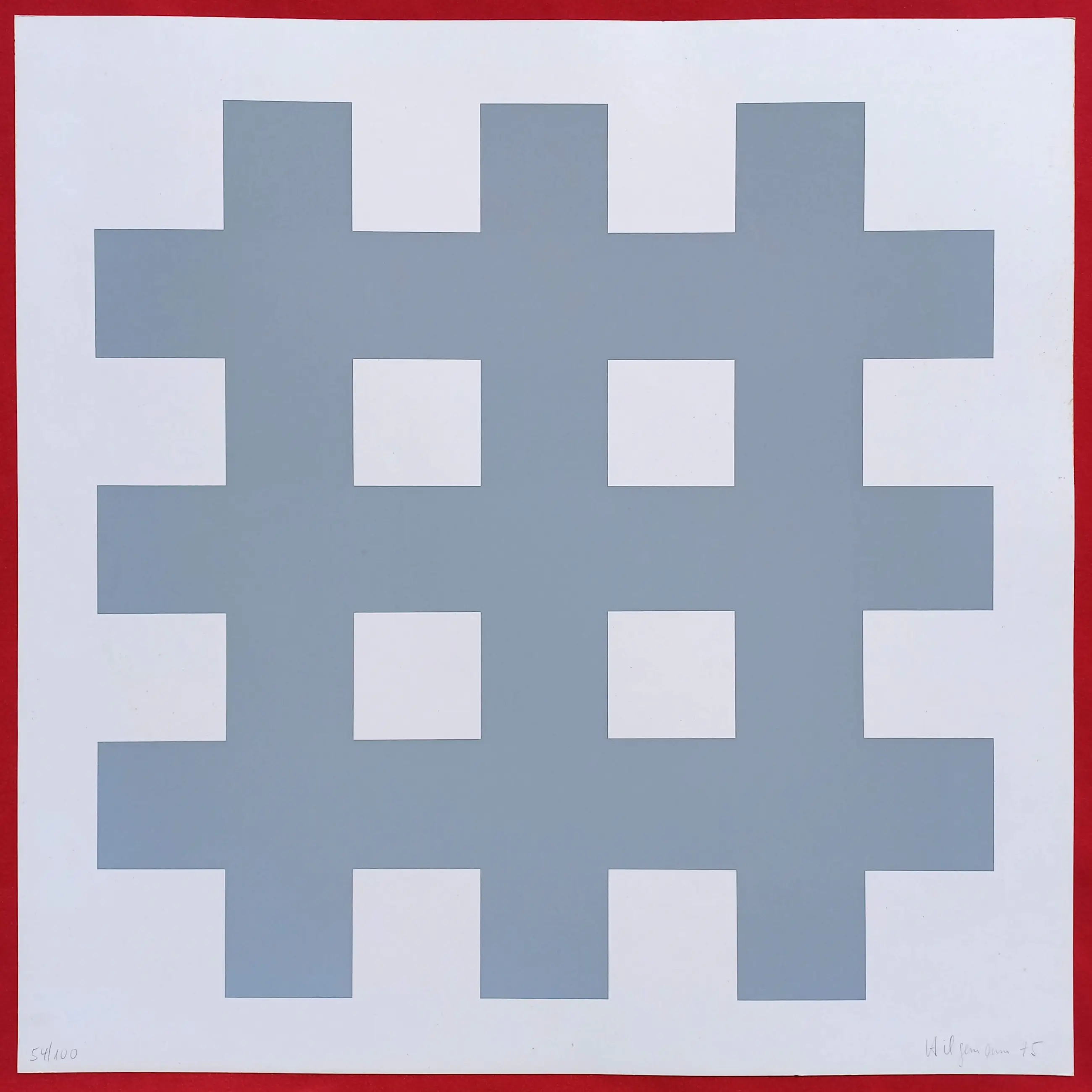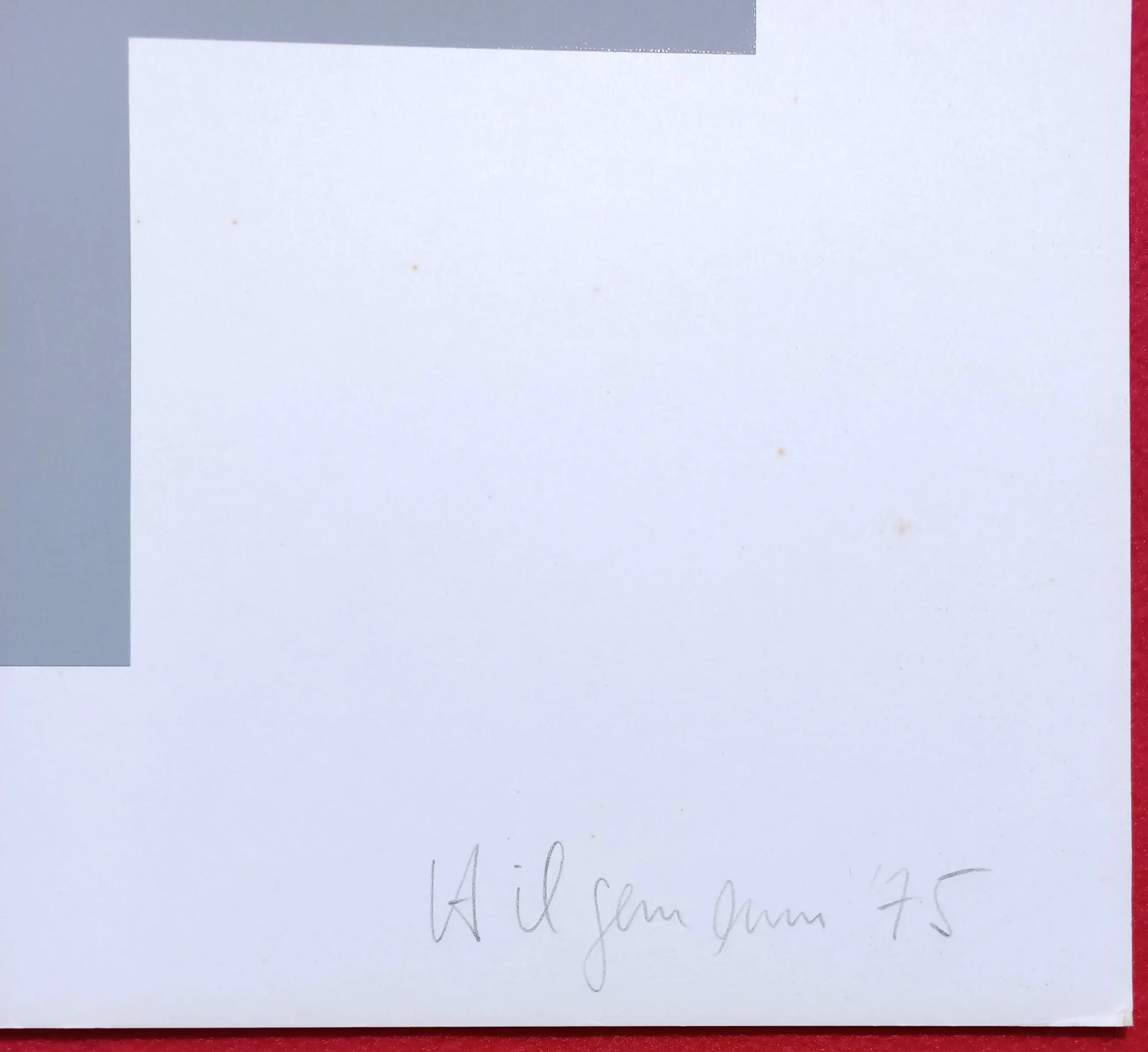 Prachtig geometrisch werk van Ewerdt Hilgemann. Zeefdruk op zeer dik papier, met potlood gesigneerd, gedateerd (‘75) en genummerd (54/100). In goede conditie.