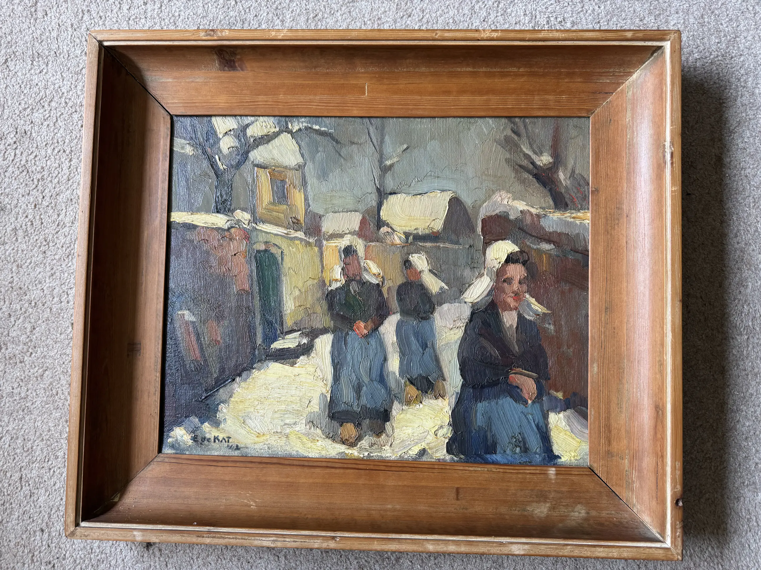 Een mooi uiterst krachtig werk van de meisjes in klederdracht op de kinderkoppen in het straatje achter de kade in Veere bij het stadhuis. Het schilderij is in prima staat en ingekaderd met een eenvoudige lijst. Links onderaan gesigneerd.