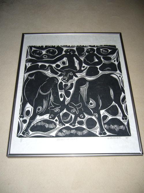 HOLZSCHNITT IN MATTSILBER-RAMEN CA. 34 x 41 CM GLASSCHEIBE UNTEN GERING GESPLITTERT, RAHMEN MIT KLEINER DELLE. VERMUTLICH IST DER RAHMEN AUF DIE UNTERE RECHTE ECKE GEFALLEN. GERINGE BRÄUNLICHE FARBNUANCEN DES MATERIALS MÖGLICHERWEISE DURCH SONNENLICHT. NUR 1 EINZIGER ABDRUCK VOM HOLZSTOCK ! MIT BLEISTIFT BEZEICHNET, DATIERT UND SIGNIERT 1/1 ,BULL-FIGHT' E. MADIBA '87