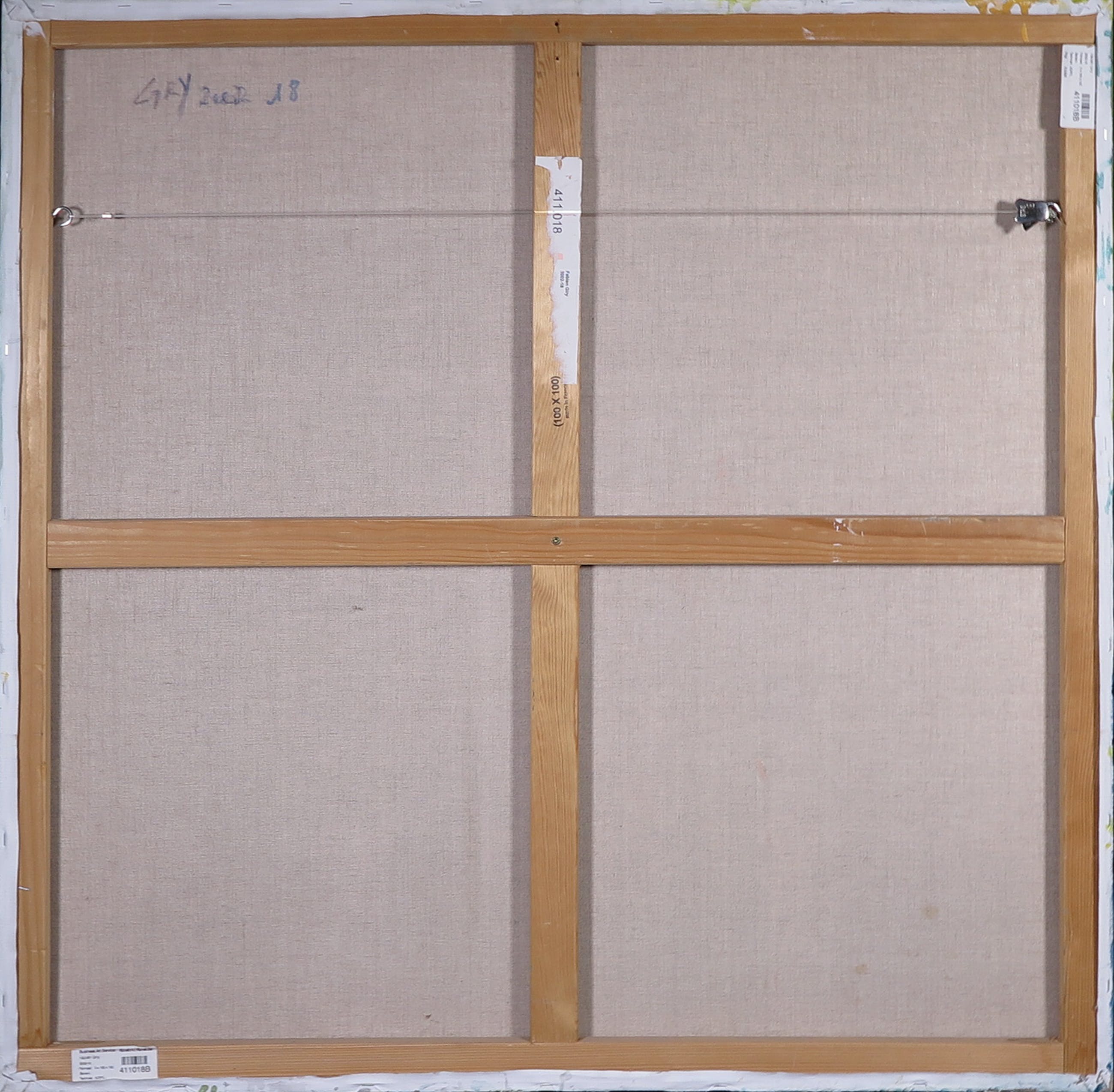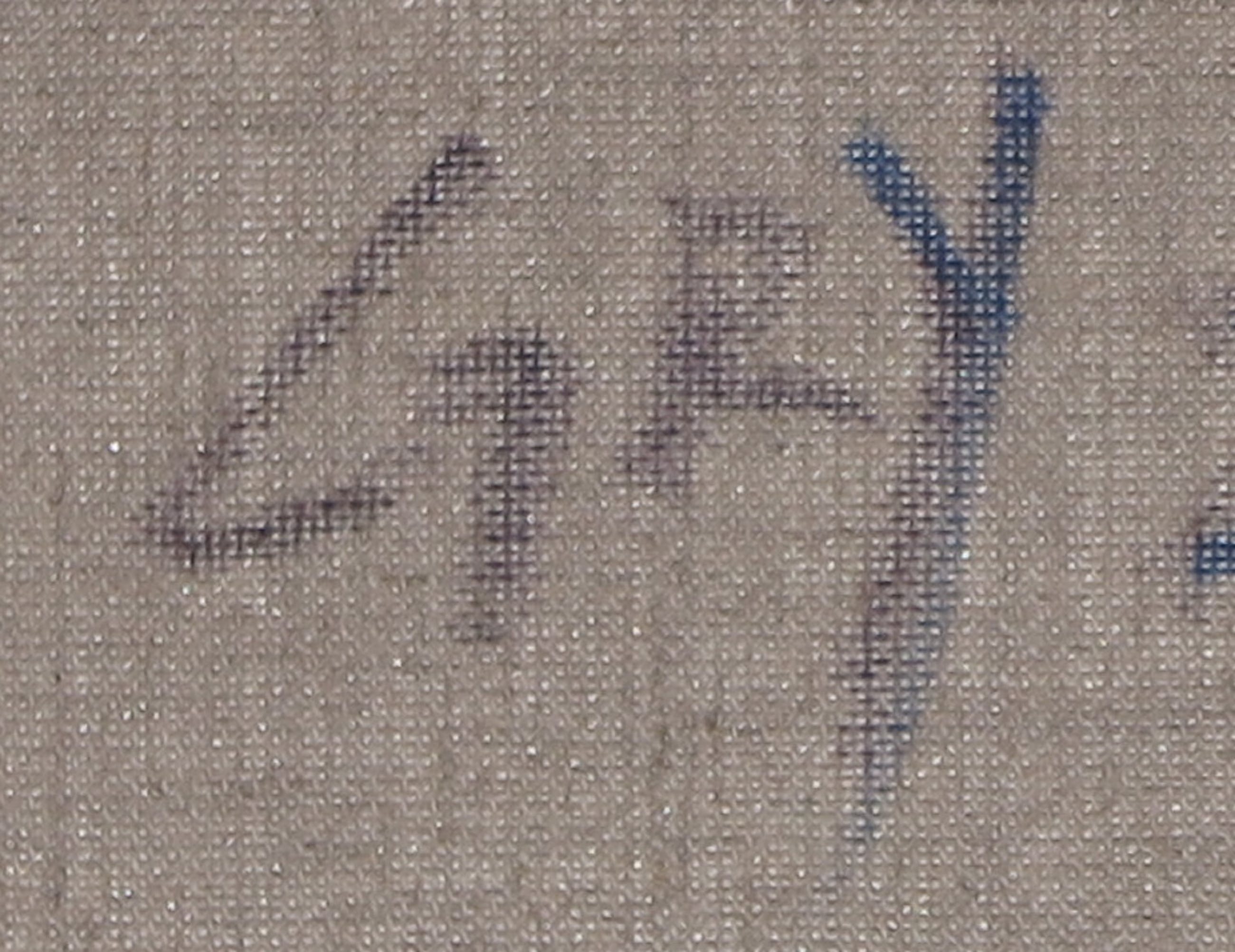 | Hier en daar gebruikersbeschadigingen en rechts onderin zit het doek niet meer netjes om het spieraam heen. | |