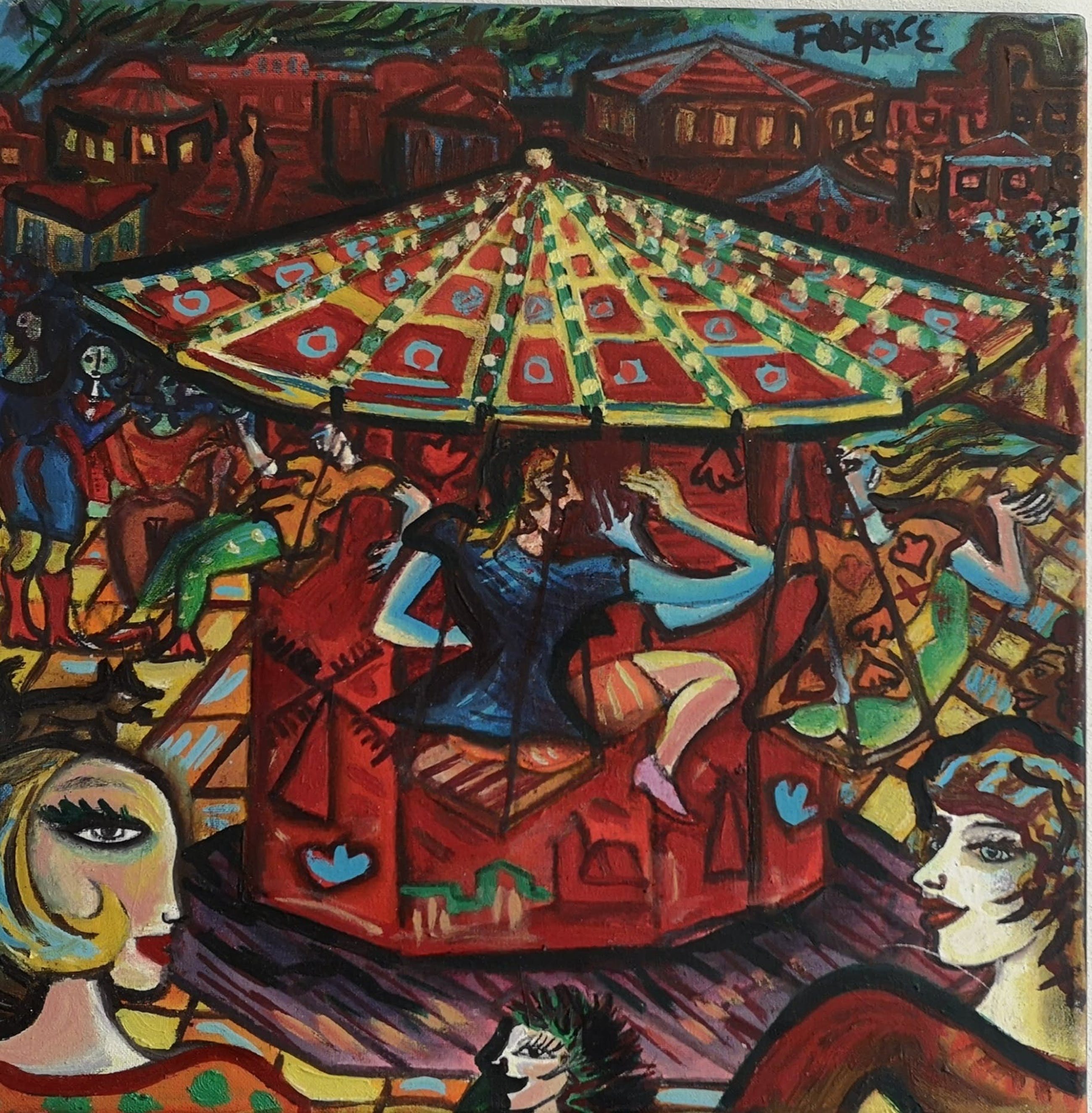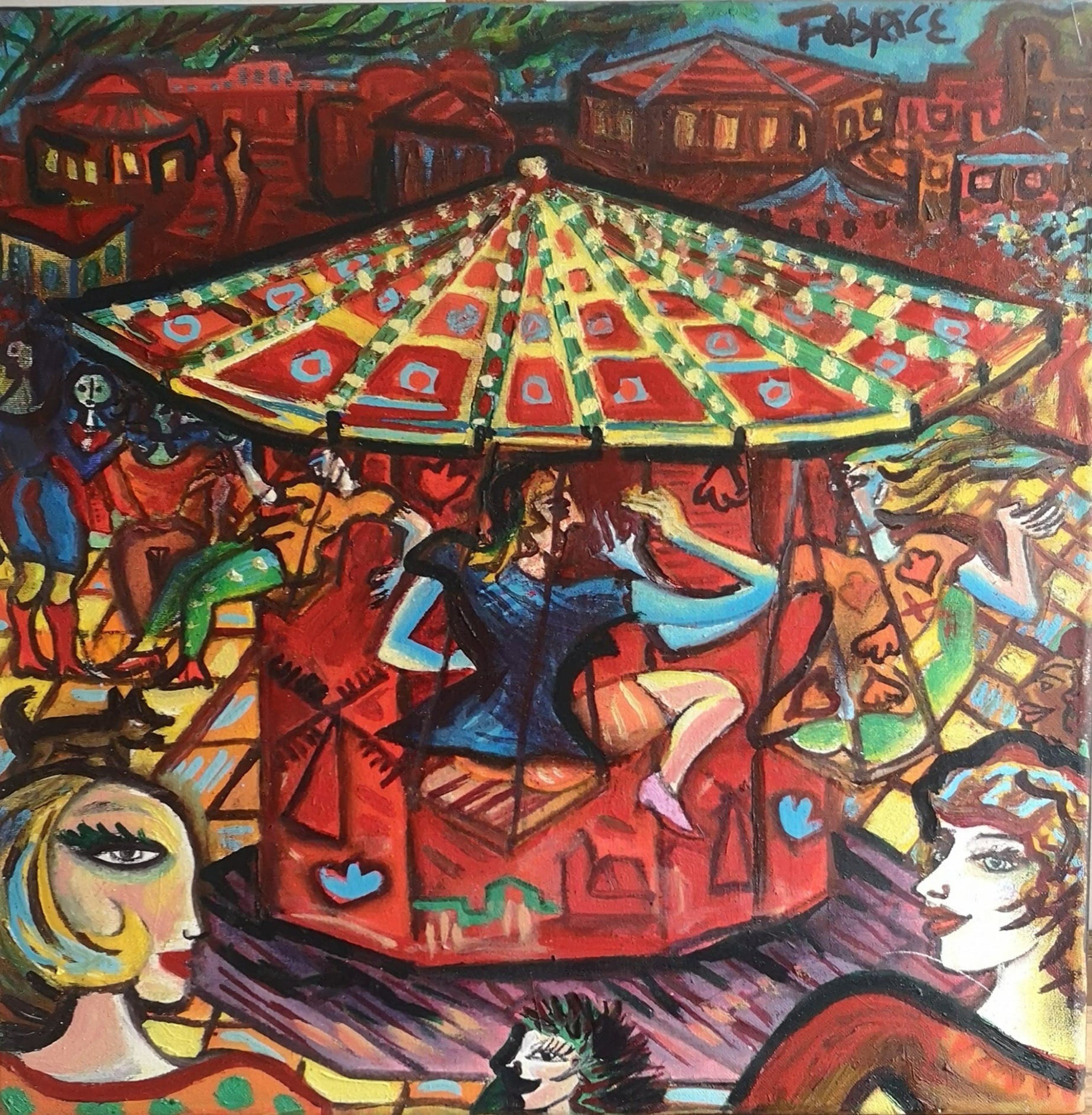 Dit werk van Fabrice Hund omschrijft hijzelf als de maalstroom van de wereld met al zijn gekkigheid. Herkenbare figuren zijn de vrouwen in zijn werk, altijd druk in het leven. Gesigneerd en gedateerd op achterzijde en voorzijde. Zelf vvan kunstenaar gekocht.