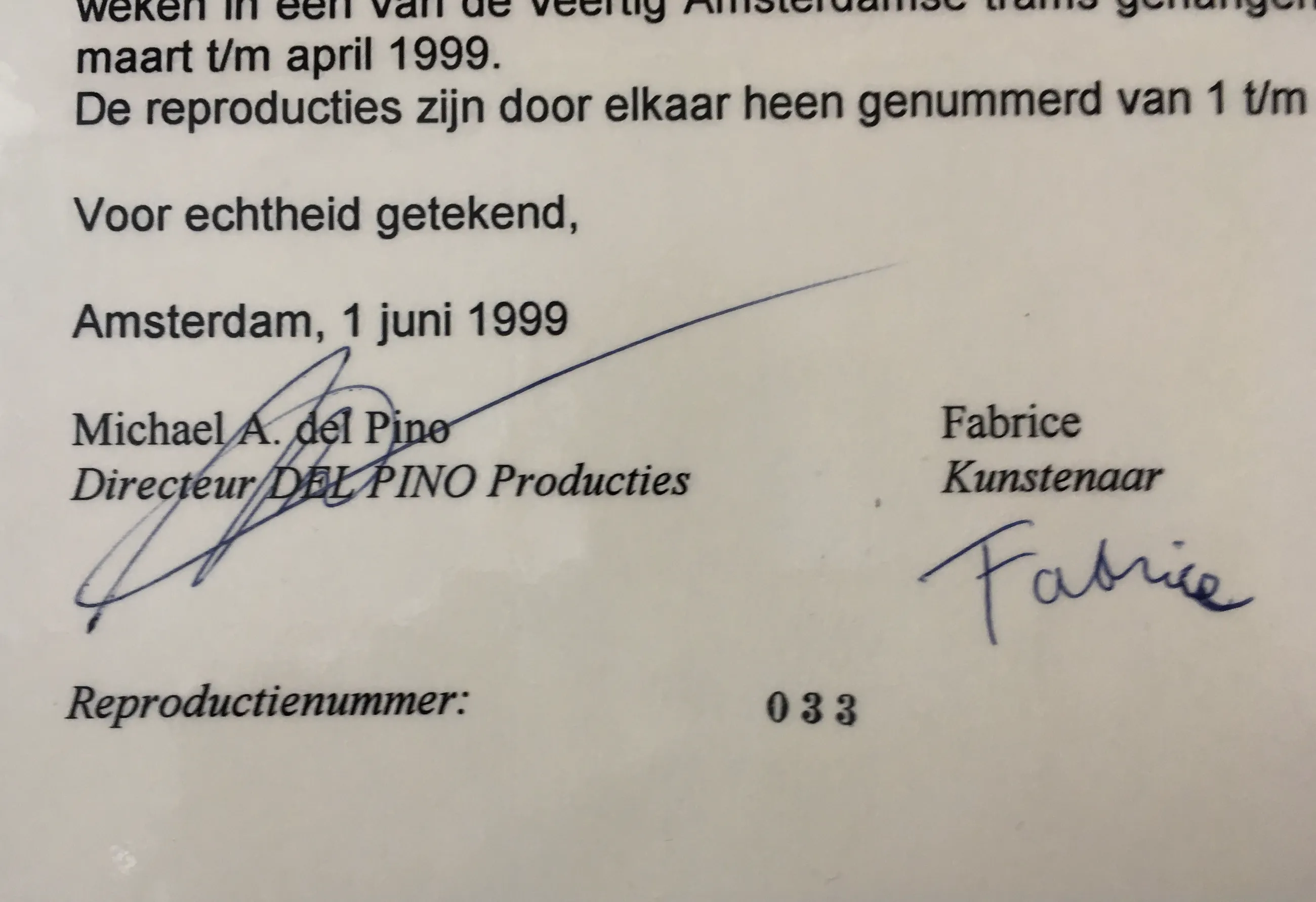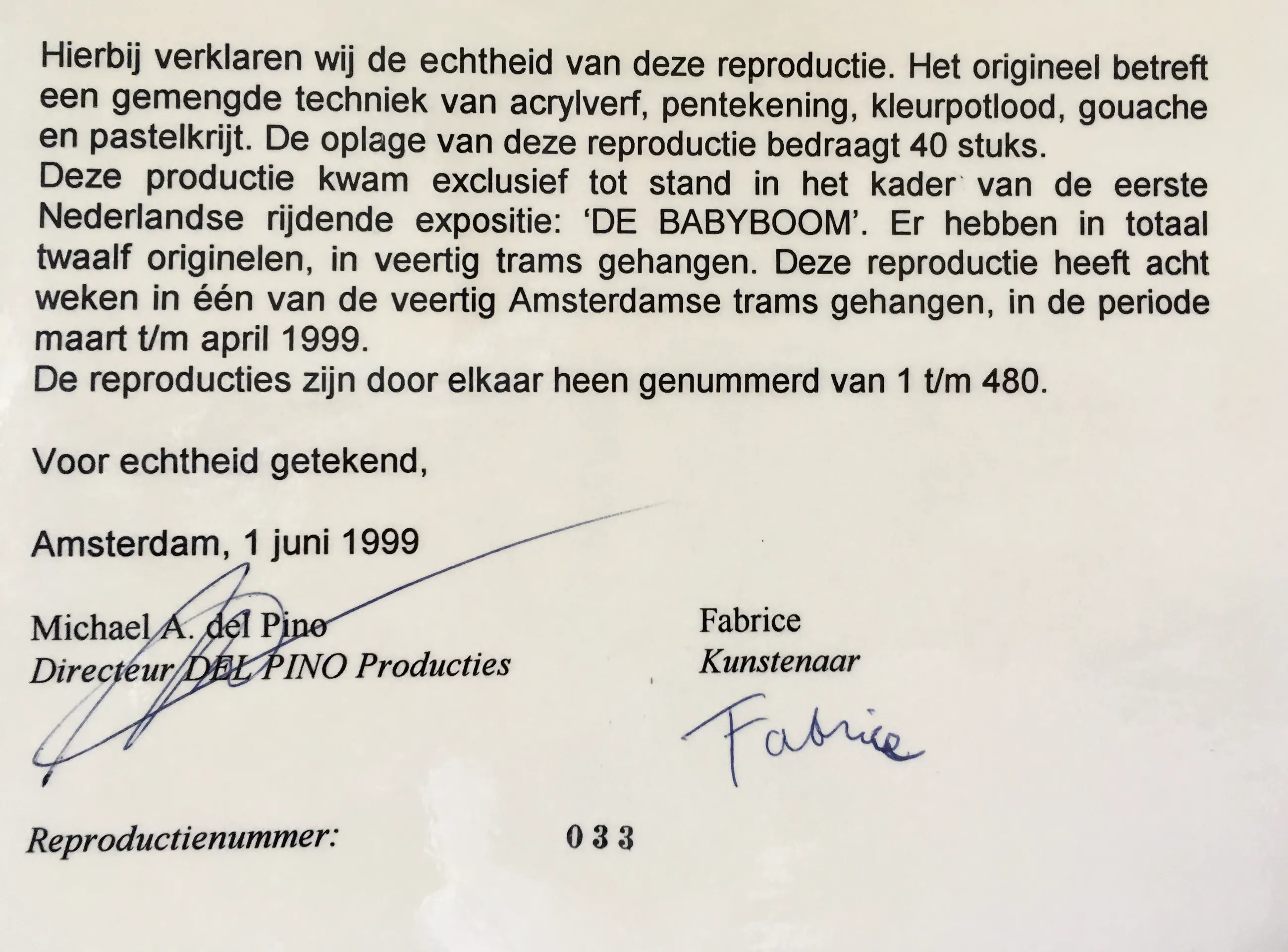 Genummerde reproductie van een van de veertig werken van Fabrice die in 1999 in de Amsterdamse trams hebben gehangen in het kader van de rijdende expositie "De Babyboom". Deze reproductie heeft nummer 38, is ingeseald, samen met het certificaat van echtheid.