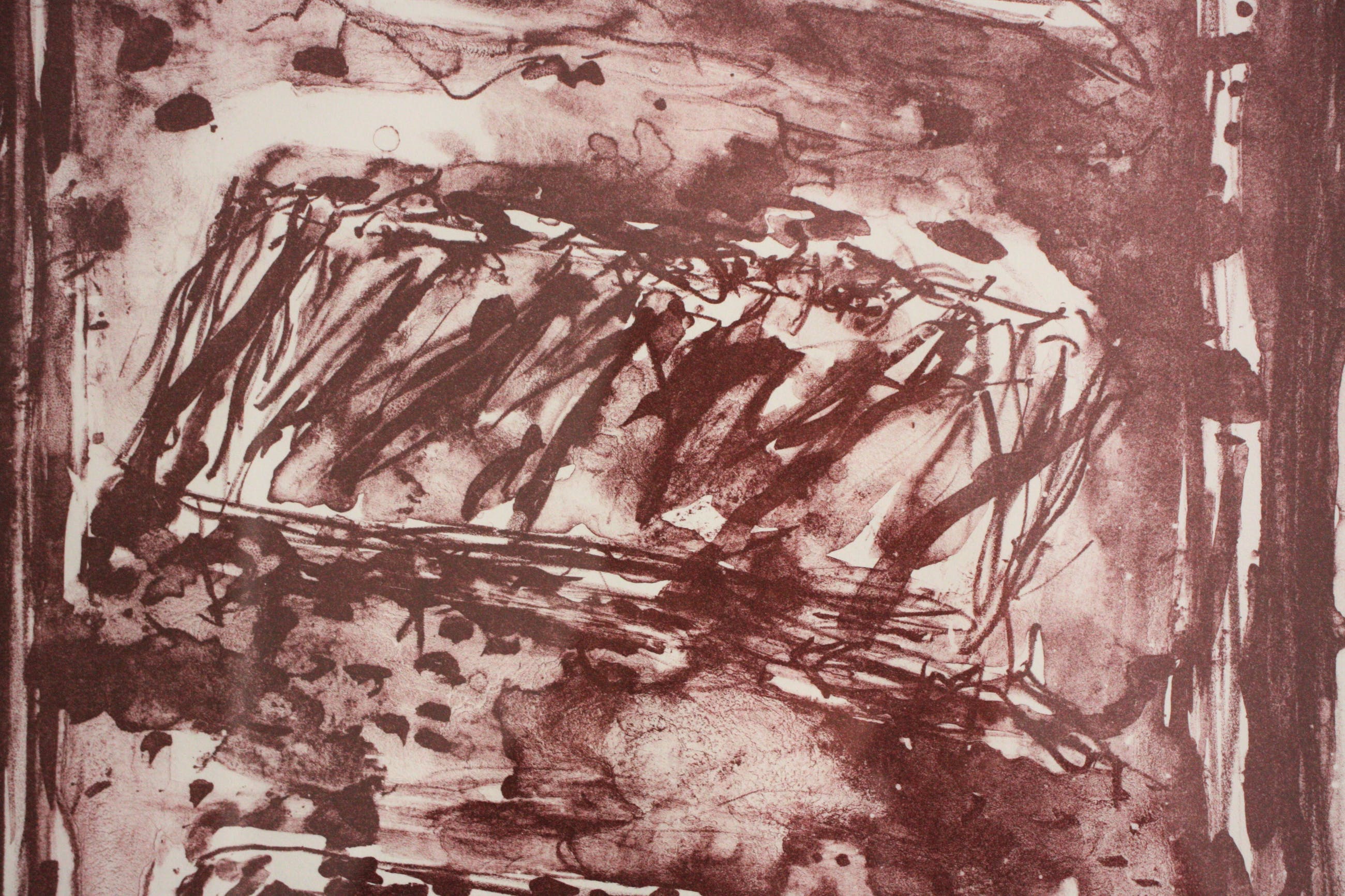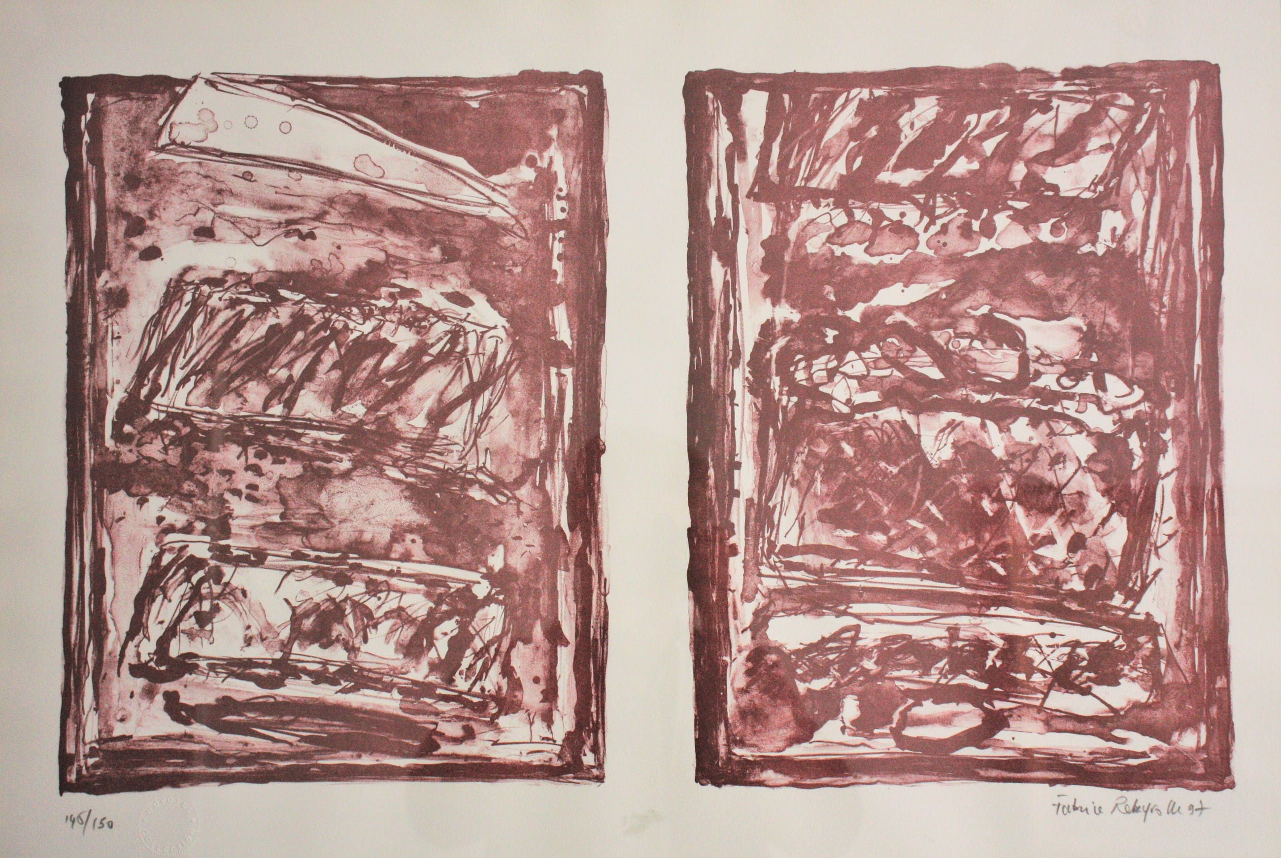 Deze druk is van de Franse kunstenaar Fabrice Rebeyrolle. Het werk betreft twee abstracte composities. Het papier is linksonder genummerd 145/150 en rechtsonder gesigneerd en gedateerd '97. Het werk zit in een baklijst achter glas.