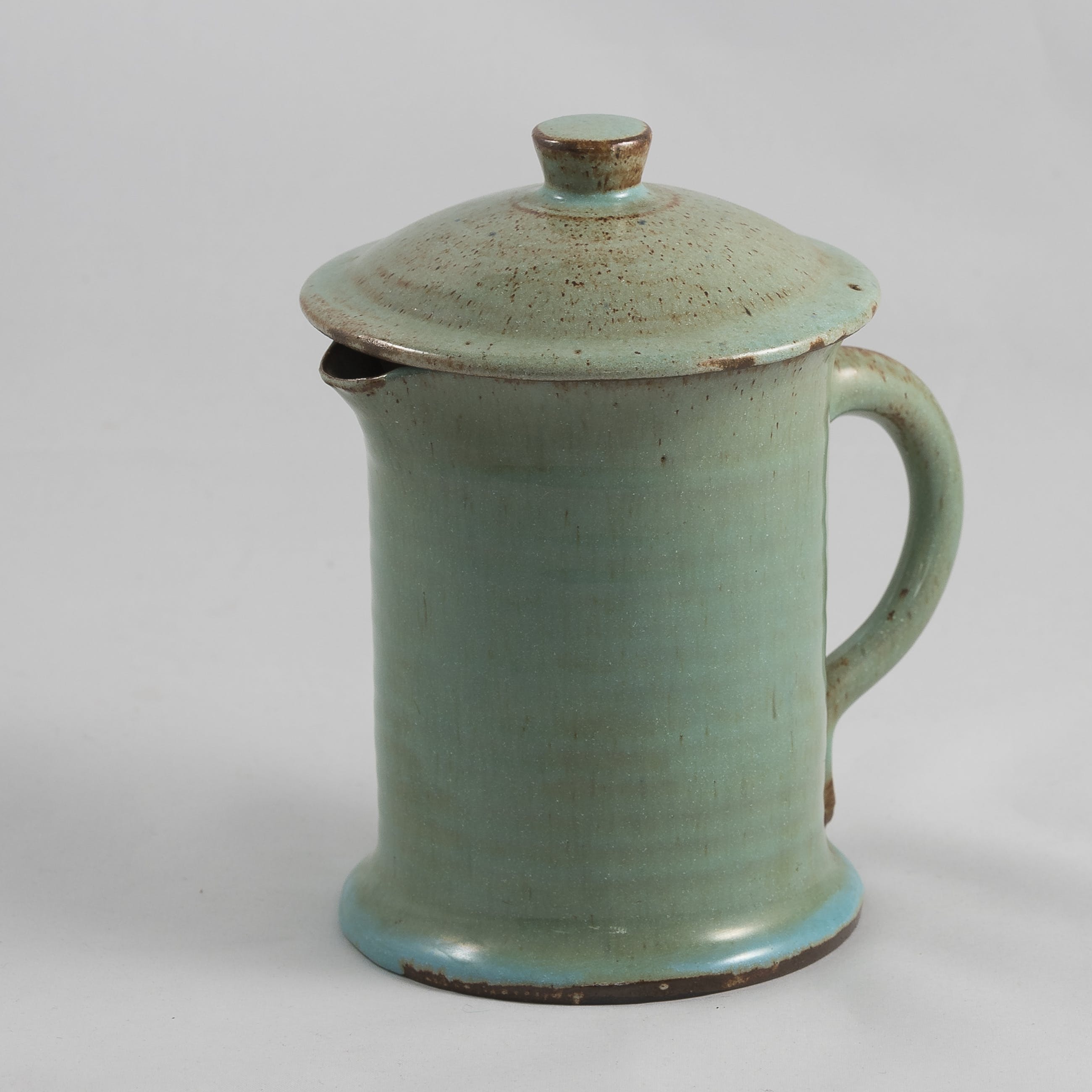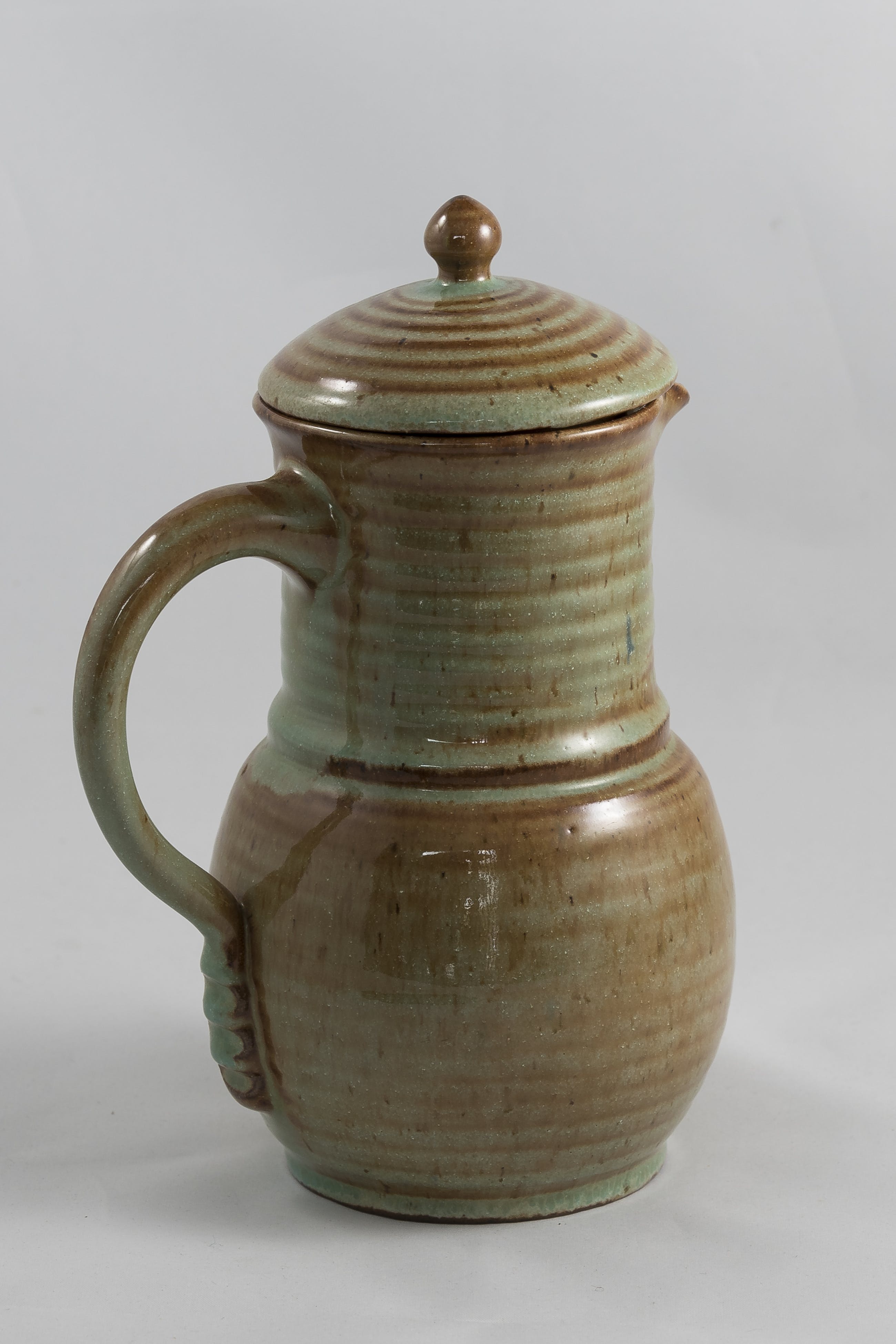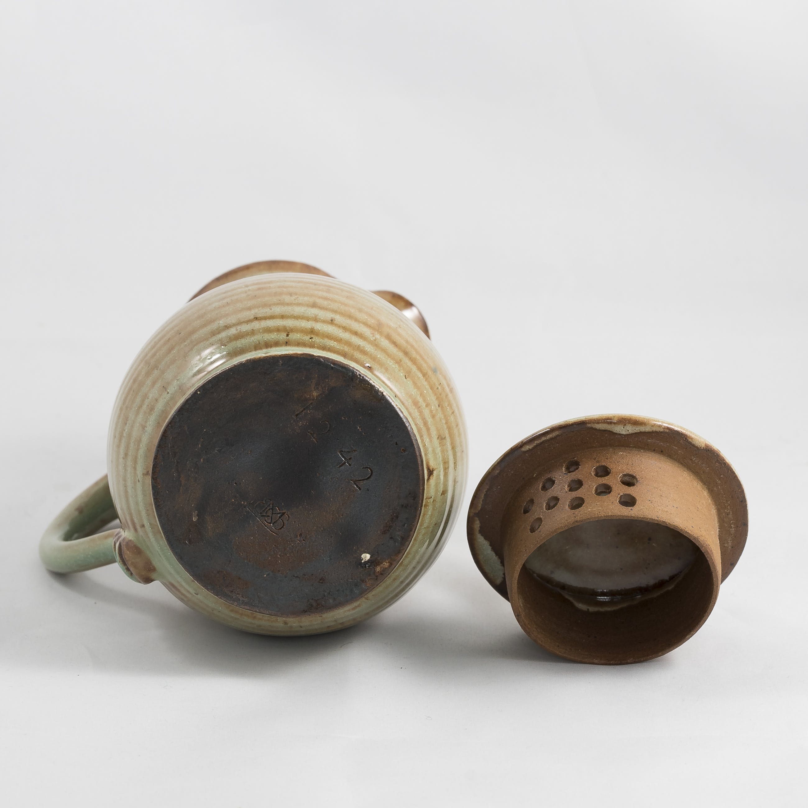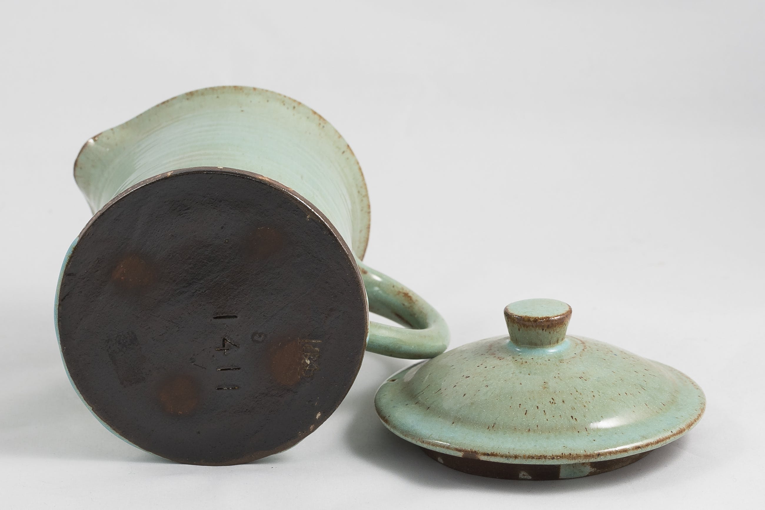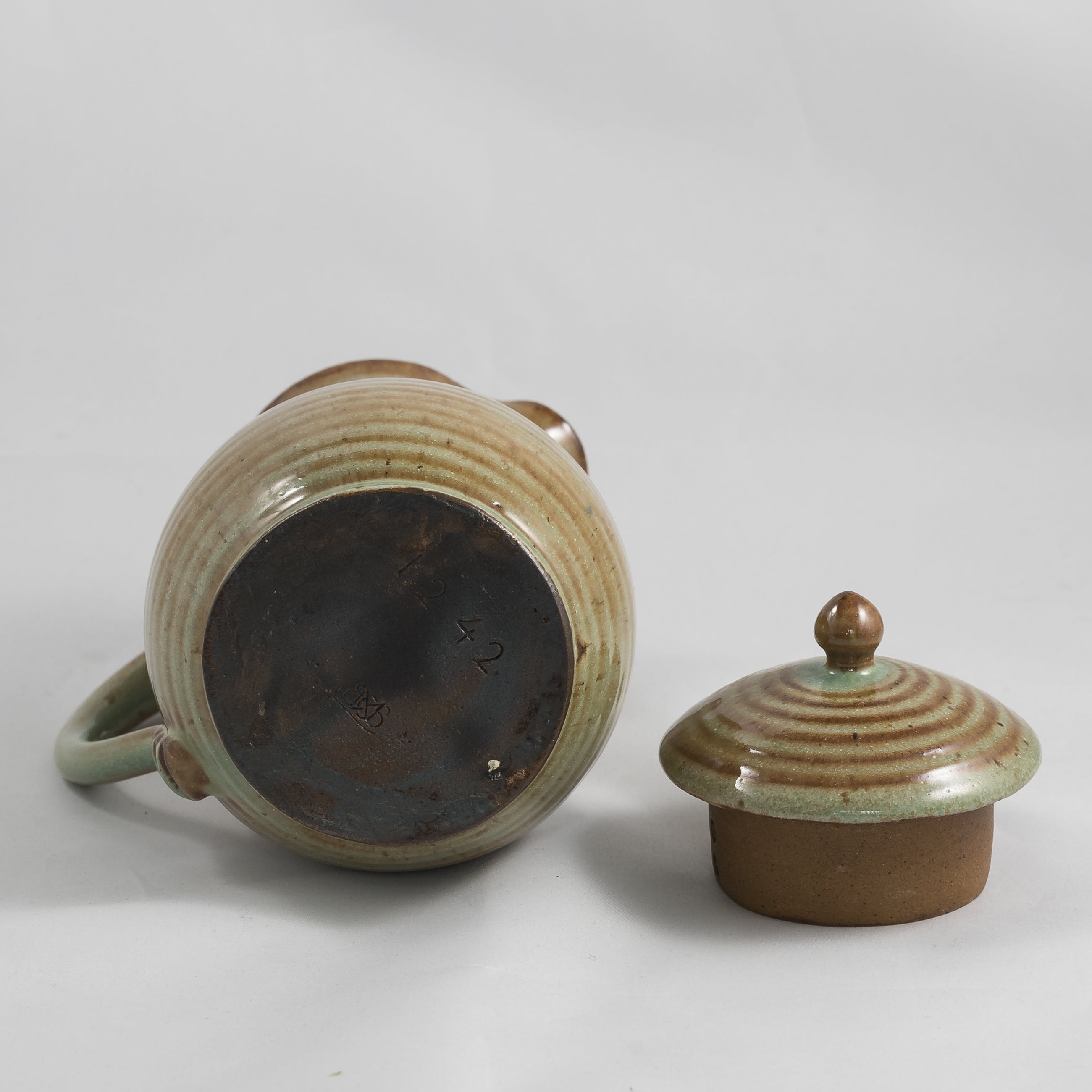 Aardig setje van 2 aardewerken kannetjes met deksel van de Leiderdorpse fabriek opgericht door Willem Coenraad Brouwers. Voorzien van merkteken en modelnummer aan de onderzijde.