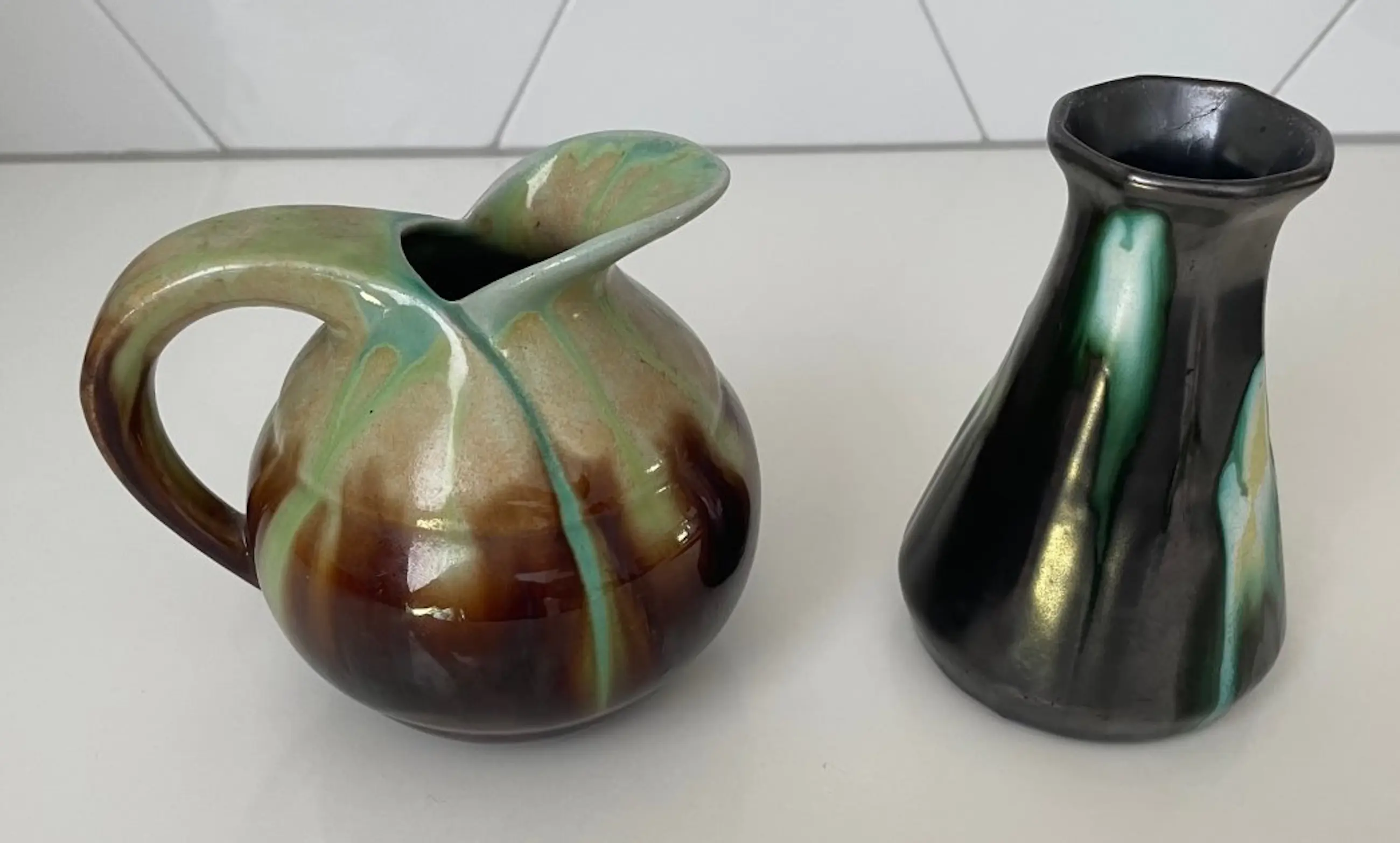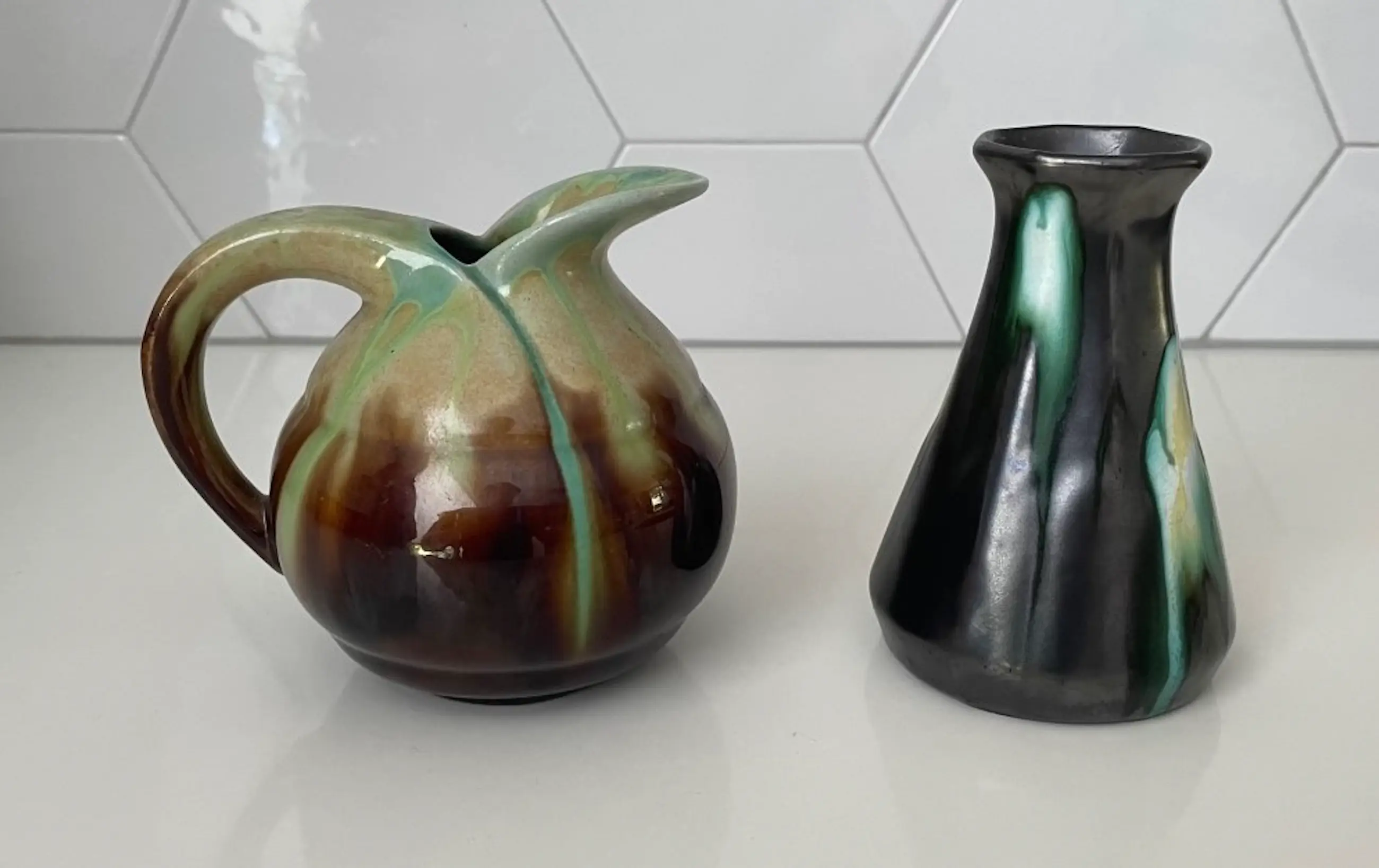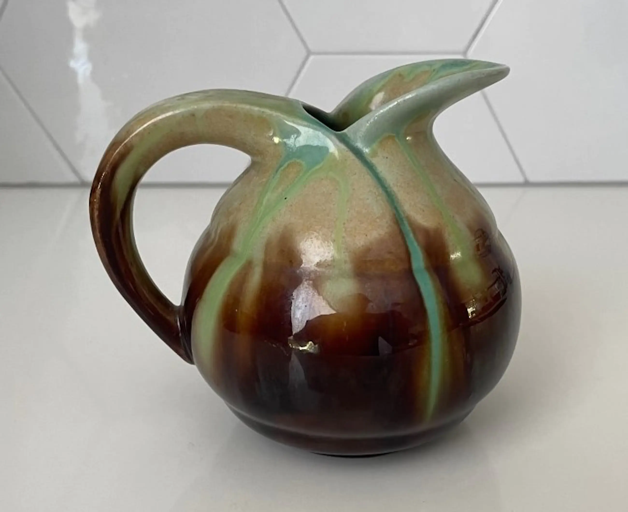 Art Deco aardewerken Snavelkan + vaasje van Faience de Thulin uit Belgie. Het kannetje is onbeschadigde conditie het vaasje heeft een reparatie aan de bovenrand (zie foto). Beiden gemerkt aan de onderzijde.