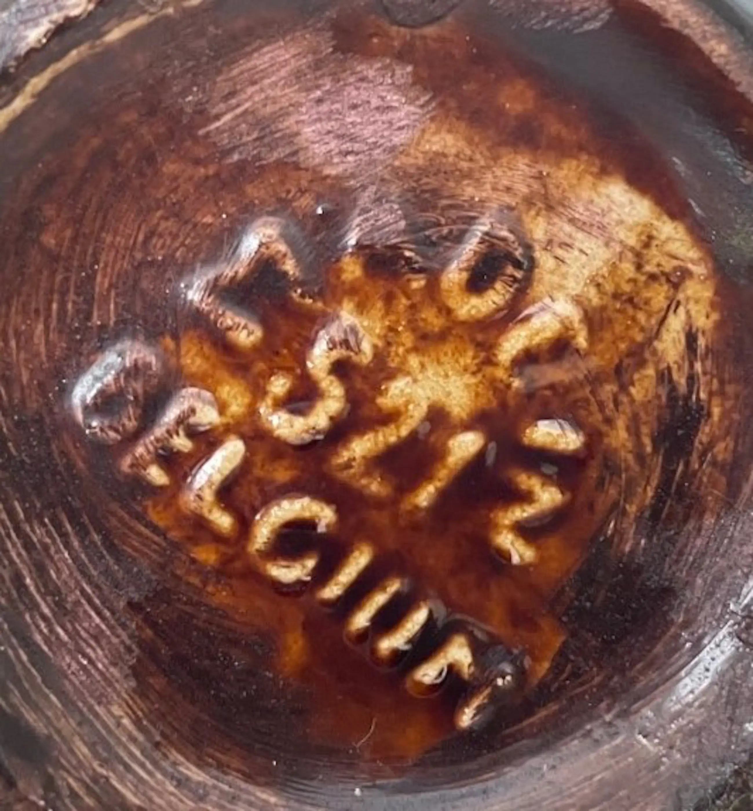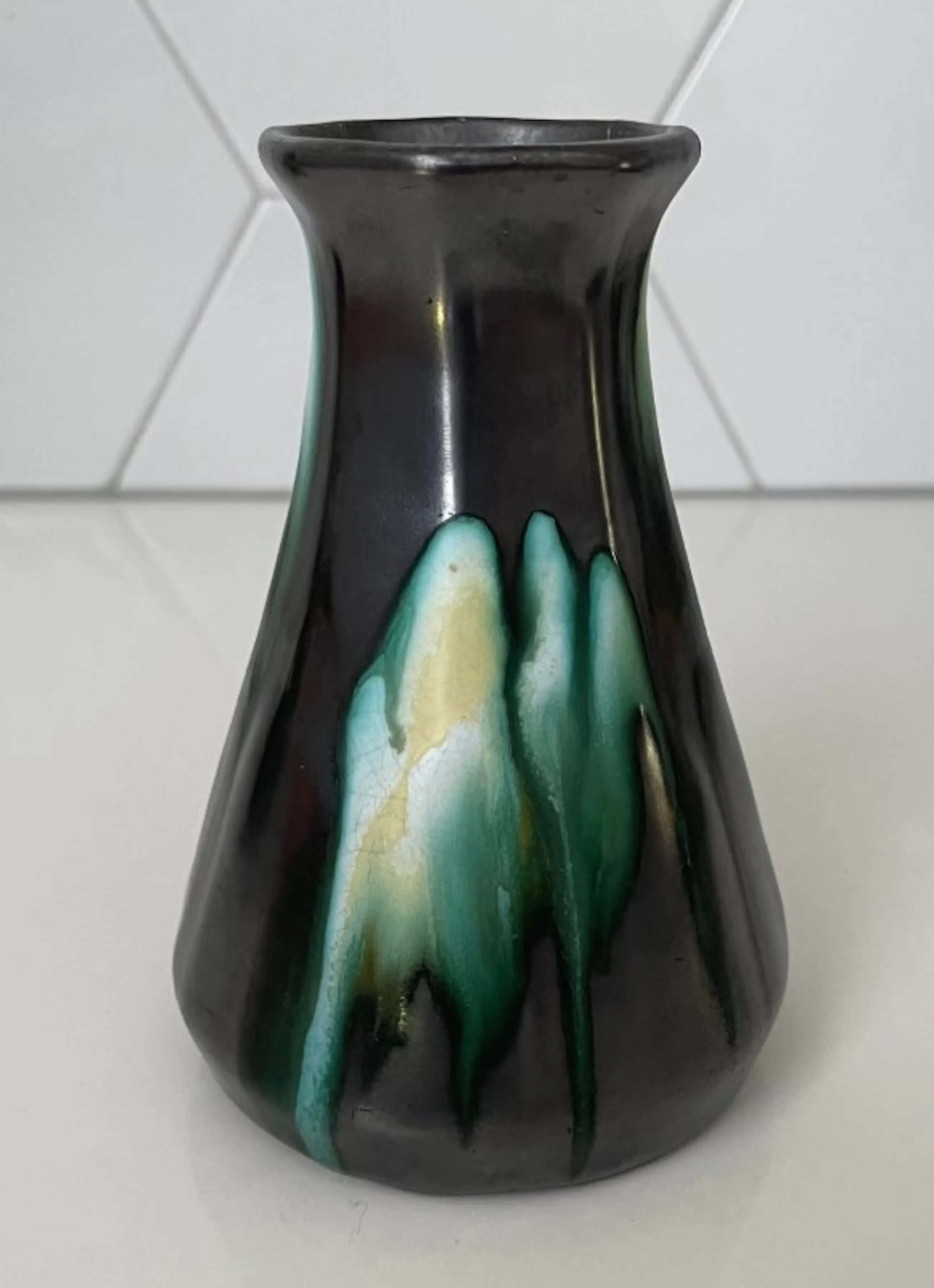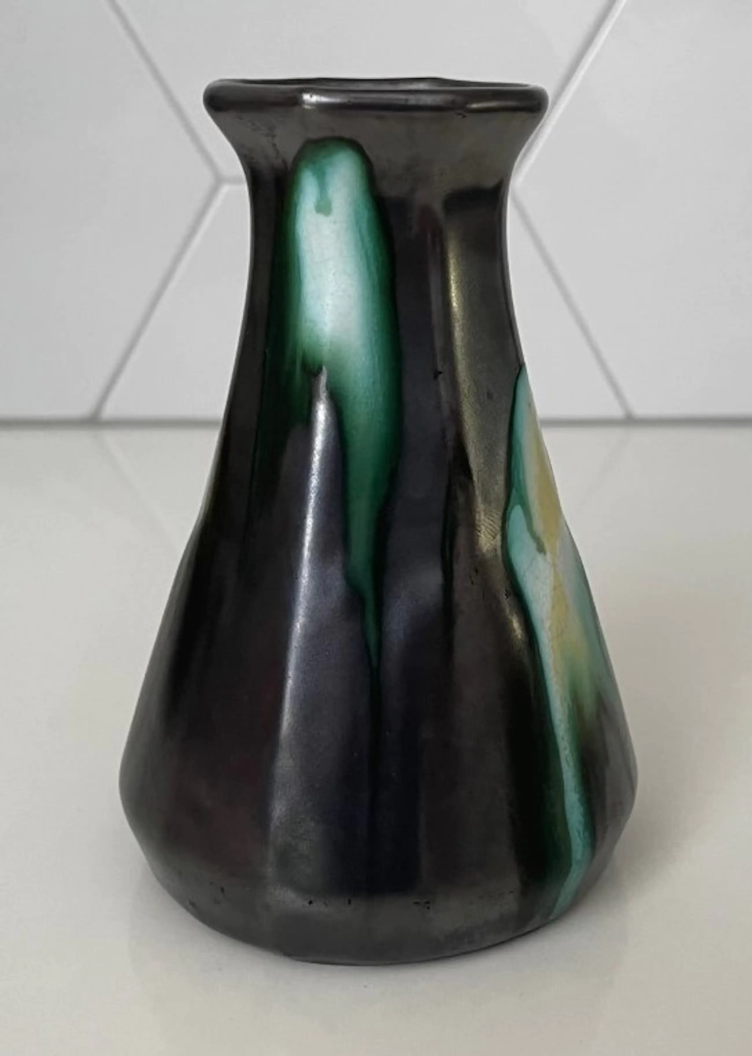 Art Deco aardewerken Snavelkan + vaasje van Faience de Thulin uit Belgie. Het kannetje is onbeschadigde conditie het vaasje heeft een reparatie aan de bovenrand (zie foto). Beiden gemerkt aan de onderzijde.
