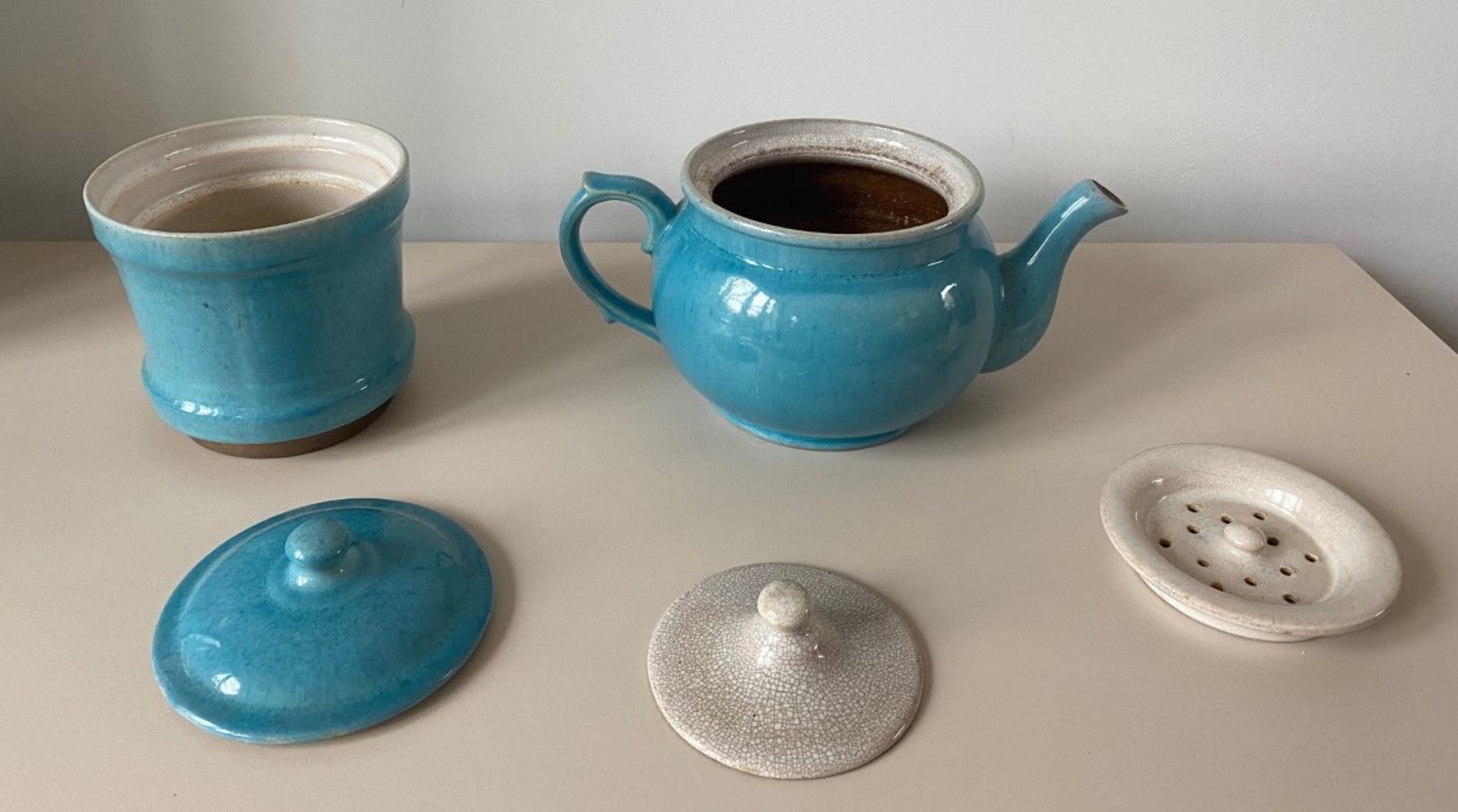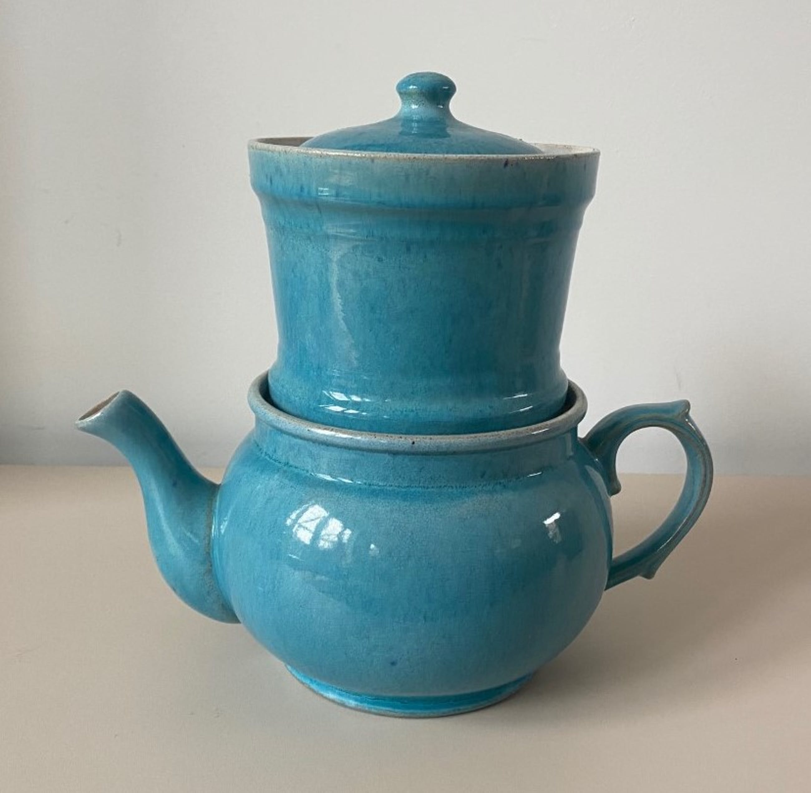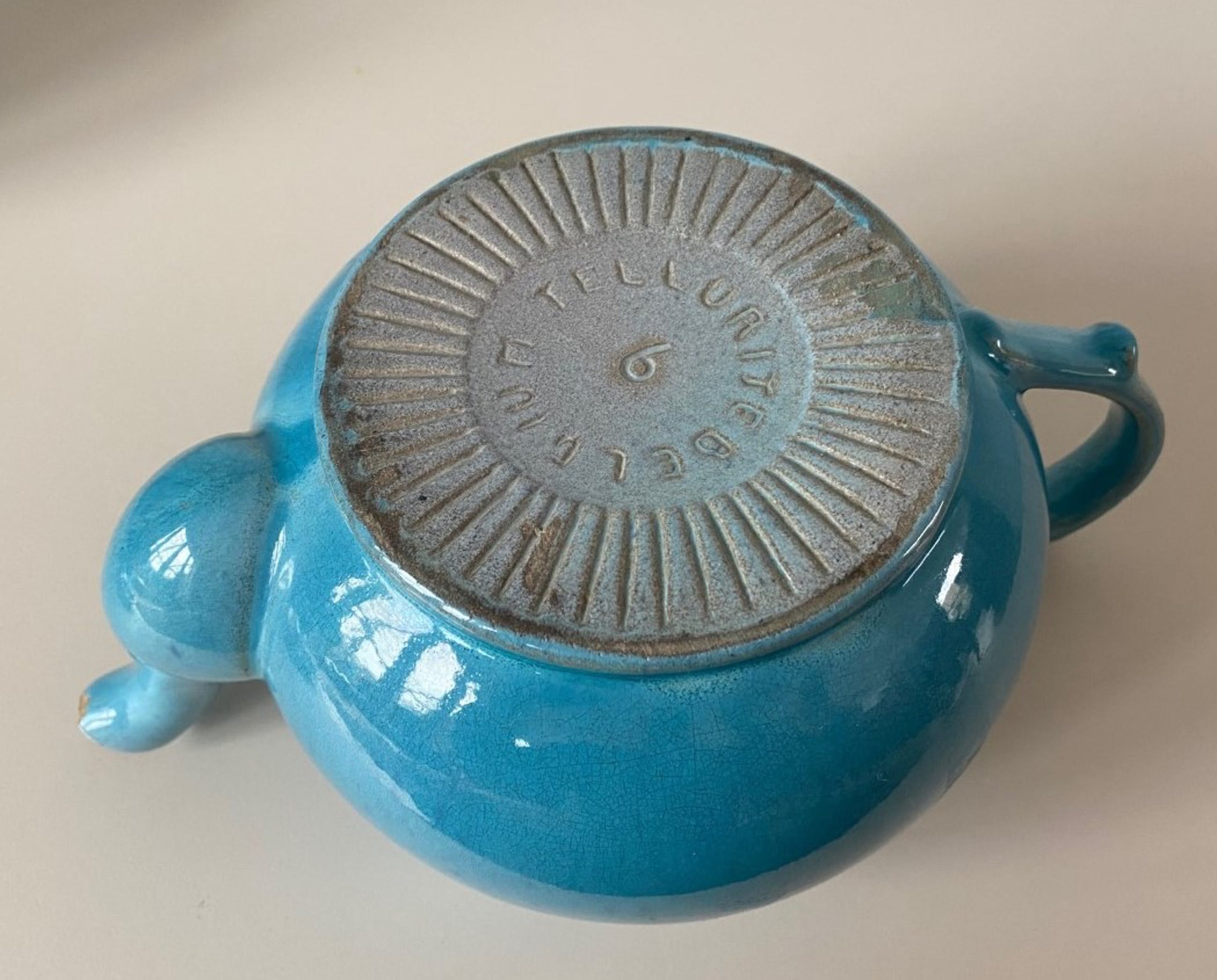 Art Deco Cafetierre + suikerpot en roomkannetje van Tellurite wat de servies afdeling was van de Faiencerie de Thulin. De set is uitgevoerd in een prachtig turqoise glazuur. Vooral de de Cafetierre zelf is in goed gebruikte conditie, heeft twee chipjes een op de tuit en een op een losse deksel om de koffie aan te drukken en is vooral aan de binnenzijde behoorlijk gecraqueleerd. De suikerpot en het roomkannetje zijn dan weer onbeschadigd. Alle stukjes zijn gemerkt aan de onderzijde.