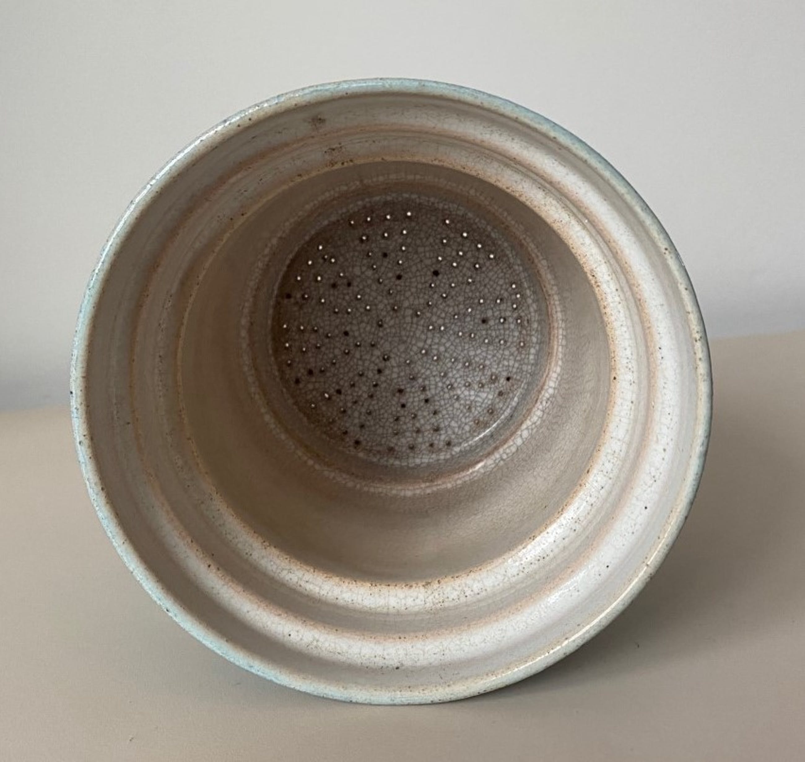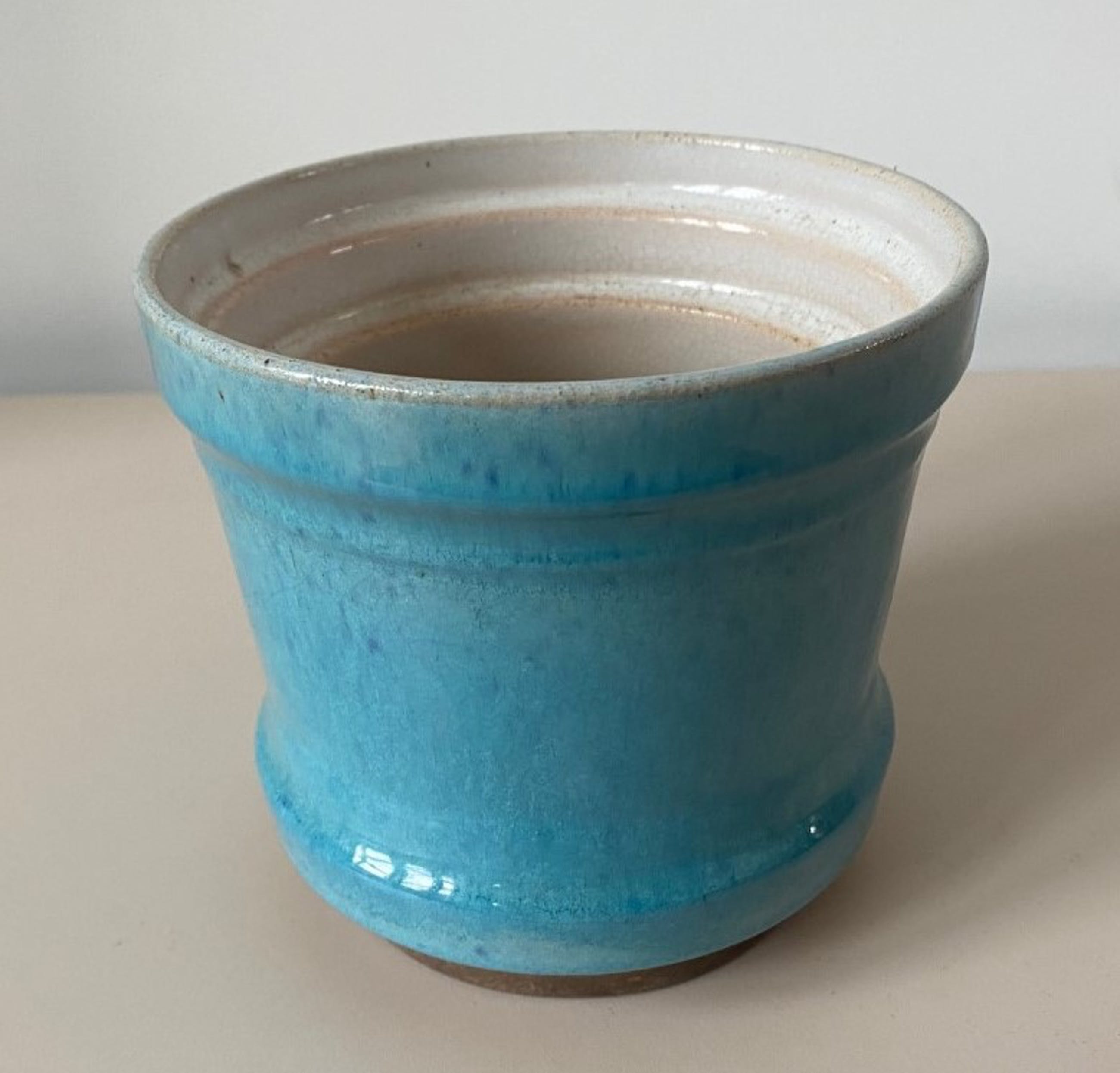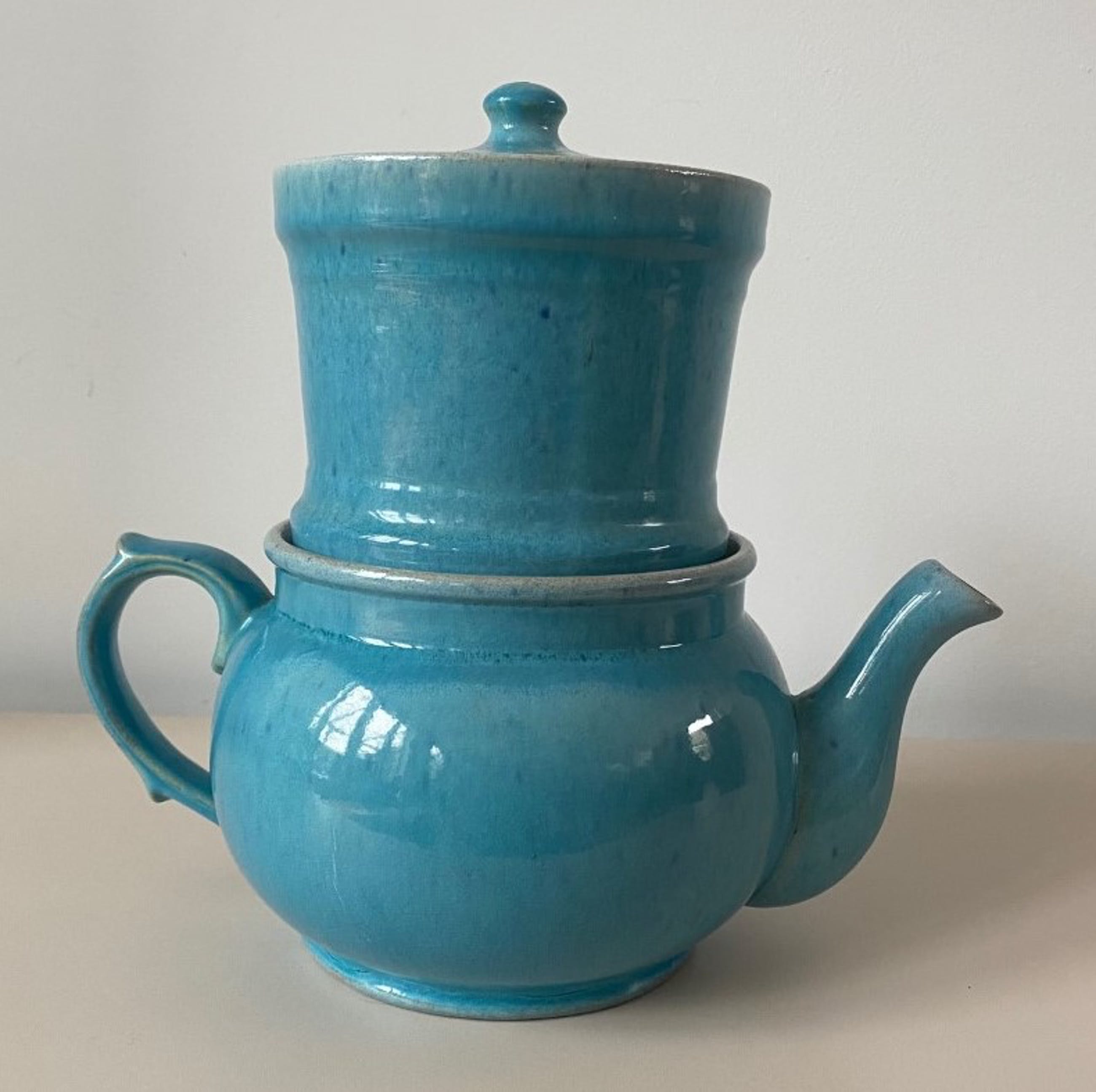 Art Deco Cafetierre + suikerpot en roomkannetje van Tellurite wat de servies afdeling was van de Faiencerie de Thulin. De set is uitgevoerd in een prachtig turqoise glazuur. Vooral de de Cafetierre zelf is in goed gebruikte conditie, heeft twee chipjes een op de tuit en een op een losse deksel om de koffie aan te drukken en is vooral aan de binnenzijde behoorlijk gecraqueleerd. De suikerpot en het roomkannetje zijn dan weer onbeschadigd. Alle stukjes zijn gemerkt aan de onderzijde.