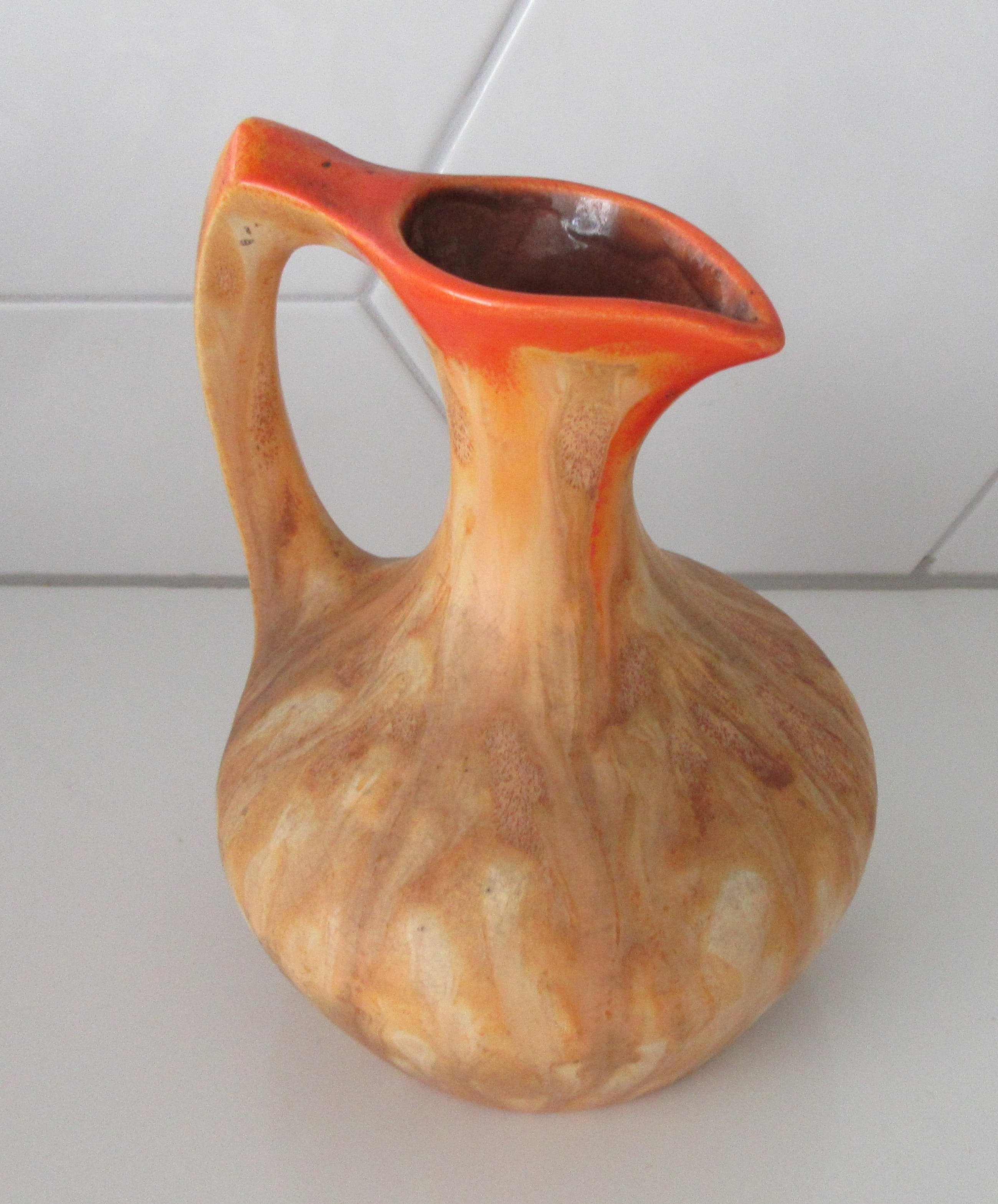 Faience de Thulin Art deco stroomglazuren hengselvaas model 255. Mooi stukje art deco faience uit Belgie uitgevoerd in beige en lichtbruin stroomglazuur met aan de bovenzijde fel oranje glazuur. Aan de onderzijde voorzien ingedrukt modelnummer 255 en "Made in Belgium".