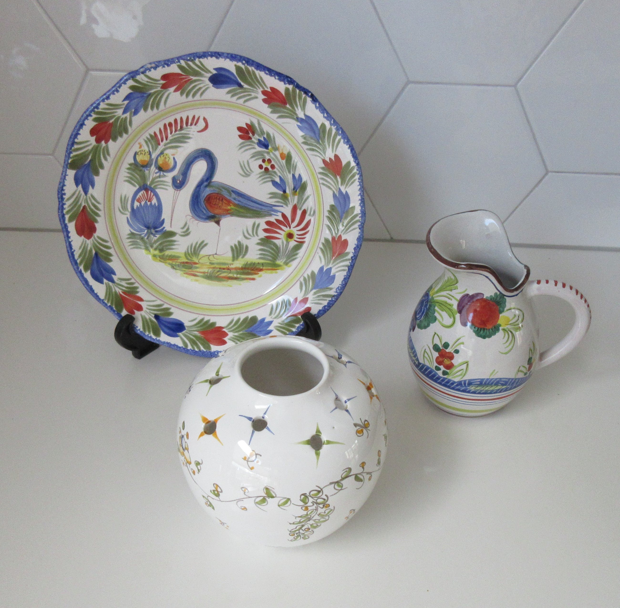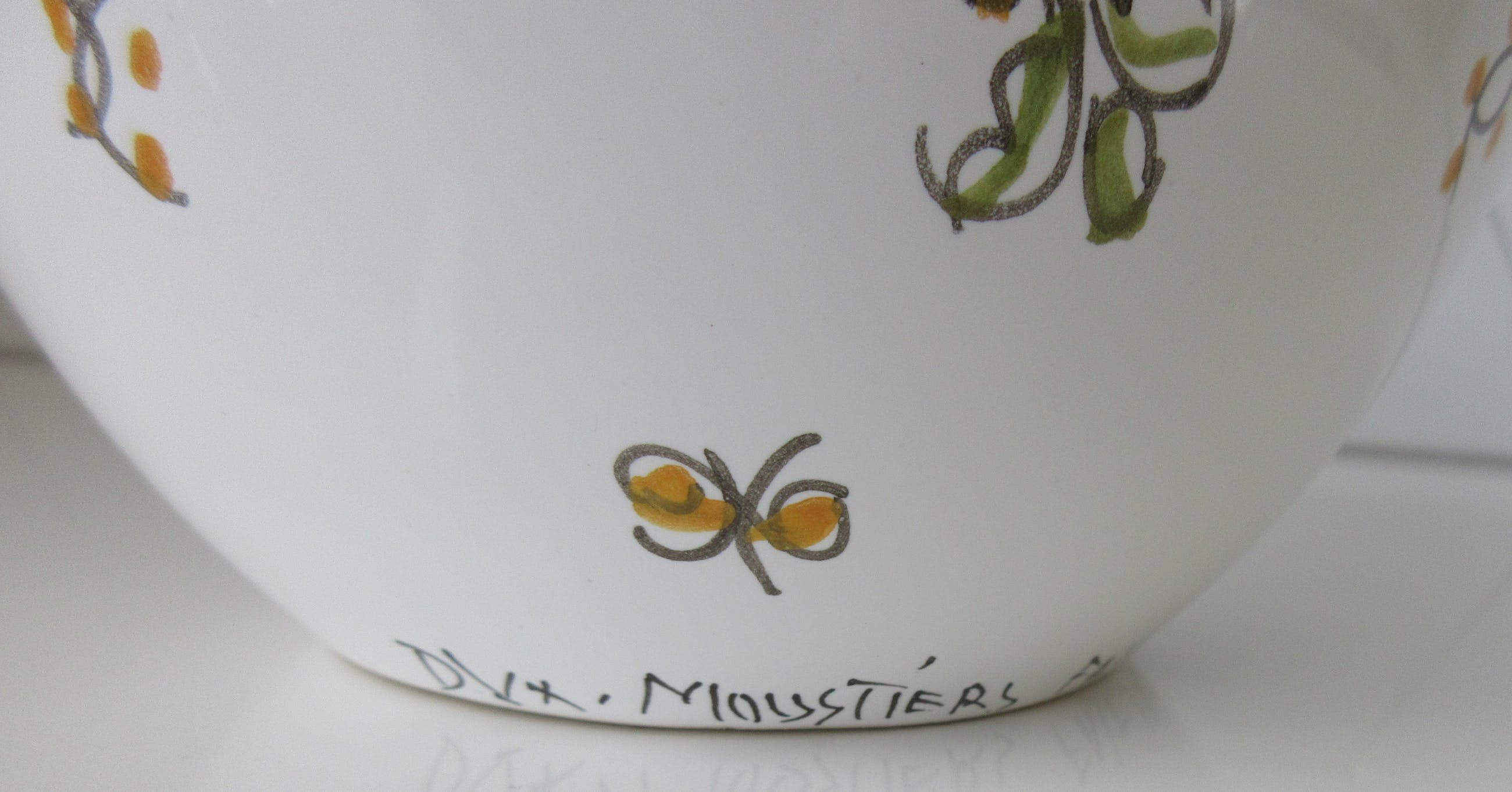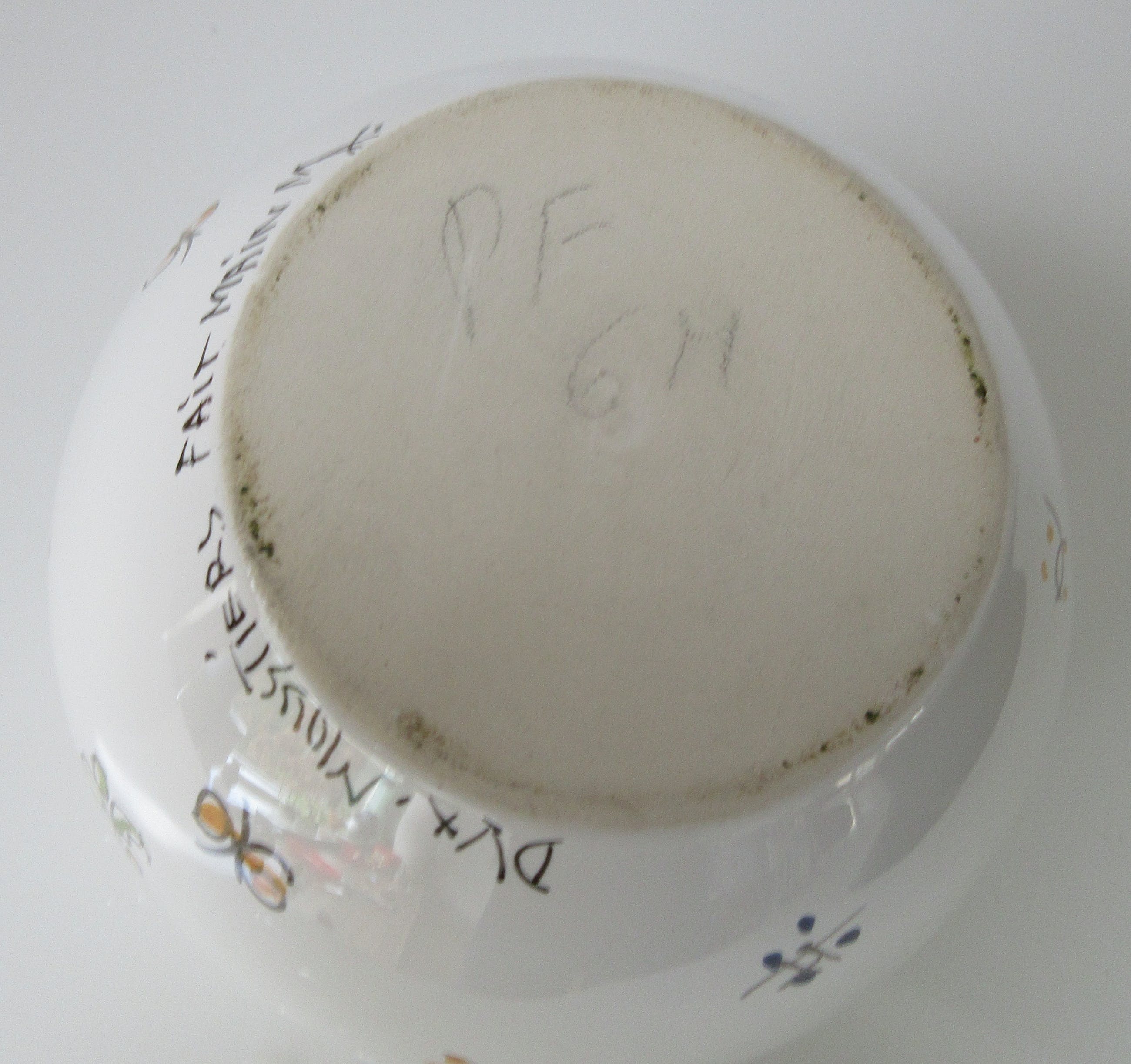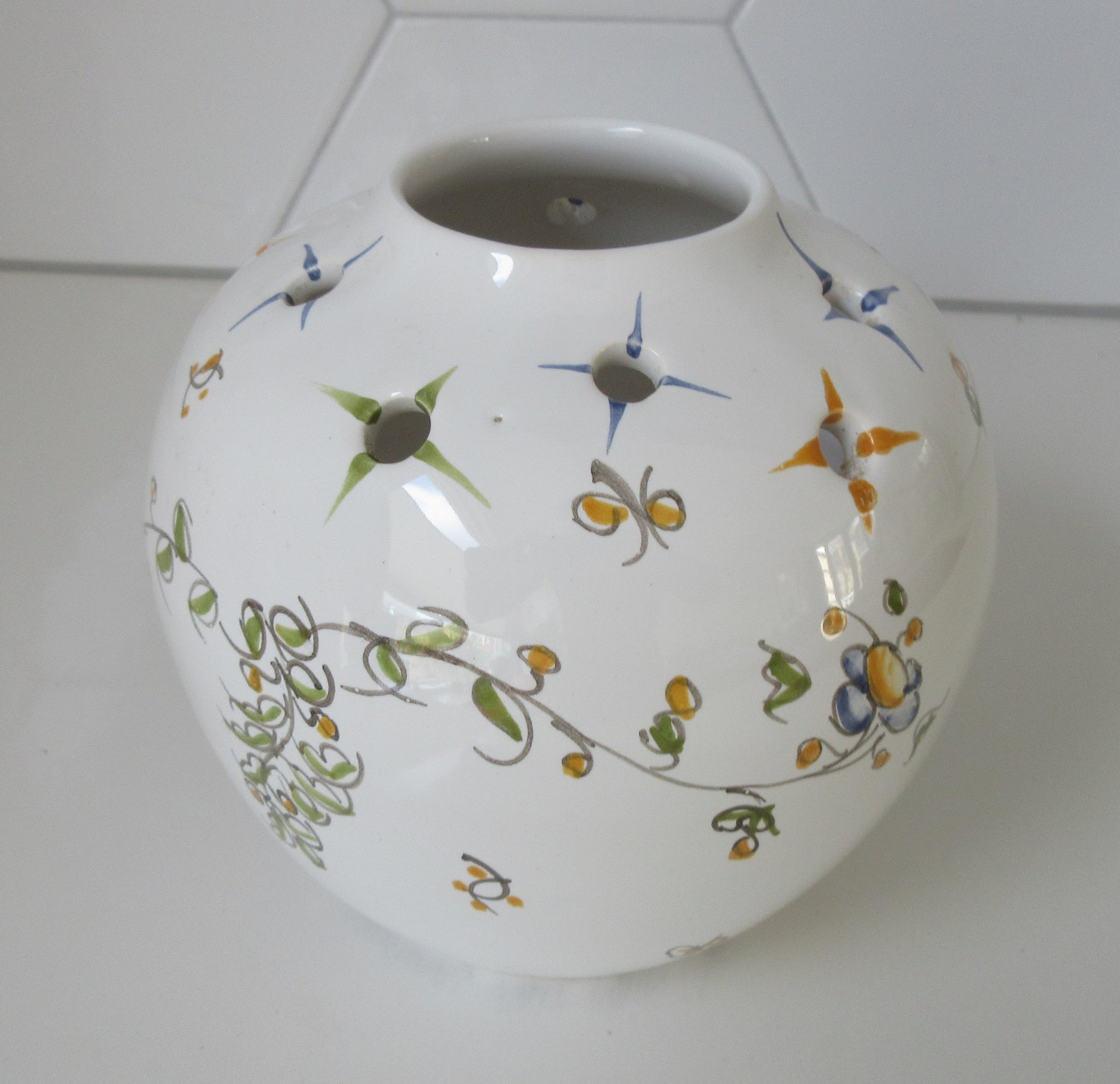 Polychroom vaasje met extra gaten voor losse bloemen met een afbeelding van een kraanvogel, onderaan aan de achterzijde met de hand gemerkt en voorzien van schilders initialen M.A. In onbeschadigde conditie. Afmetingen; 13 cm hoog en 13 cm diameter