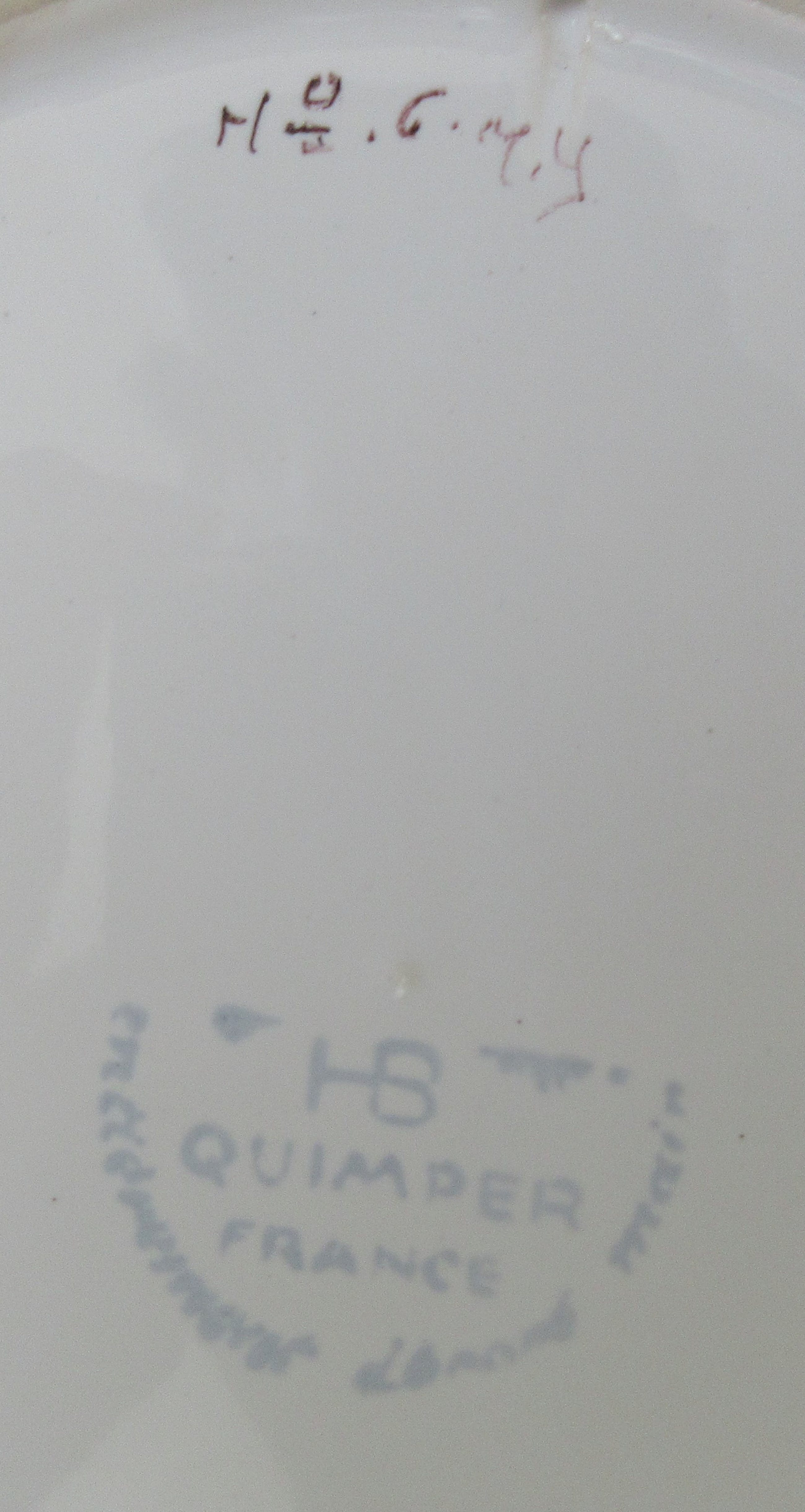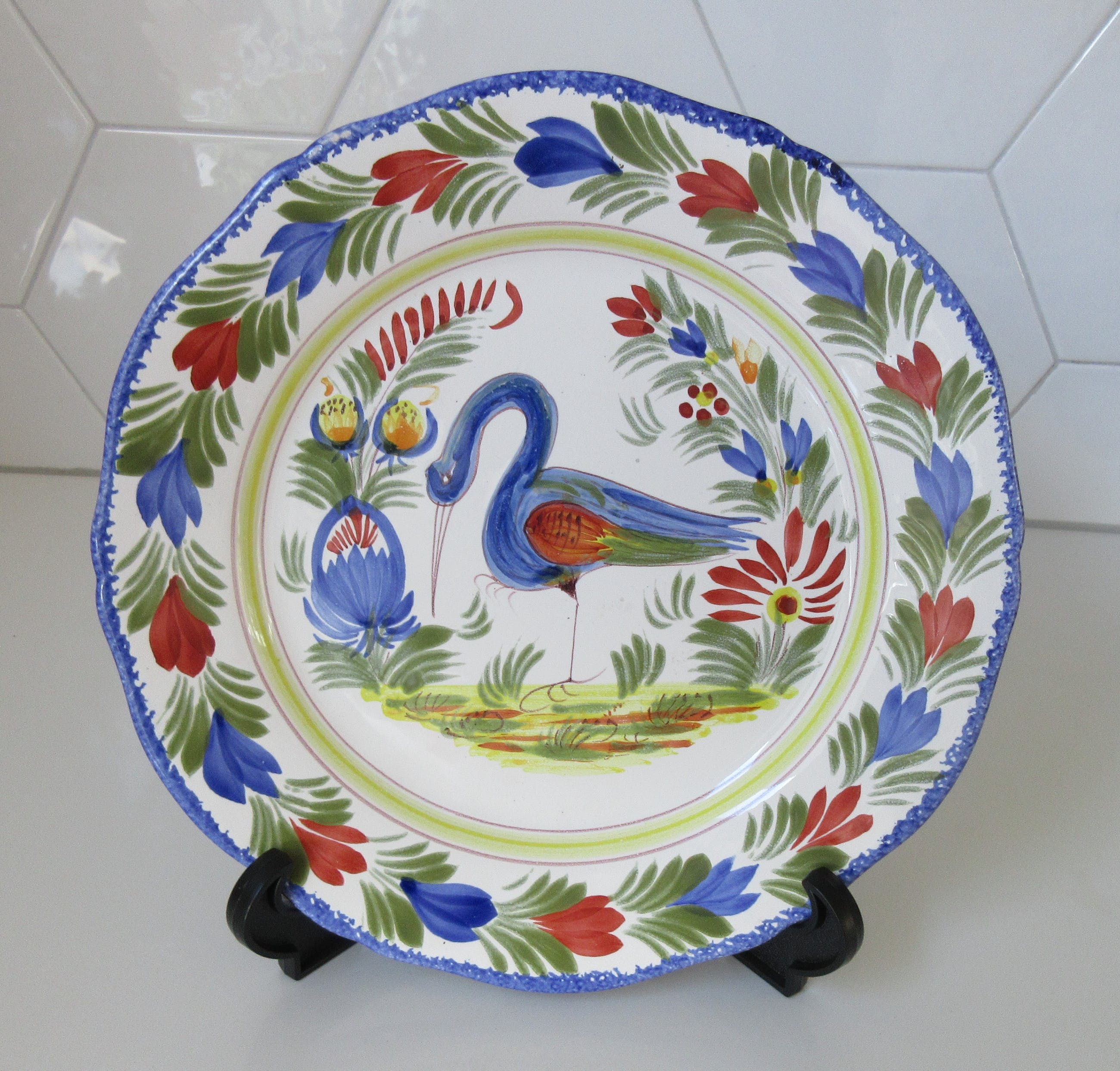 Polychroom hand beschilderd wandbord met de afbeelding van een kraanvogel in het midden, de rand is gedecoreerd met tulpen. Onbeschadigde conditie. Aan de achterzijde gemerkt en voorzien van schilders initialen; M.Y. Afmetingen; 3 cm hoog en 25 cm diameter
