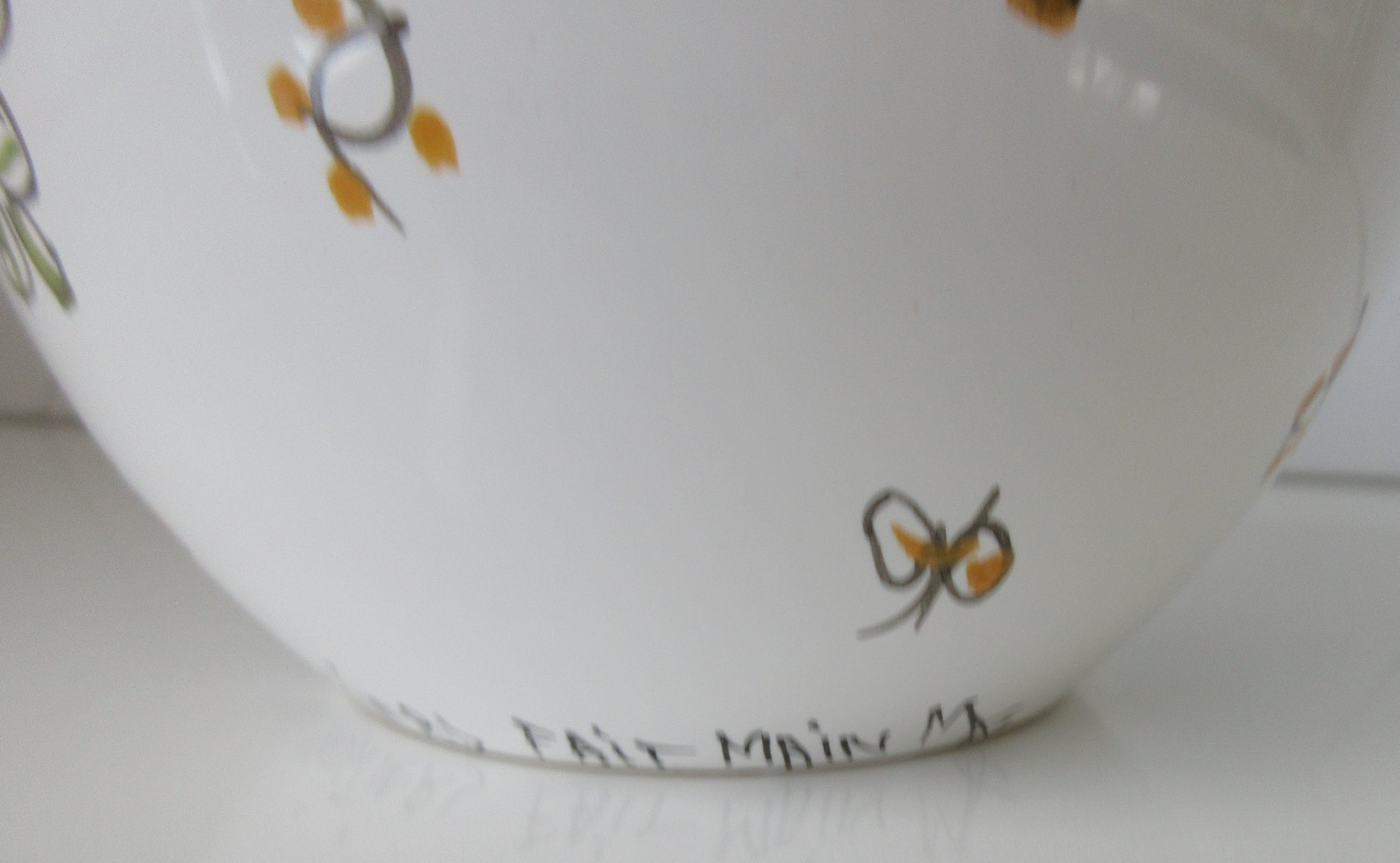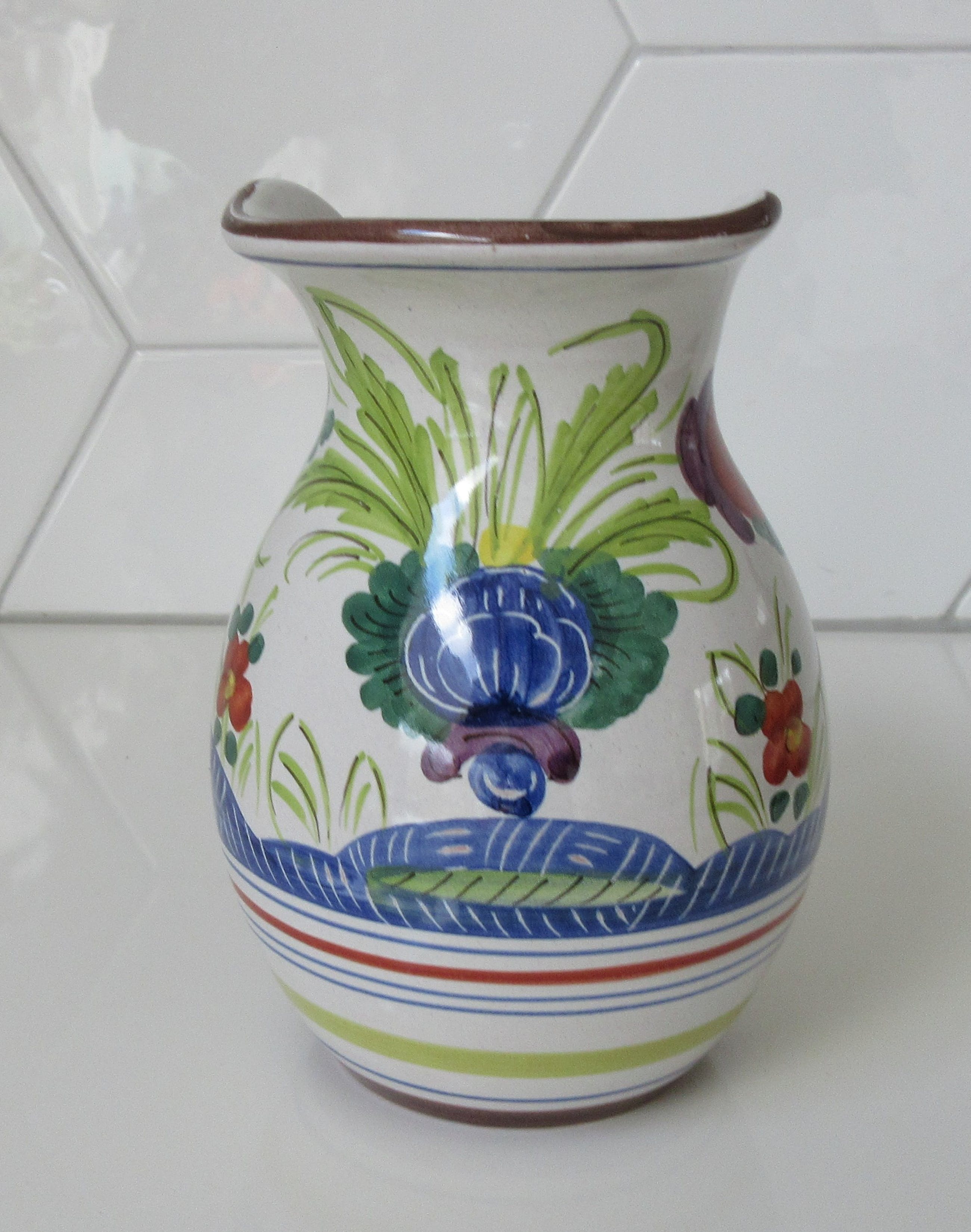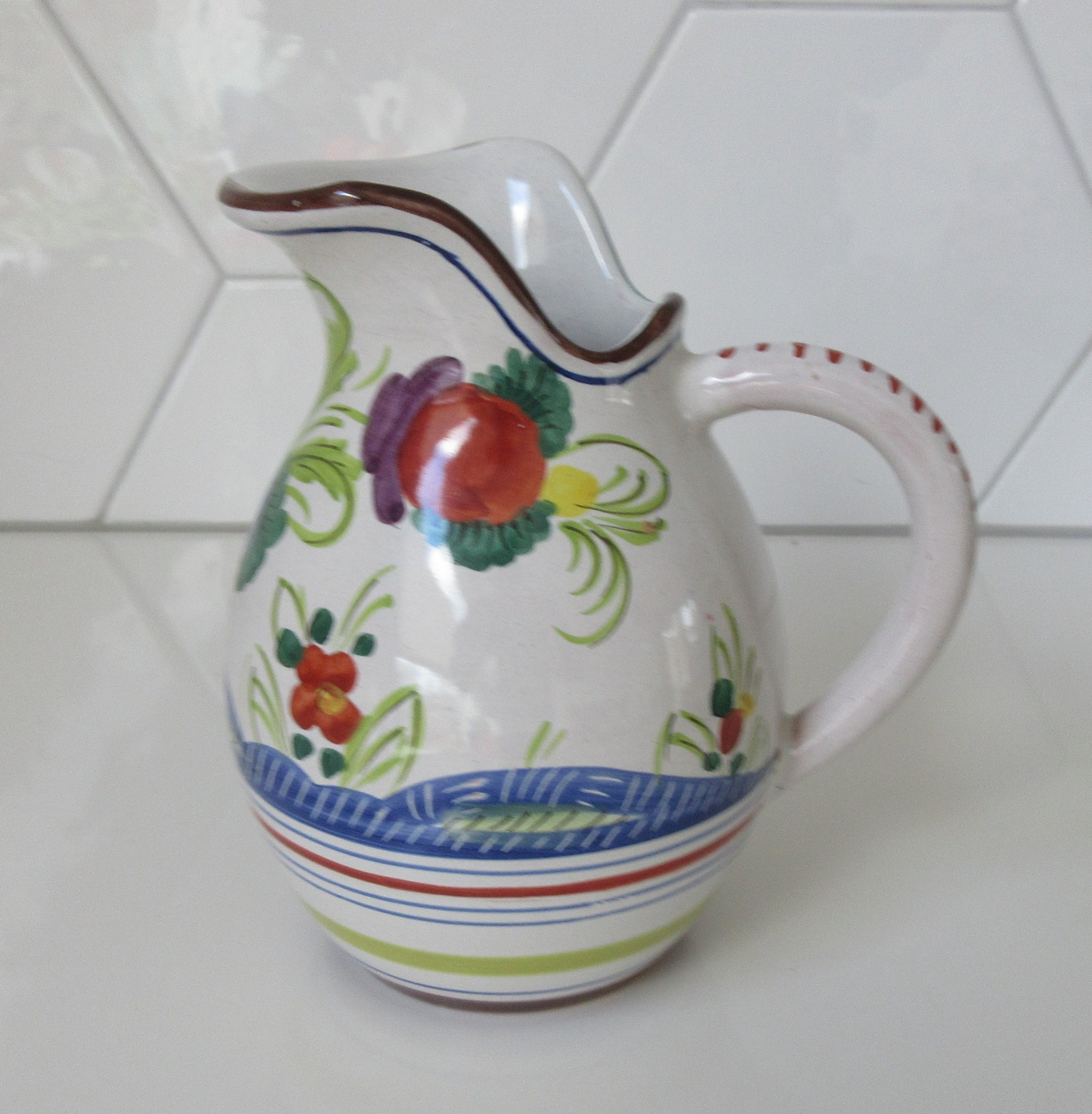 Polychroom hand beschilderd snavelkan met floraal decor. In prima onbeschadigde conditie. Voorzien van blindmerk aan de onderzijde. Afmetingen; 15 cm hoog, 13 cm breed, 10 cm diep