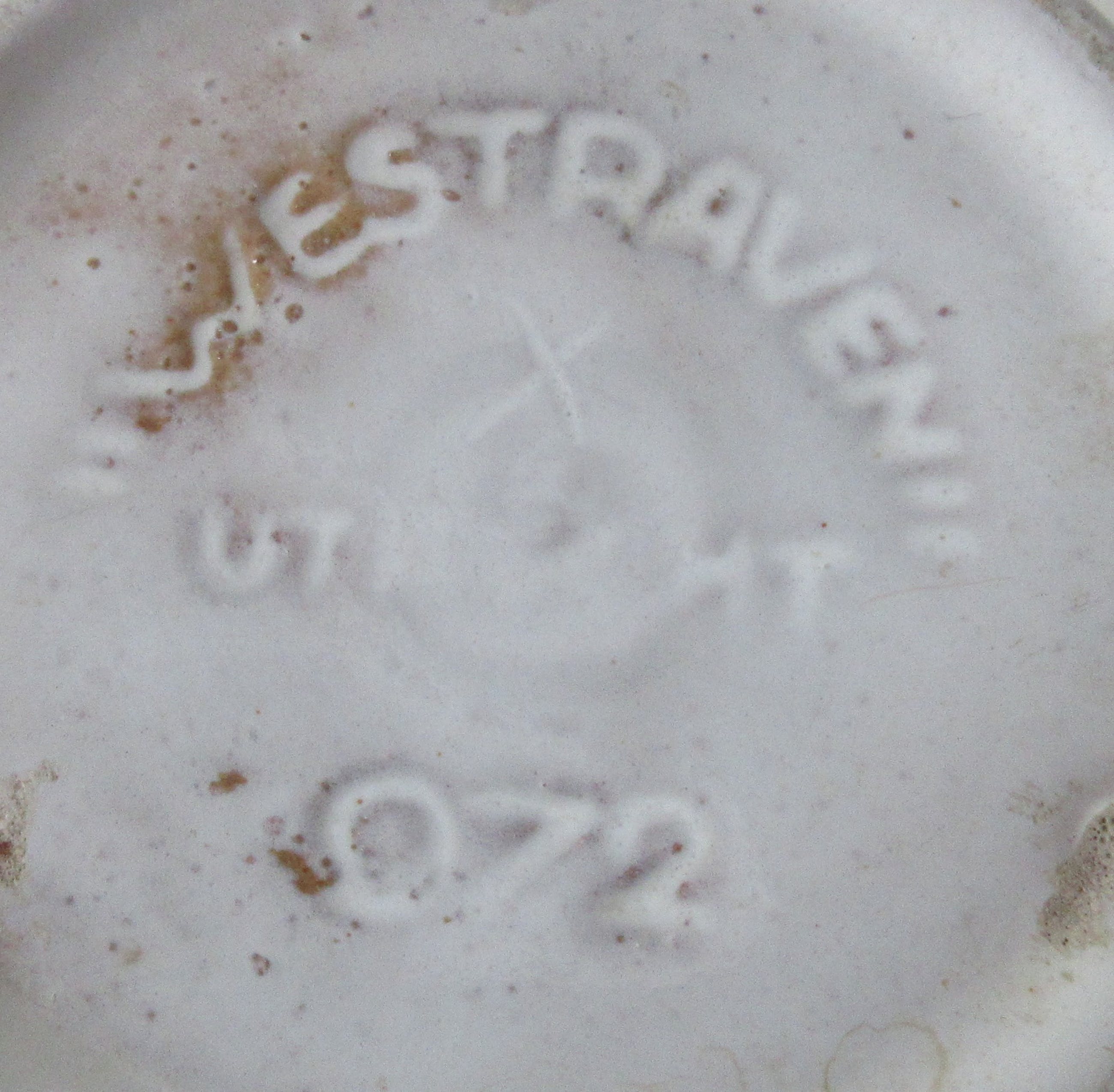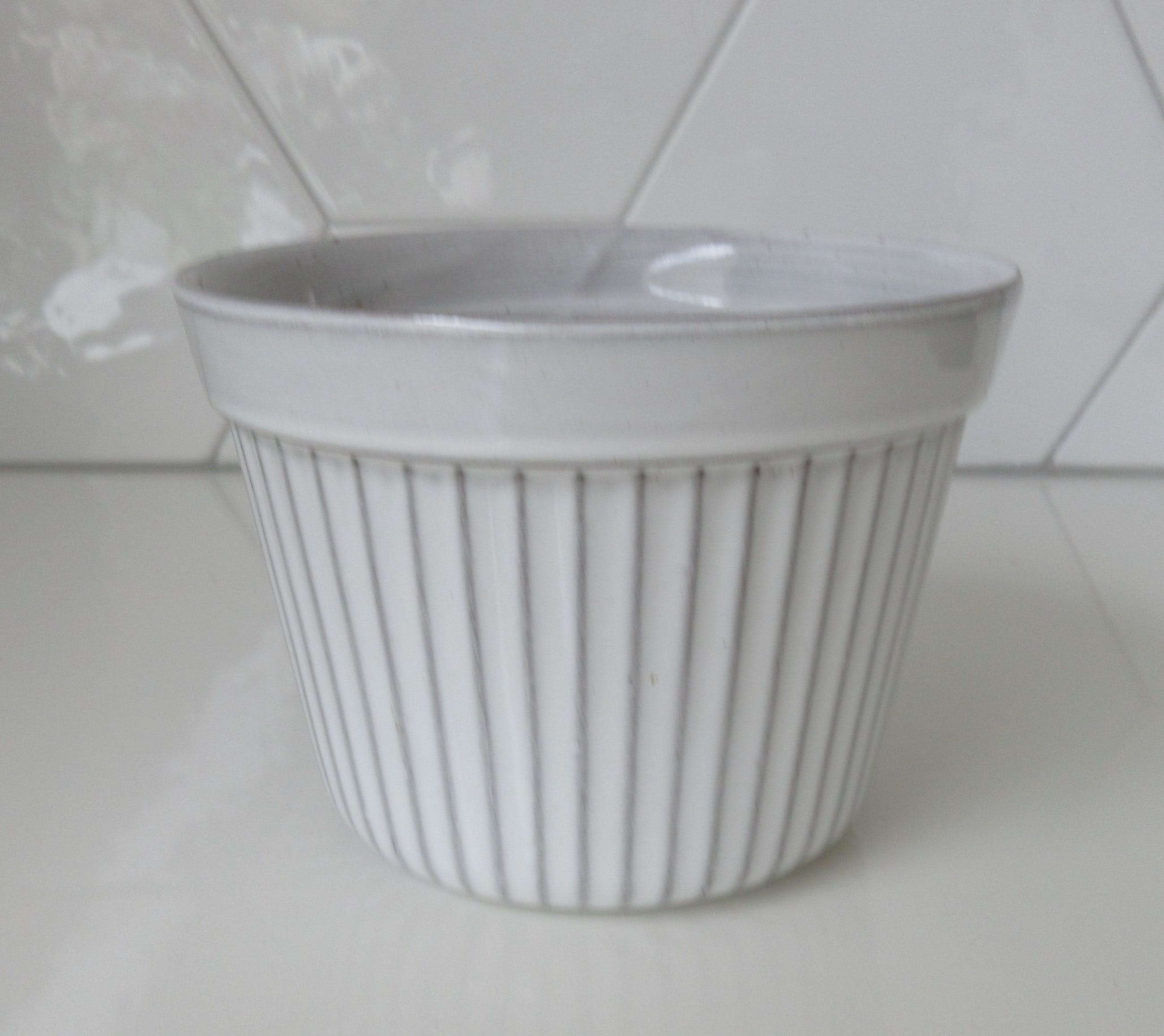 Wit geglazuurde platenter model 271, heeft een aantal glazuurflinters op de bovenrand. Afmetingen; 14 cm hoog en 15 cm in diameter