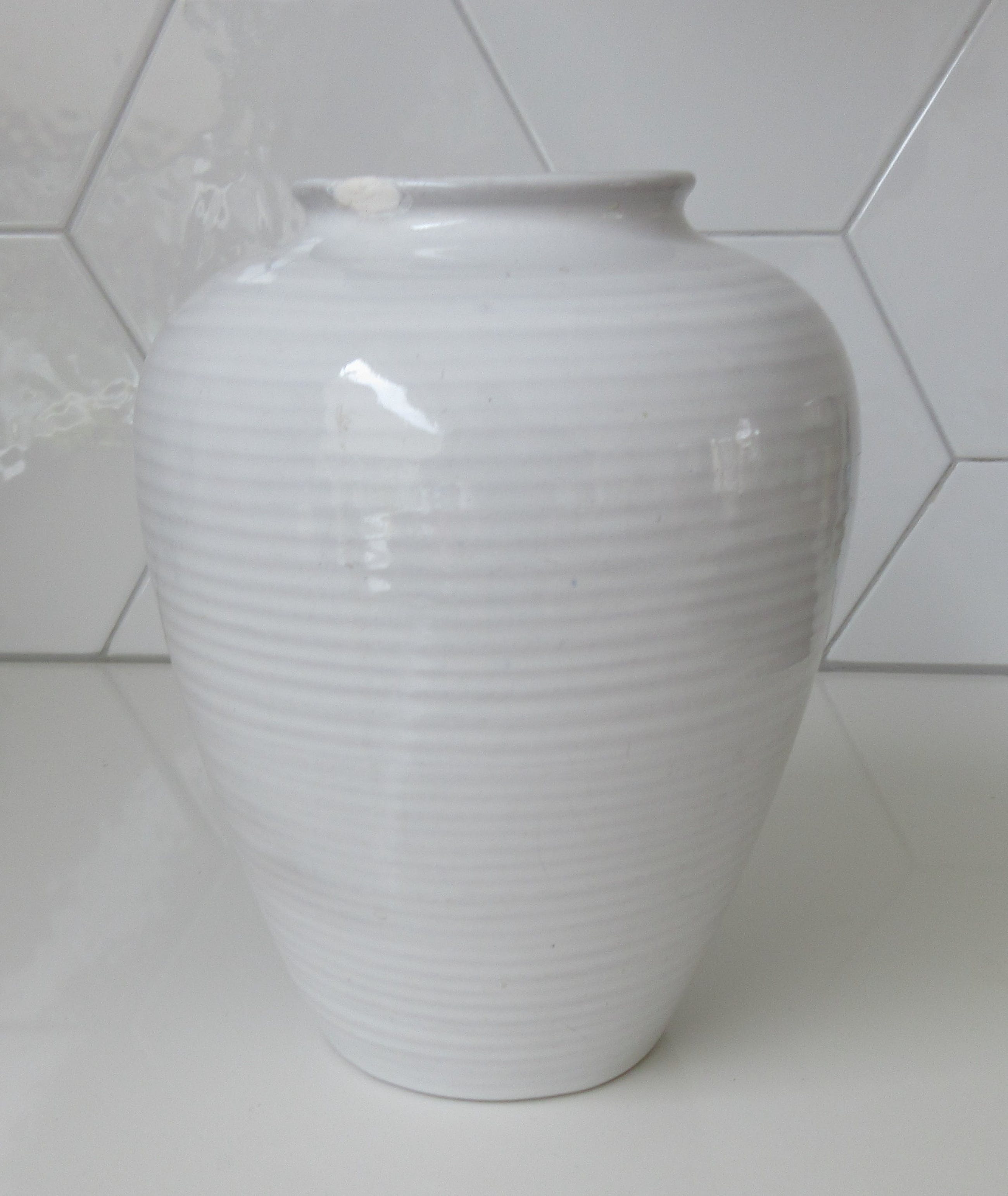 Wit glegazuurde vaas model 072, heeft helaas een reparatie aan de bovenrand. Afmetingen; 18 cm hoog en 9 cm in diameter