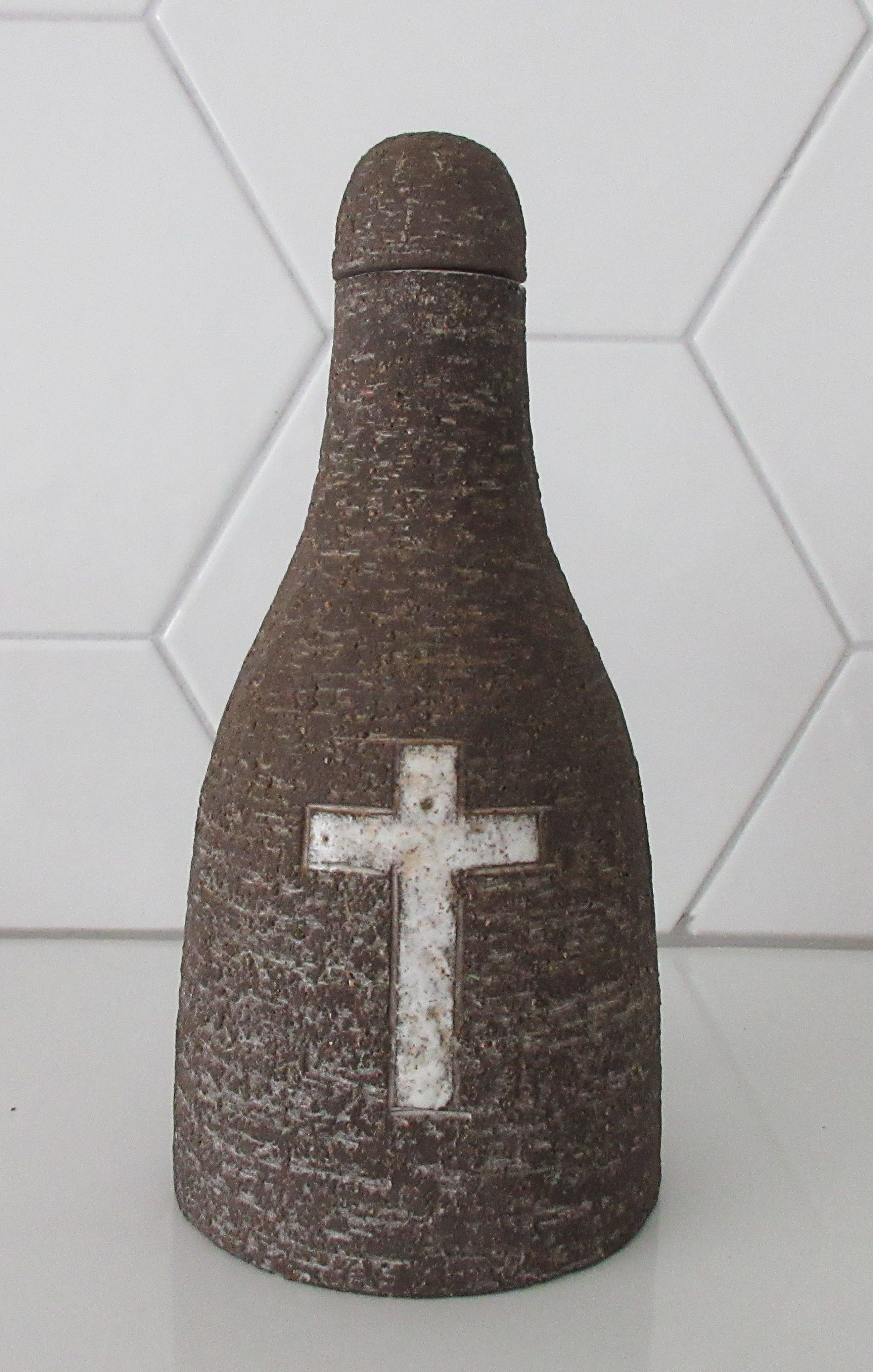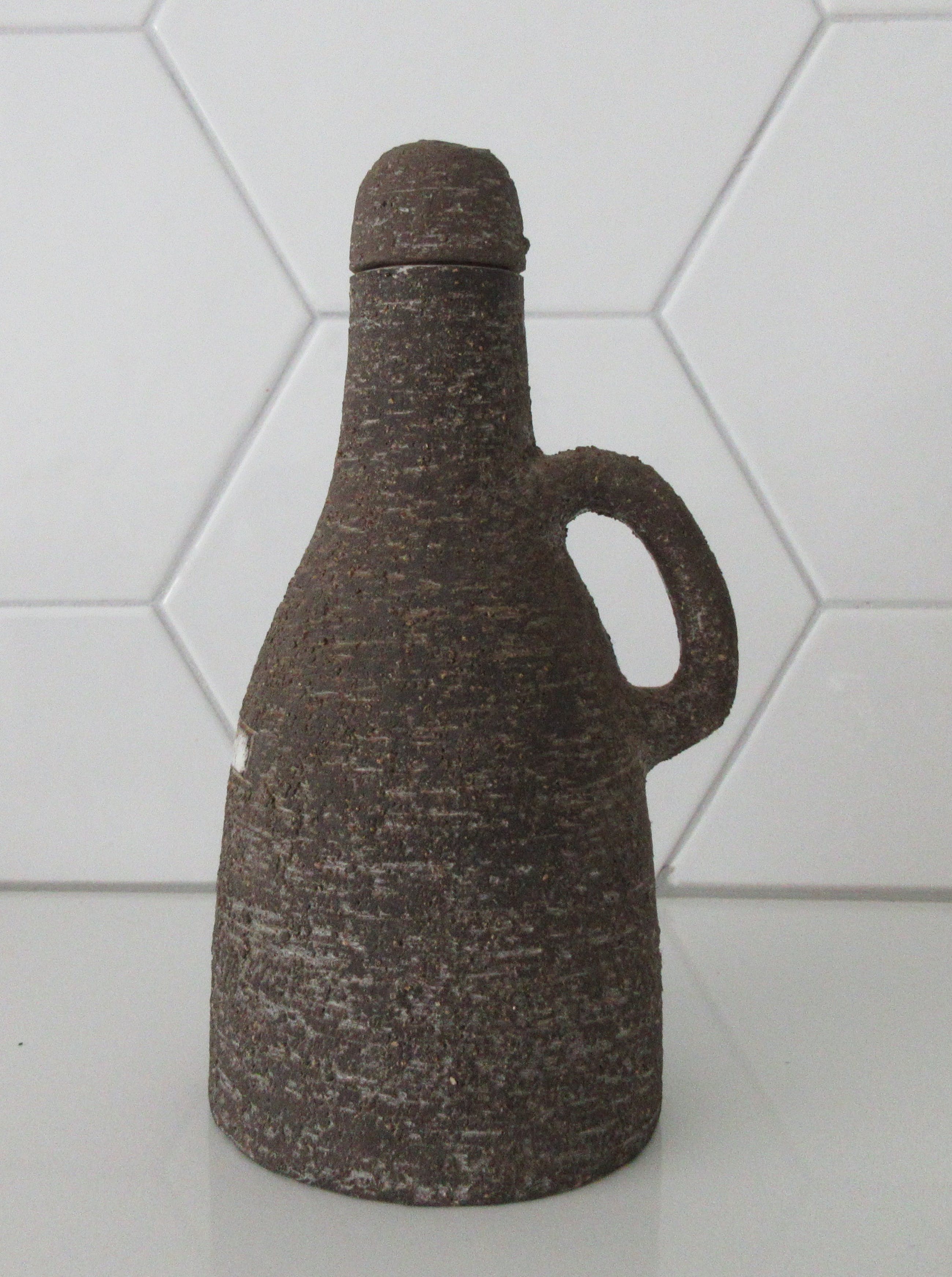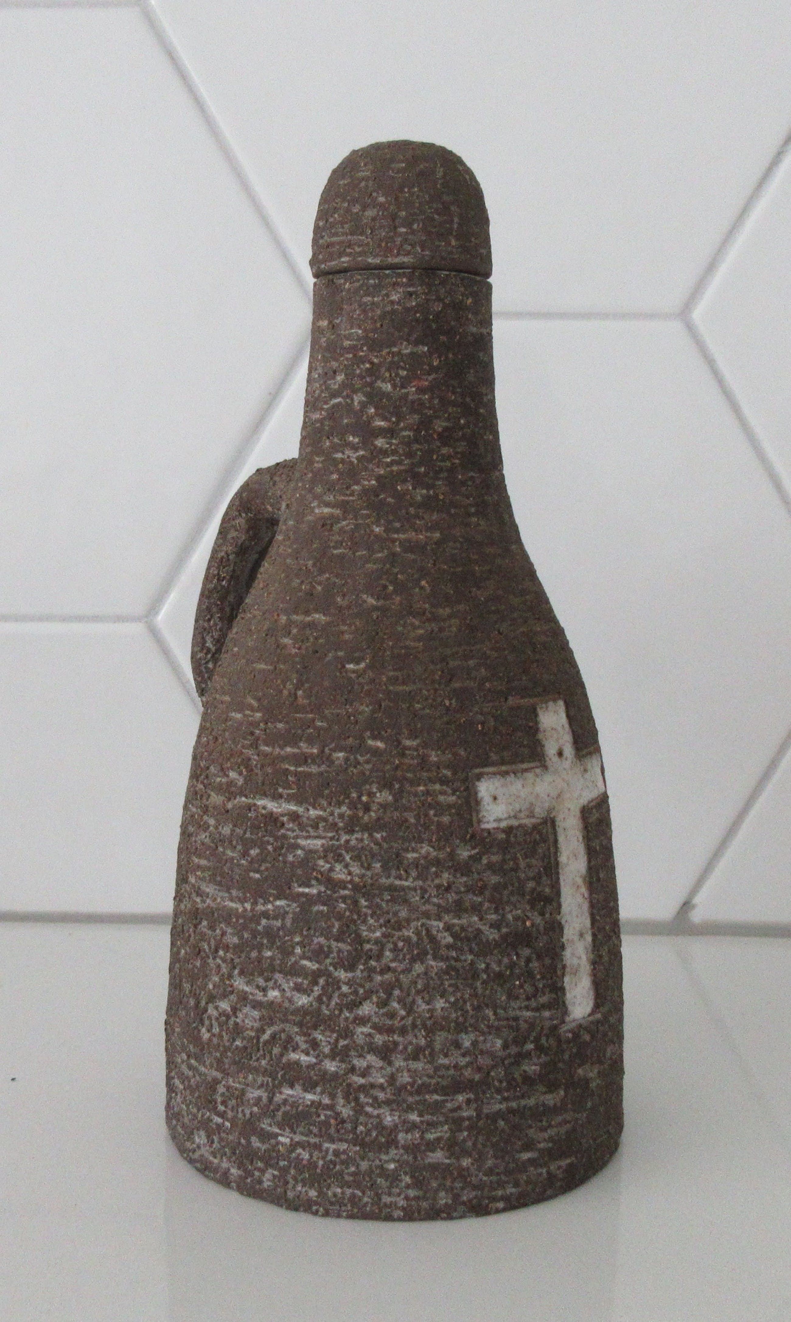 Leendert Blok Chanoir aardewerken wijwater kruik. In bruin met wit geglazuurde decoratie. Mooi stukje vintage keramiek. In prima onbeschadigde conditie. Aan de achterzijde gemerkt en genummerd; H 15-21.