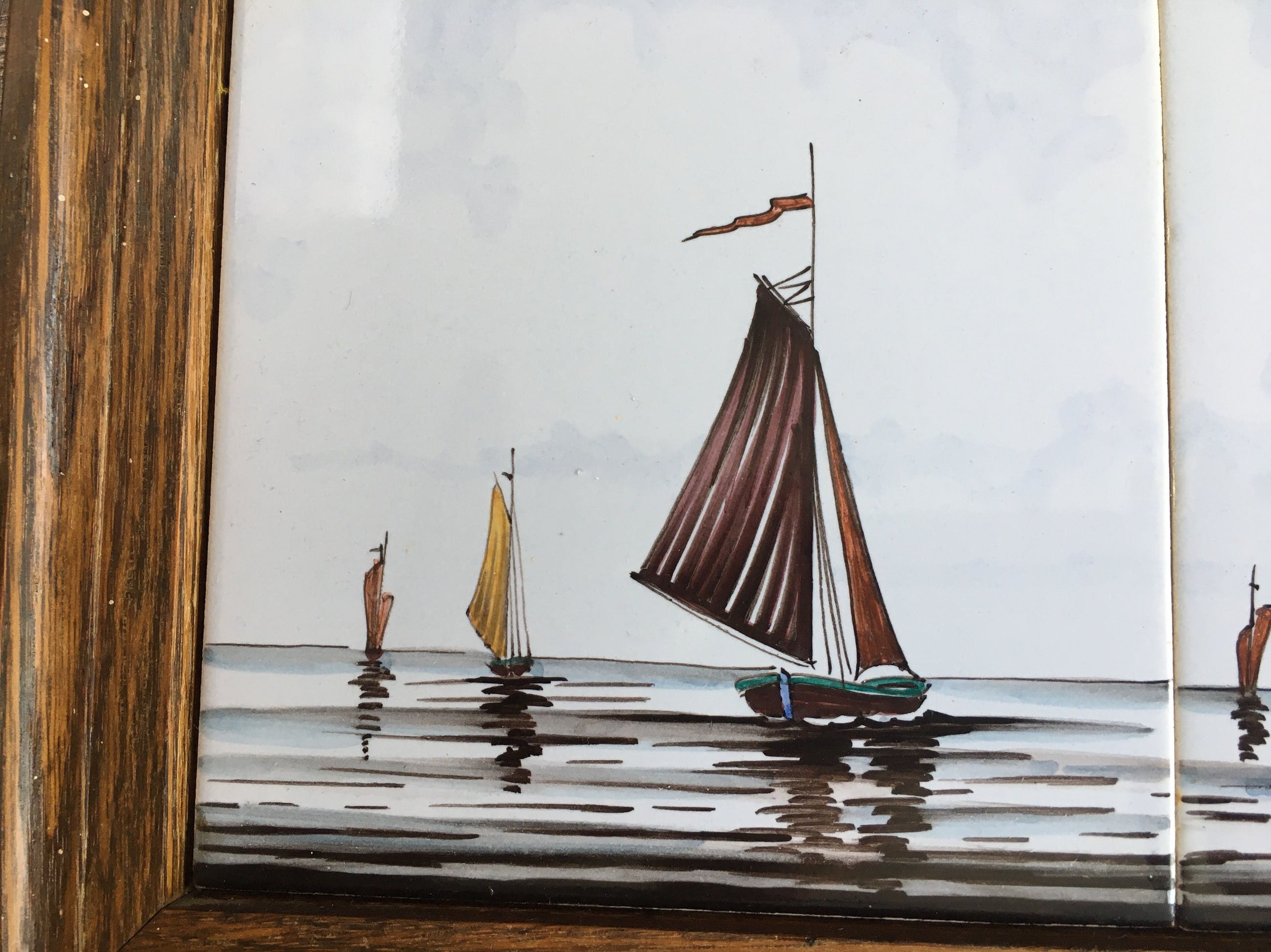 Drie handbeschilderde tegeltjes 13x13cm in opeenvolgende fase. Eiken lijst en triplex rug. Westraven A1661
