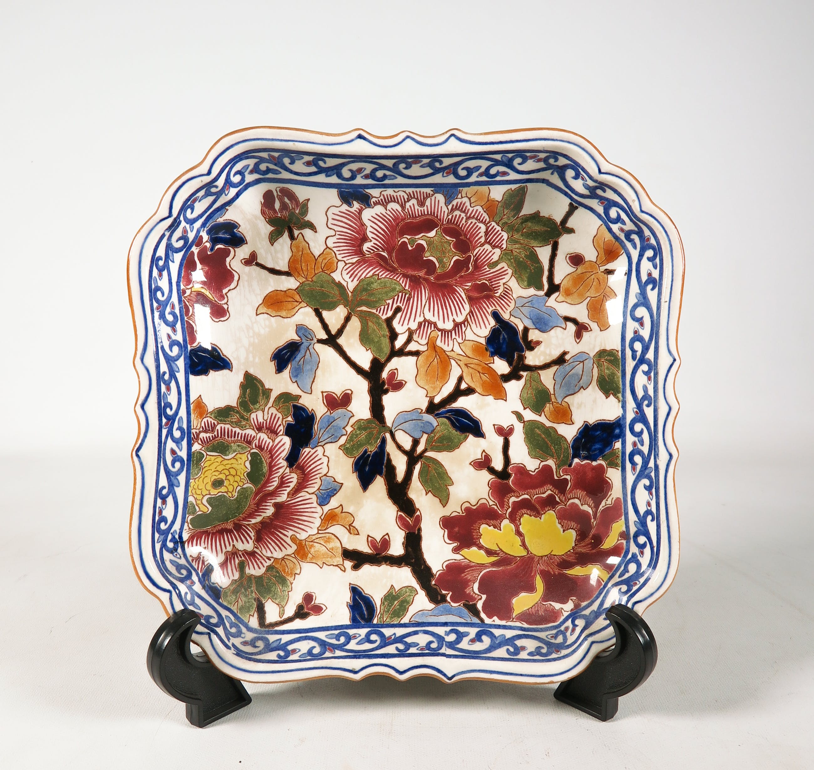 Geglazuurde aardewerken schaal met veelkleurig decoratie. De bloemendecoratie is met de hand beschilderd, het blauwe kader is aangebracht middels transfers.