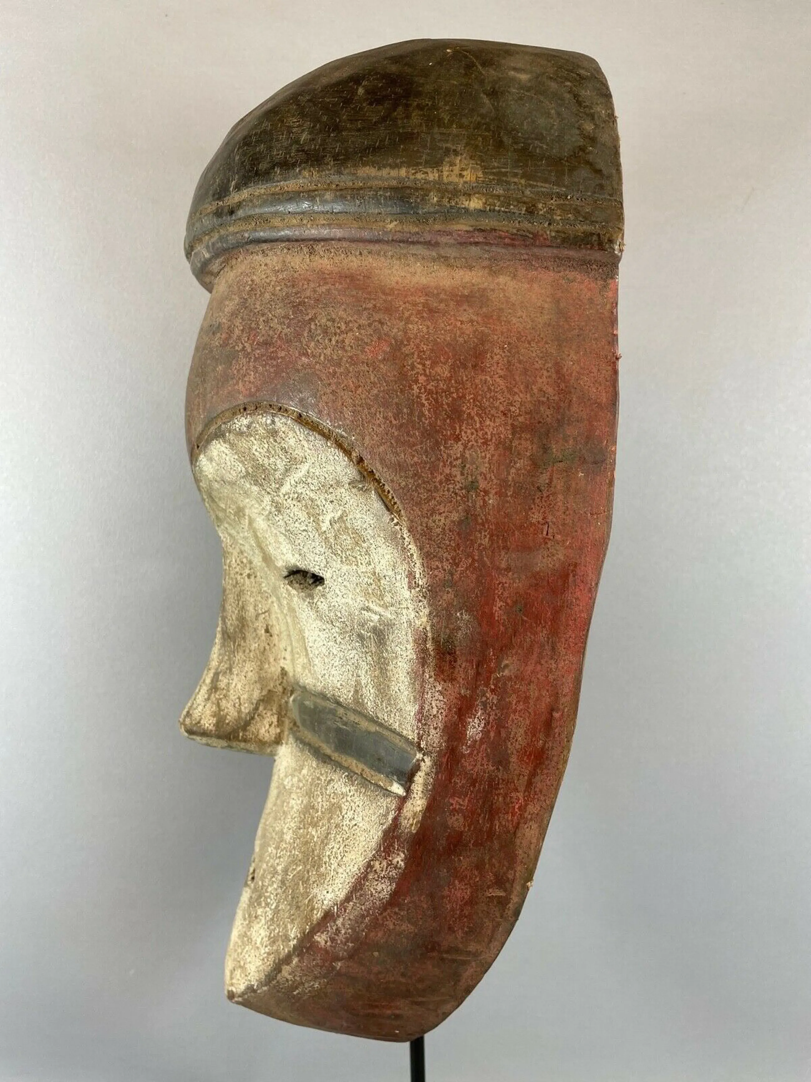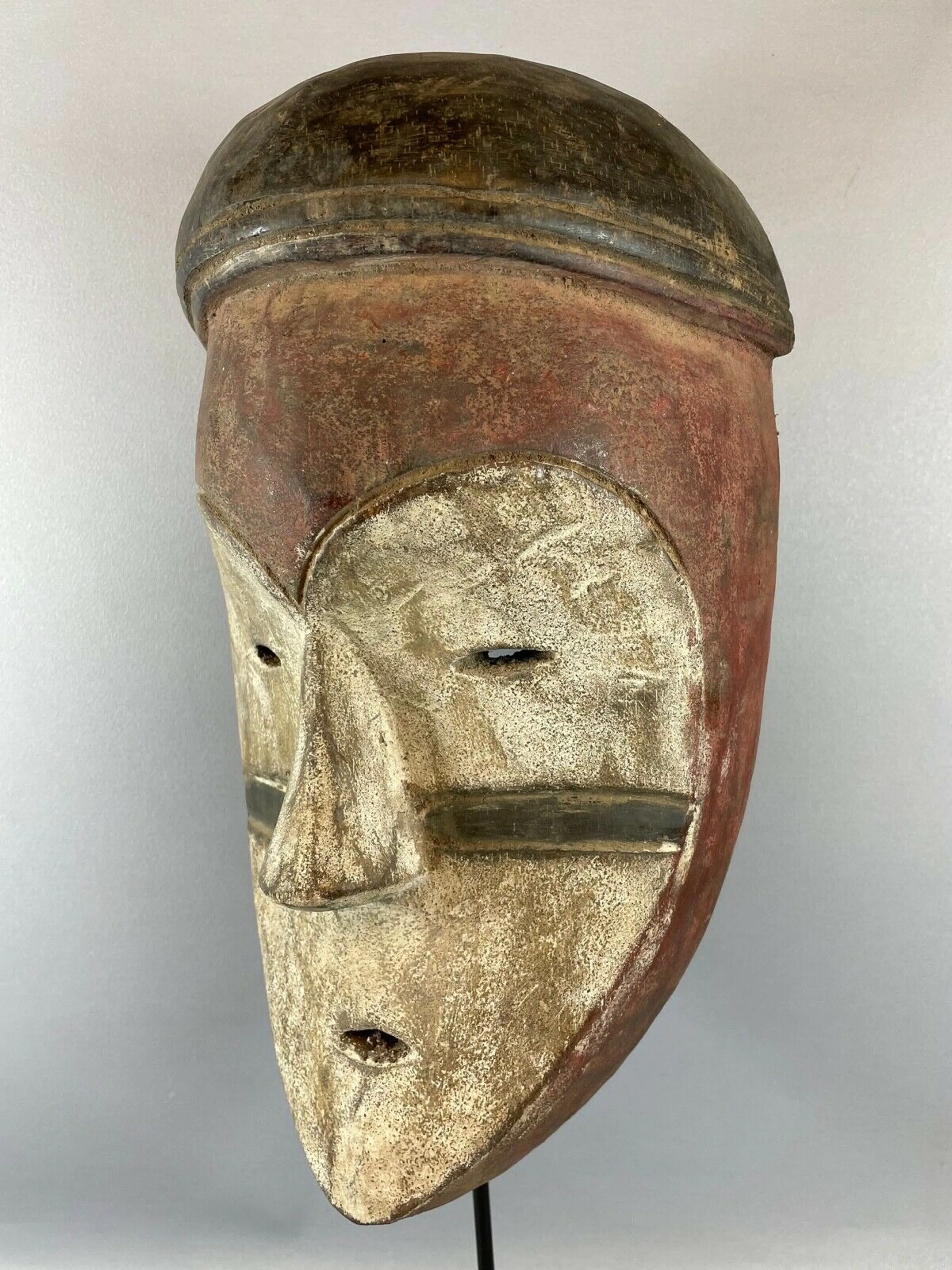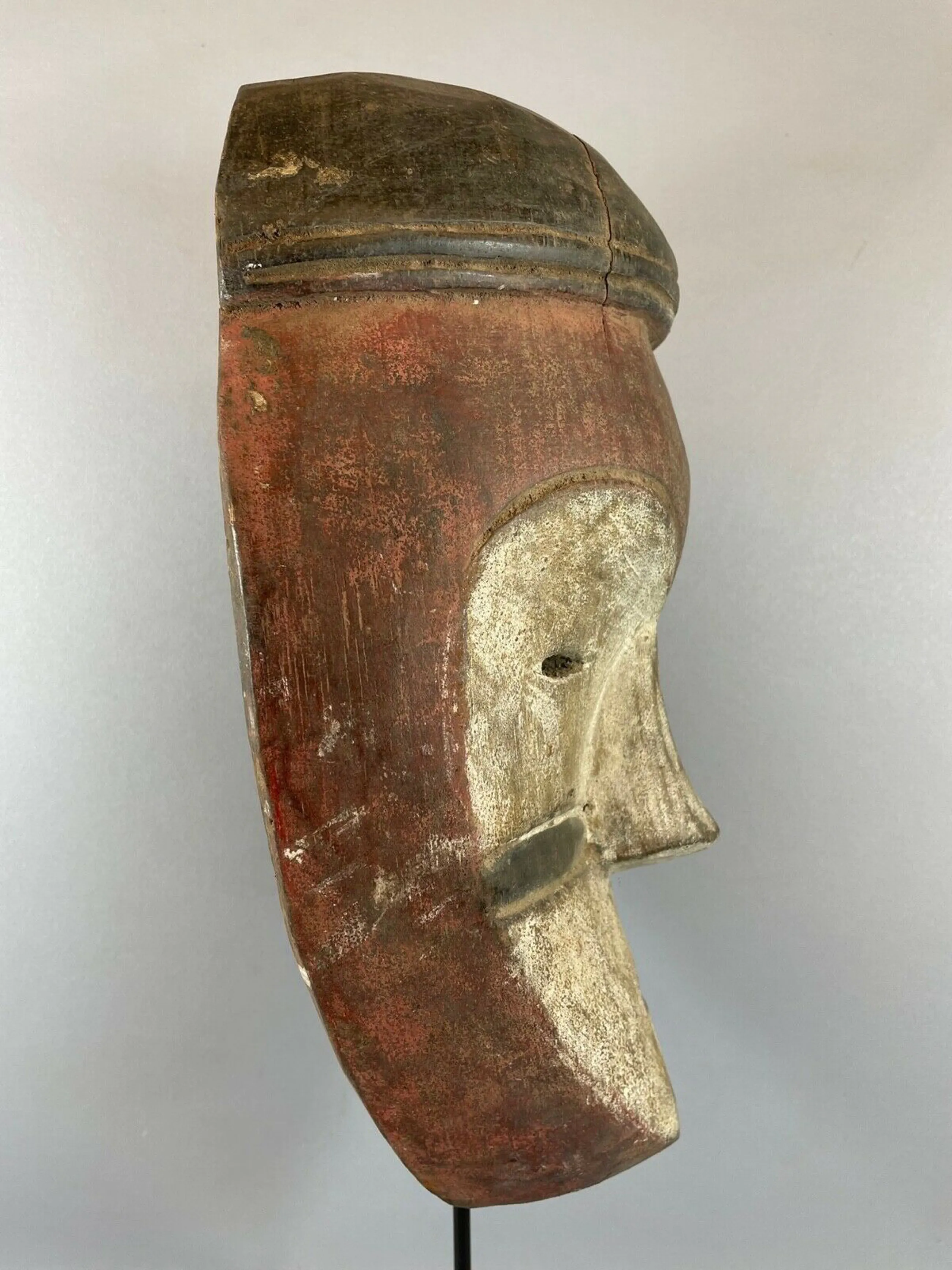 Very expressive african mask with from the Fang, Gabon.This type of mask is used for entertainment of the spectators on festive occasions.Hand carved from a single piece of wood, with color pigments.Height: 35 cm.
