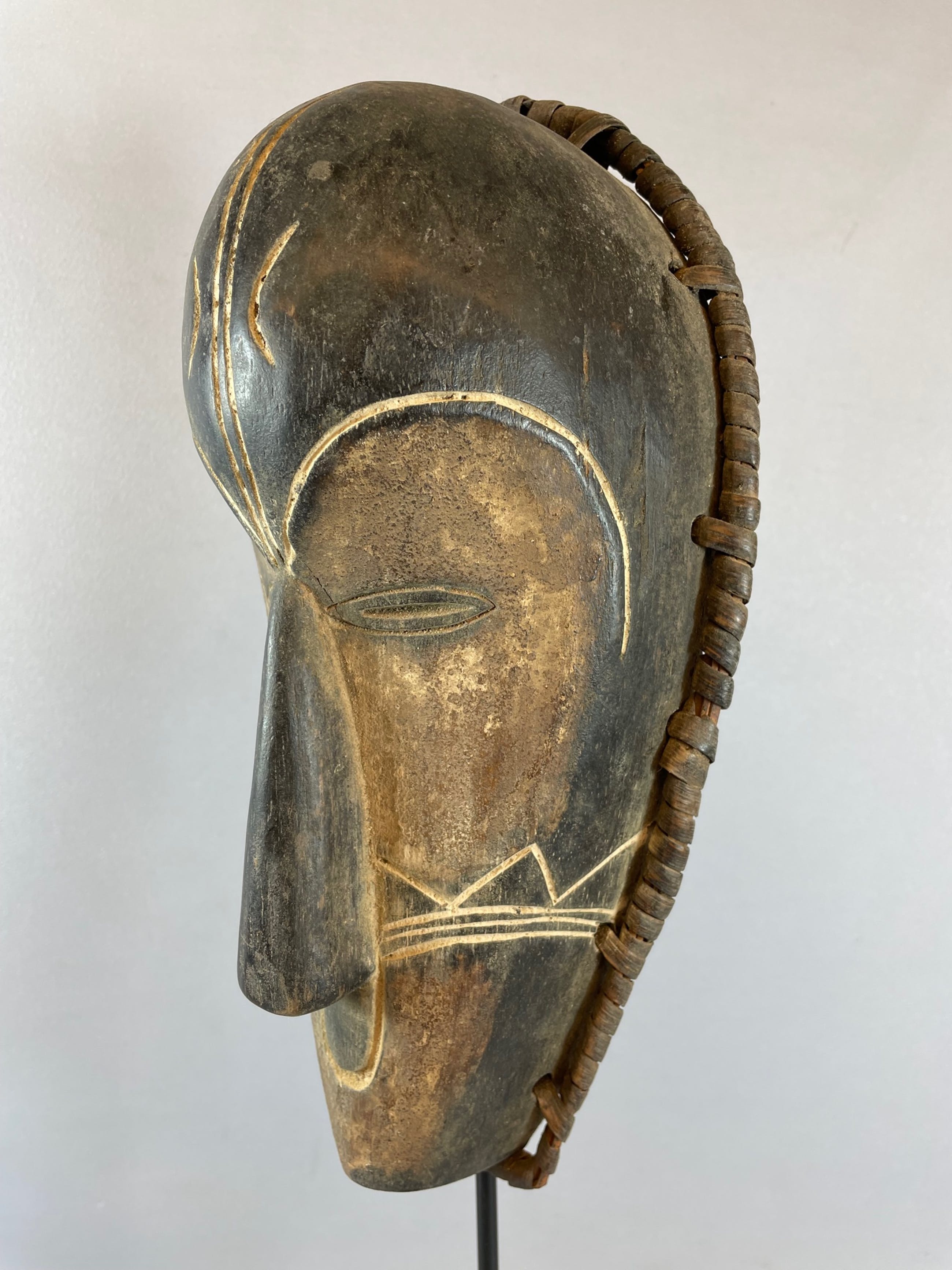 Very expressive african mask with from the Fang, Gabon.This type of mask is used for entertainment of the spectators on festive occasions.Hand carved from a single piece of wood, with color pigments.Height: 29 cm.