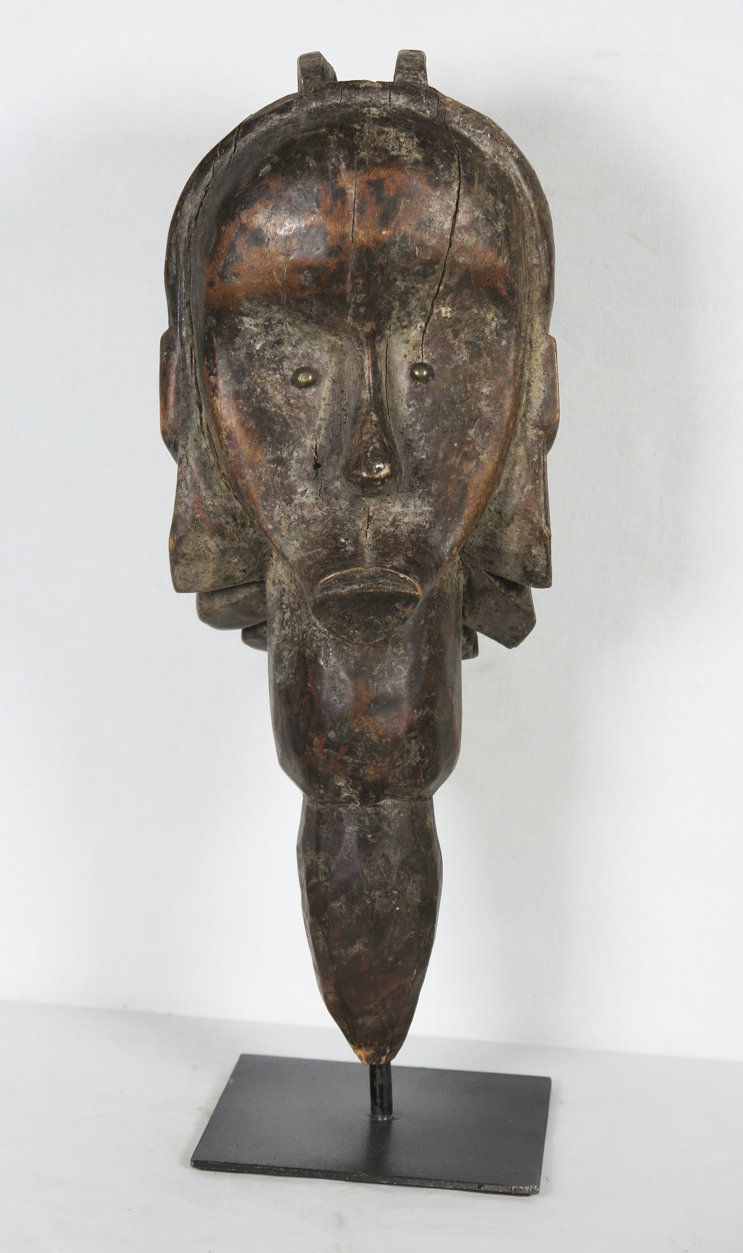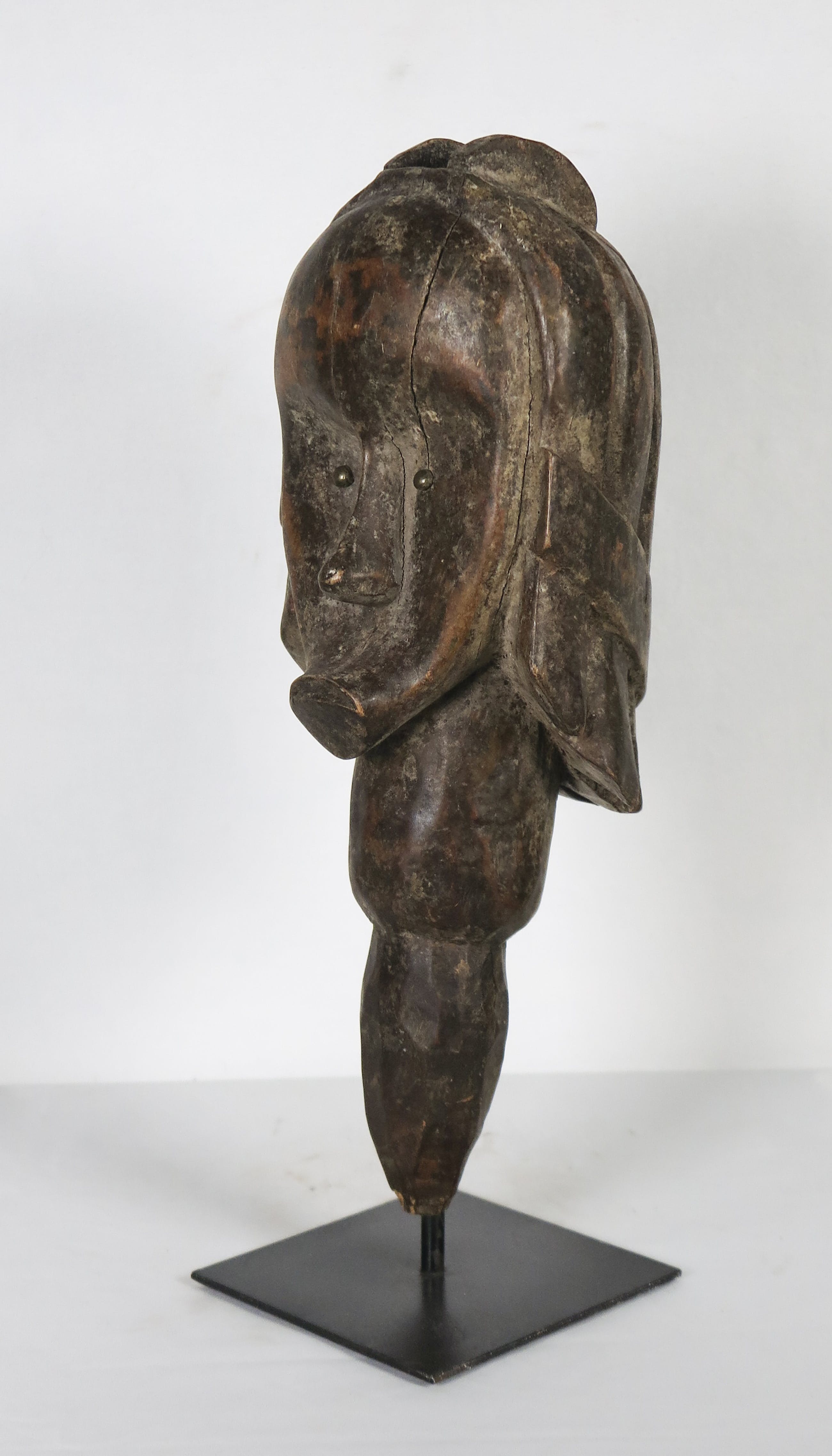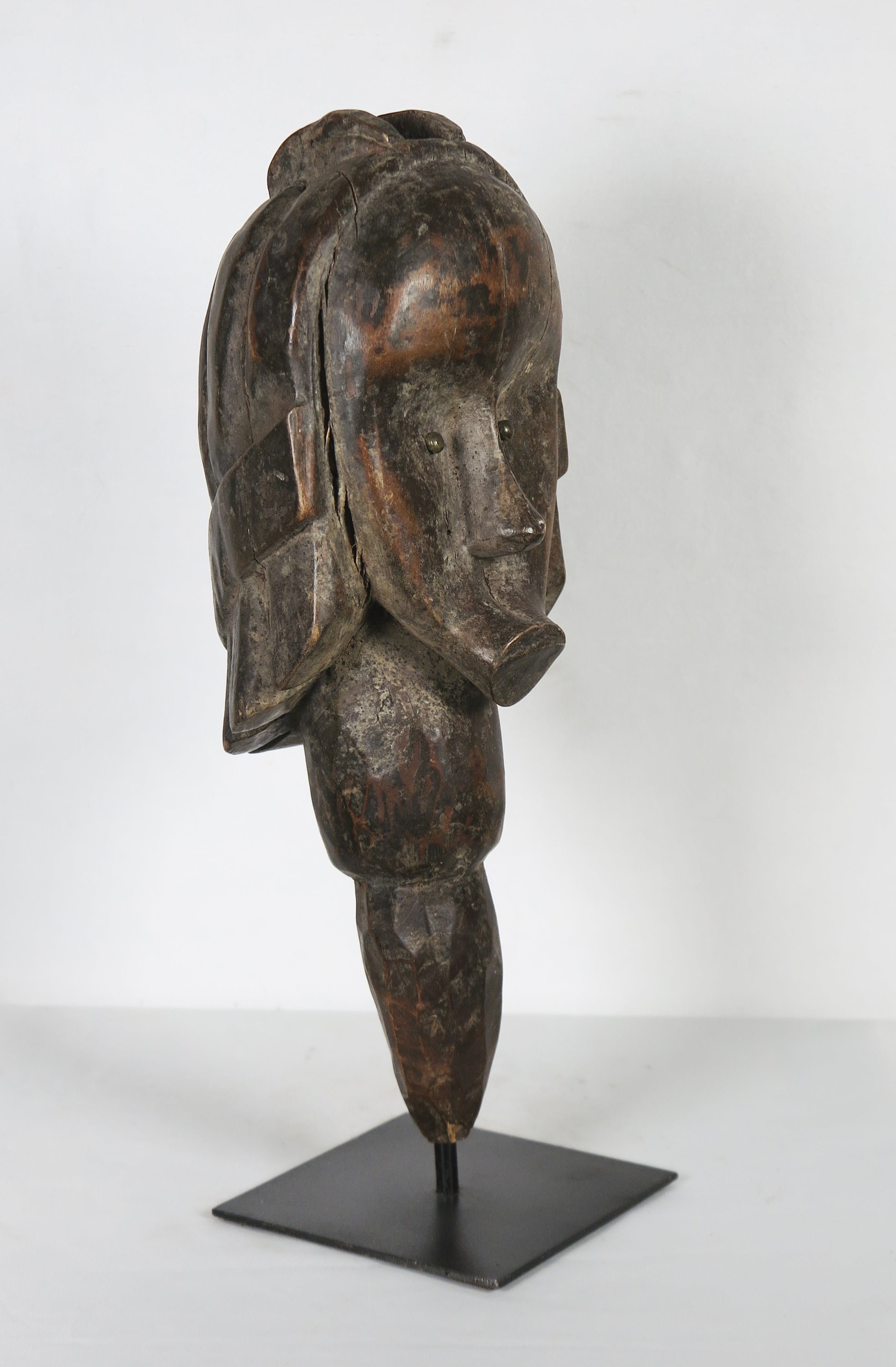Houten beeld op metalen standaard (reliekbeeld) met koperen ogen.