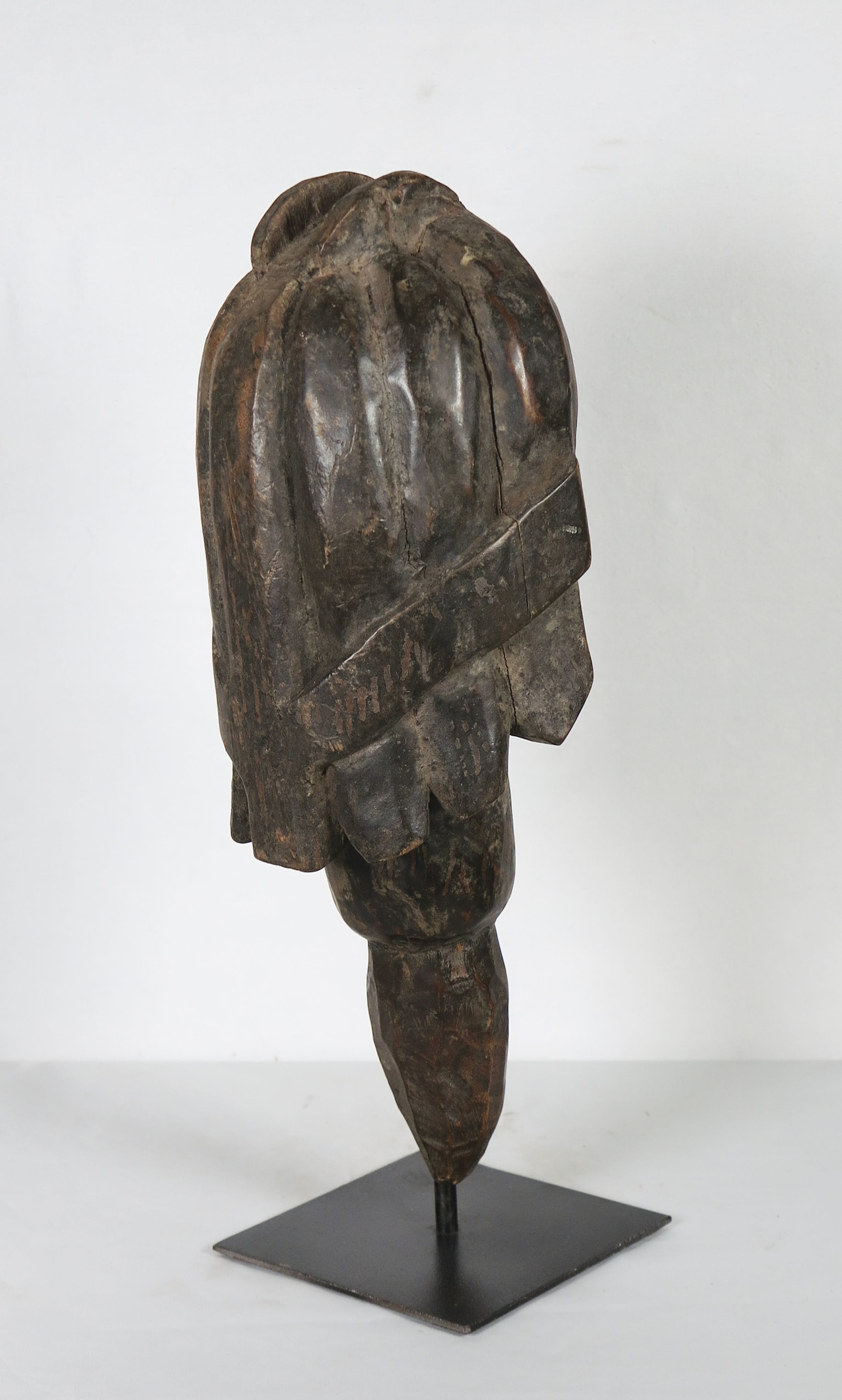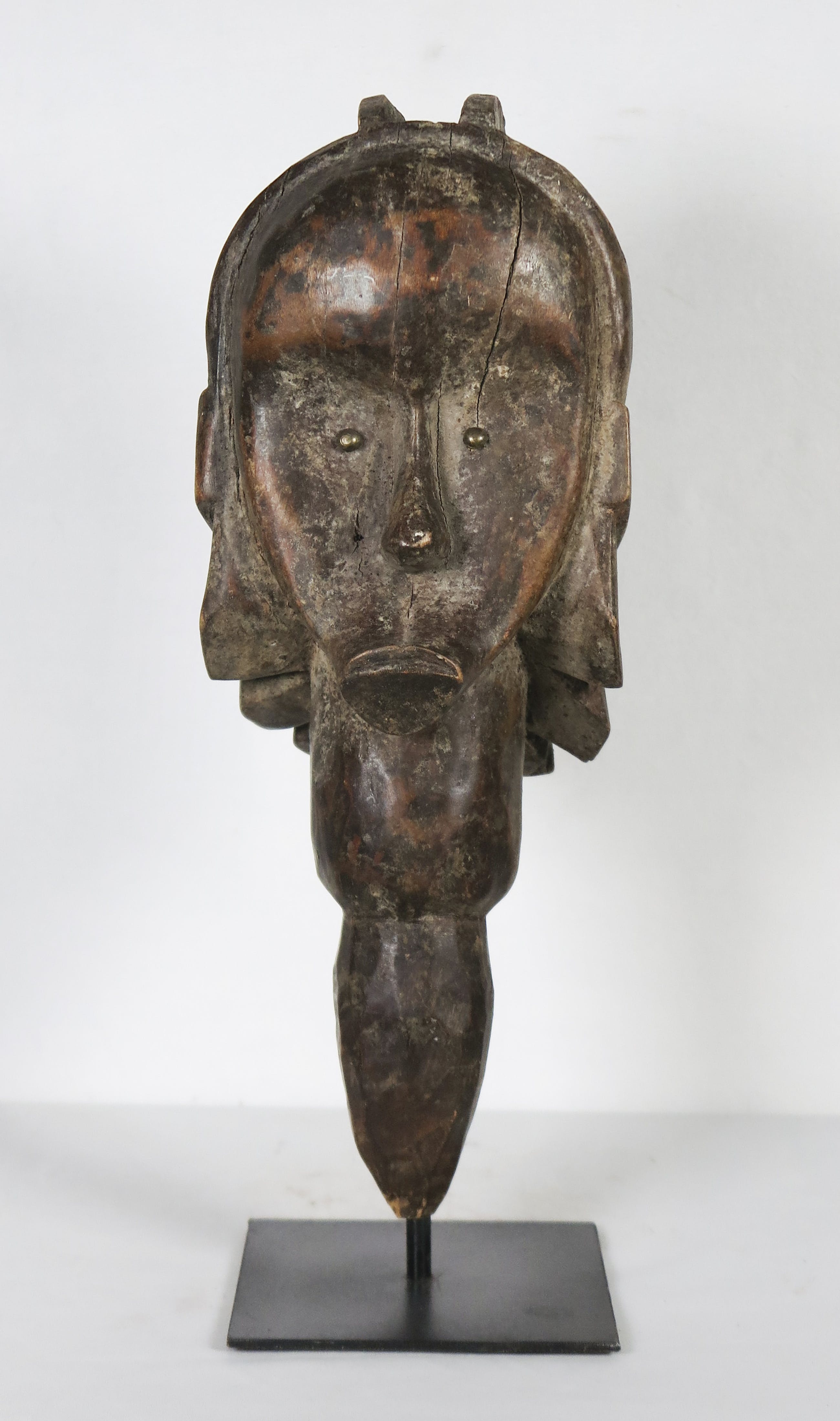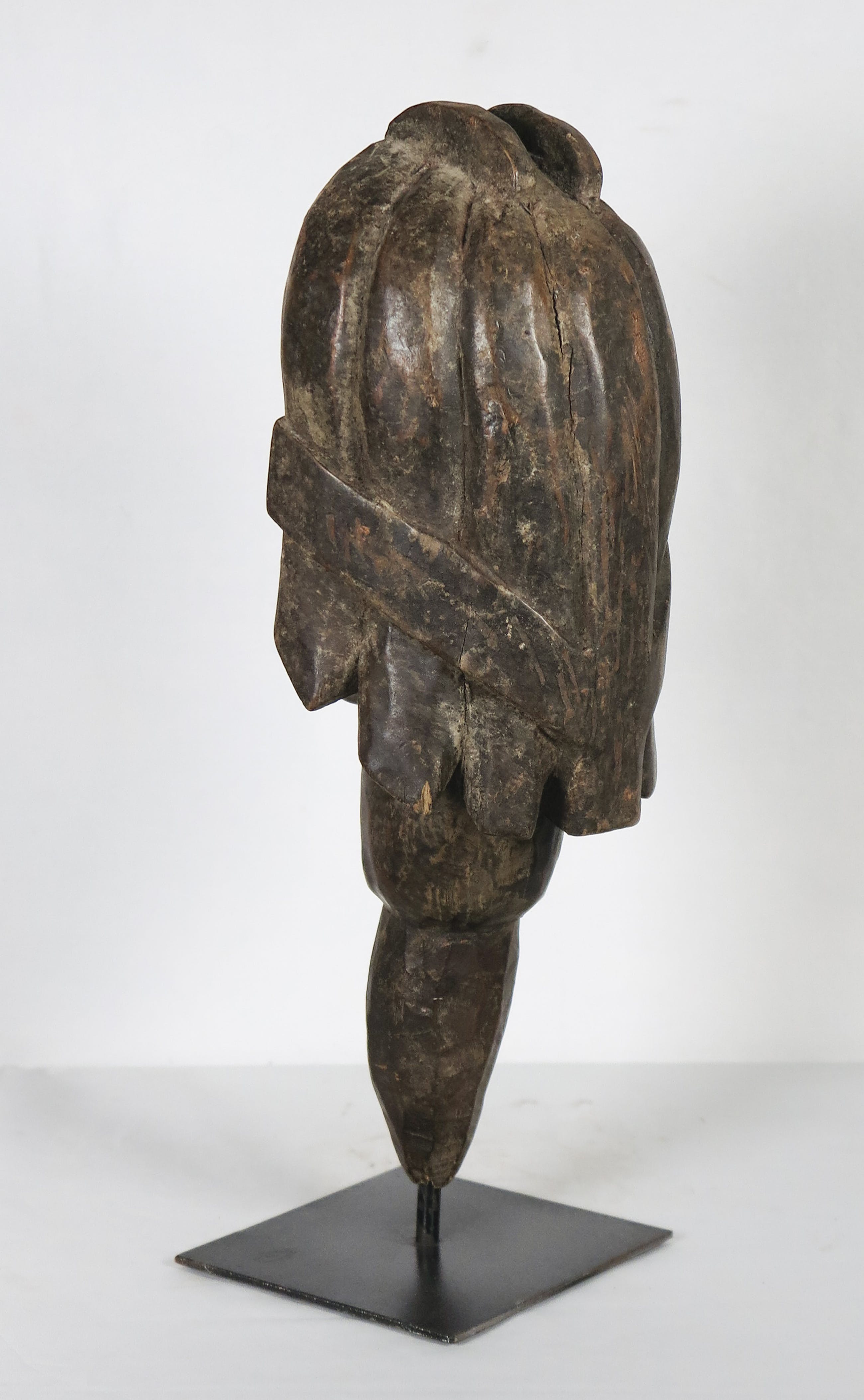 Houten beeld op metalen standaard (reliekbeeld) met koperen ogen.