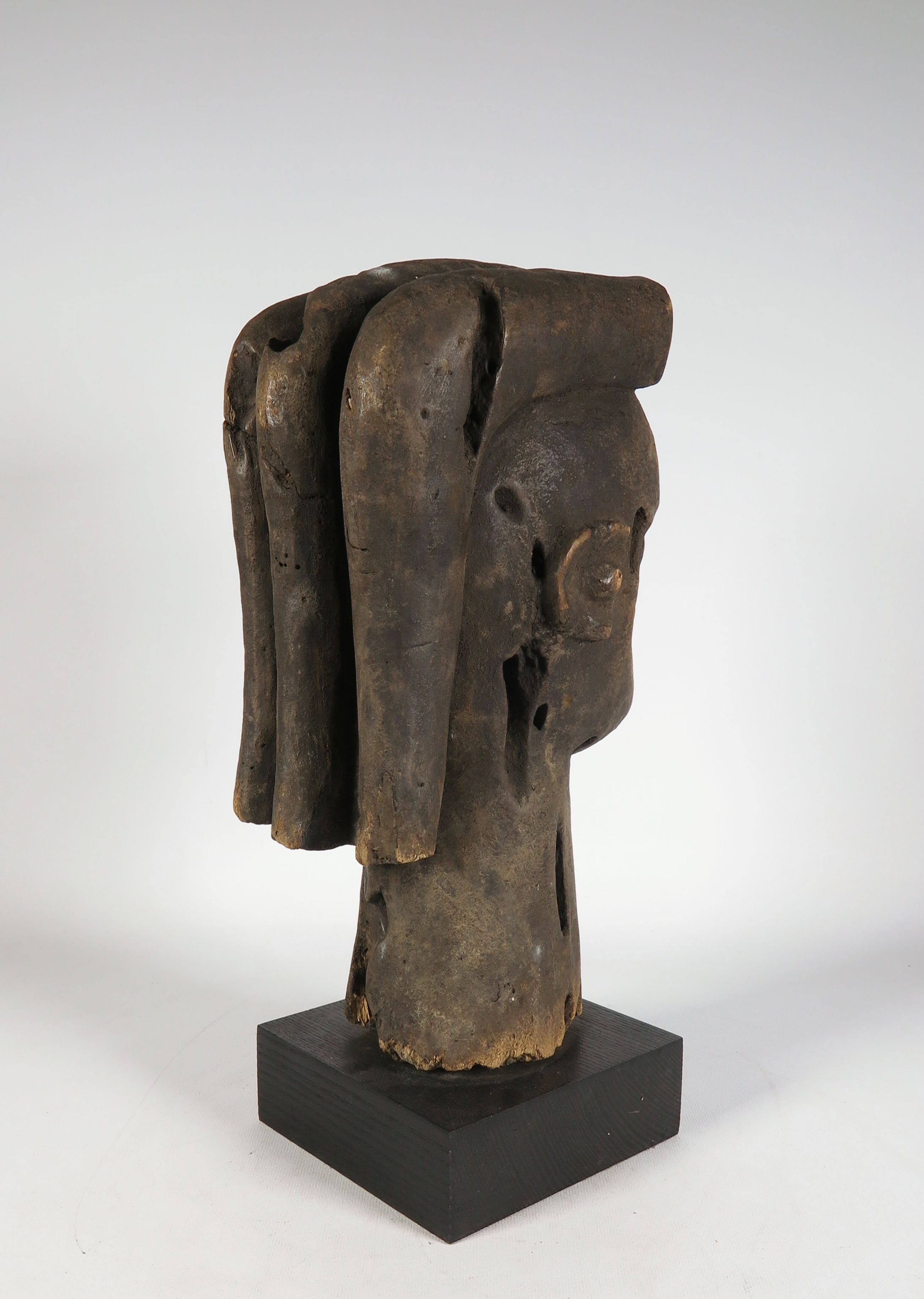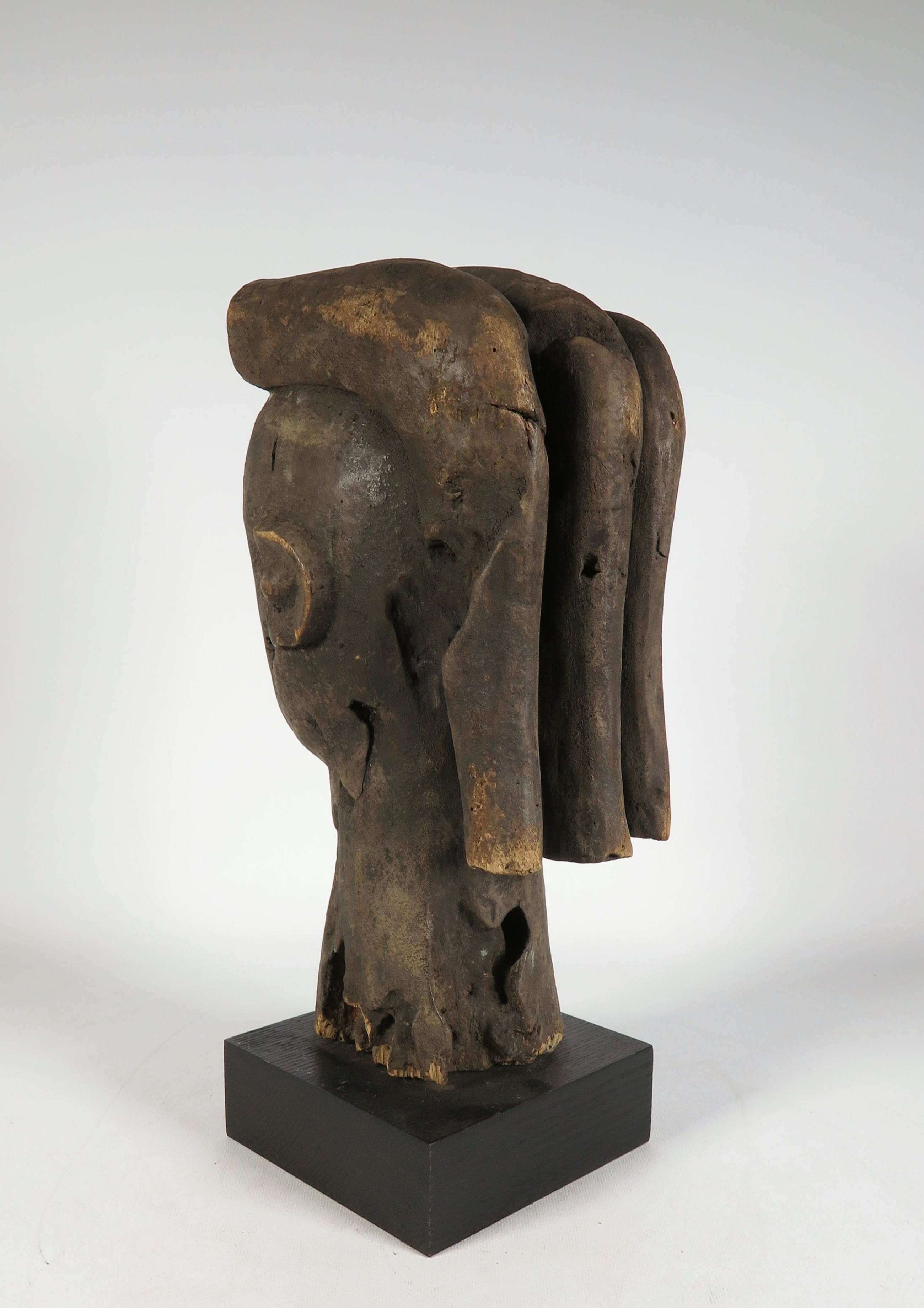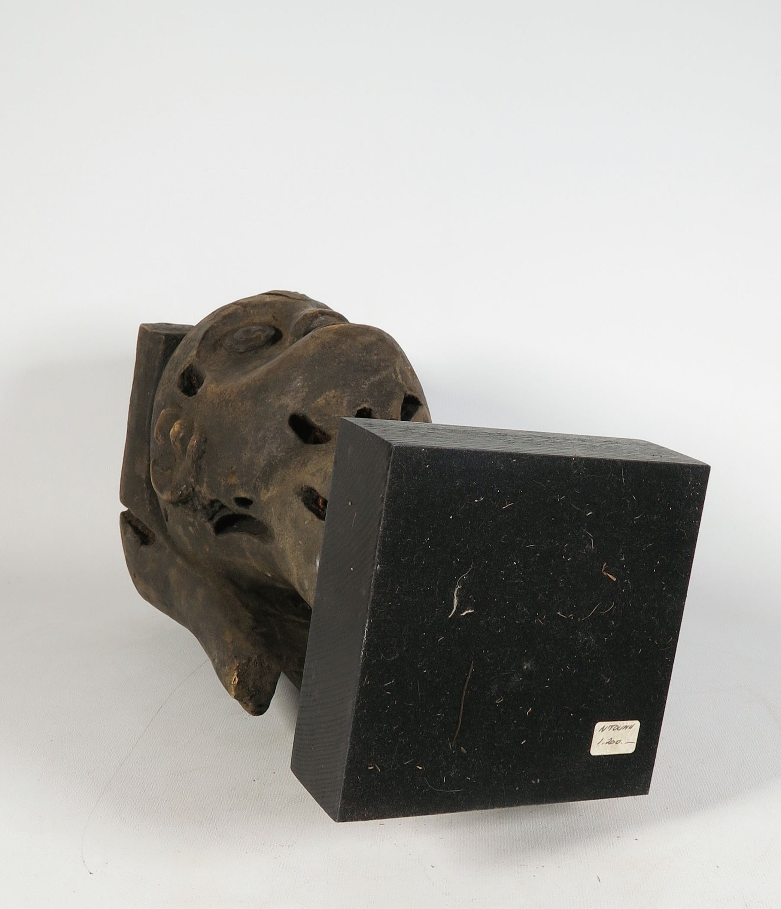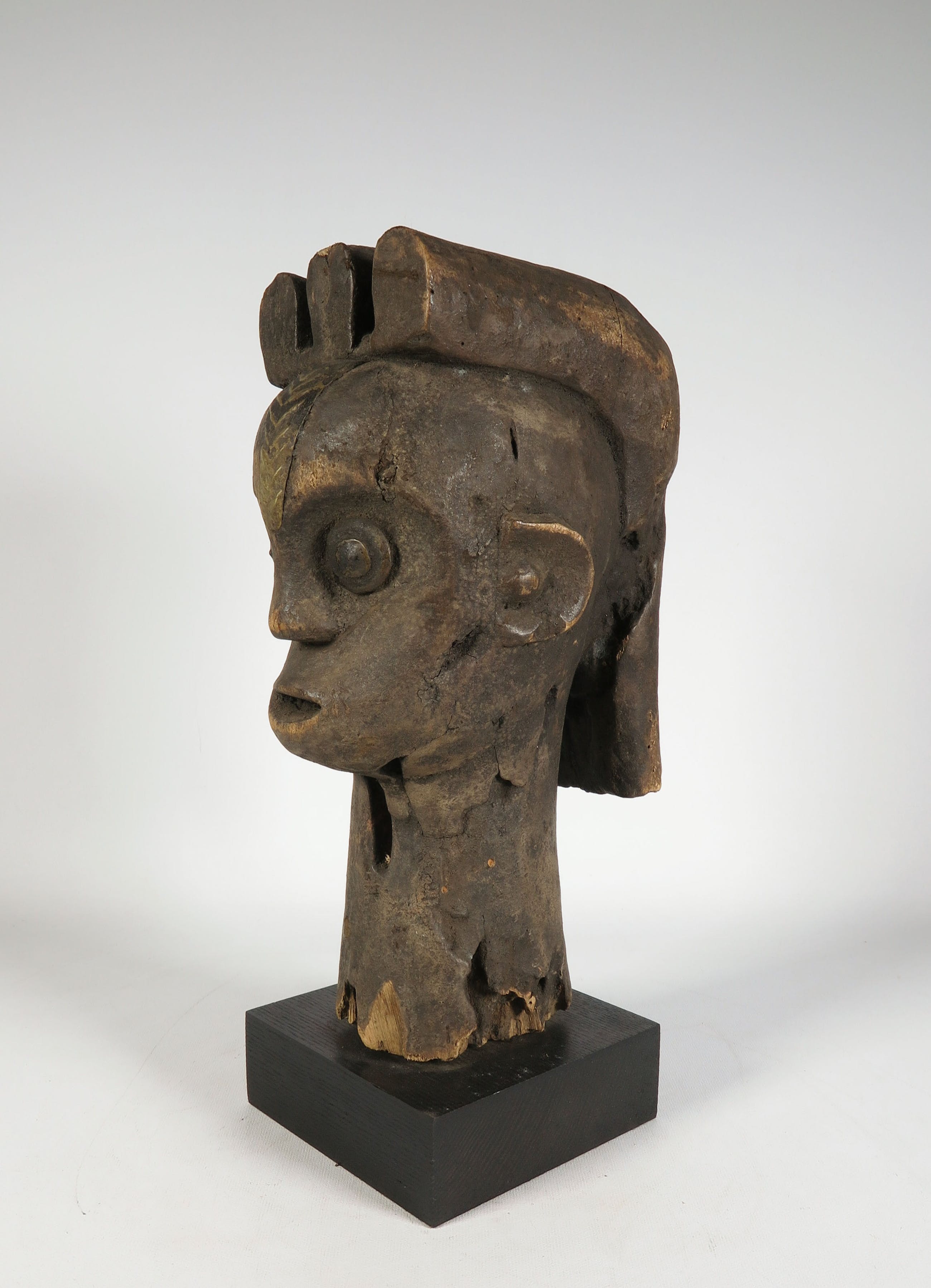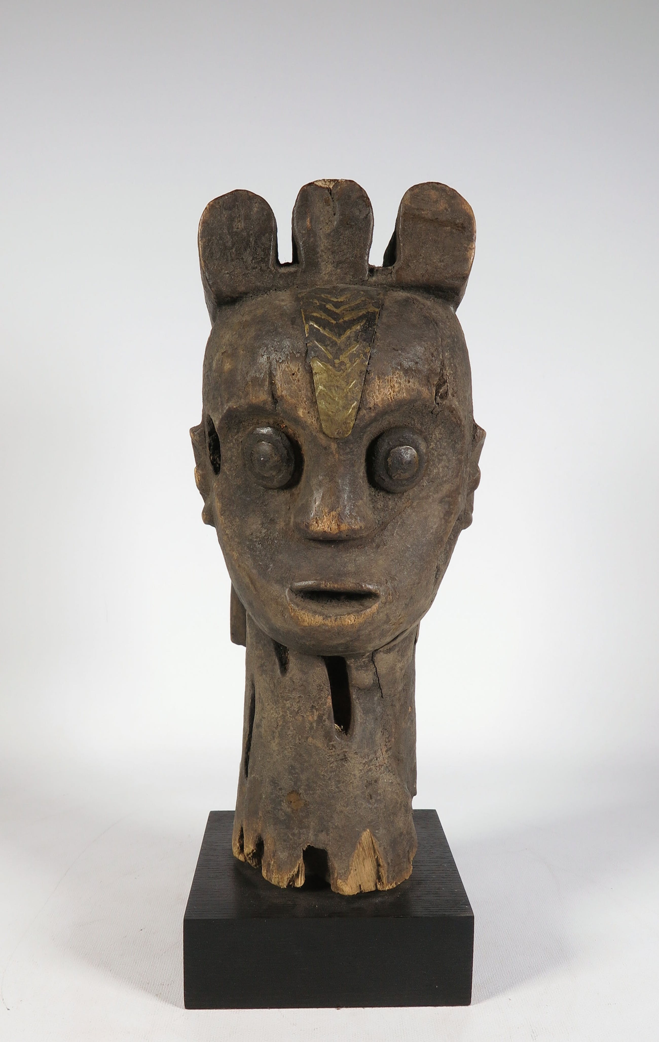 Houten gestoken Fang (stam) portretkop met koperen/messing ogen en sieraad. Herkomst: Gabon.