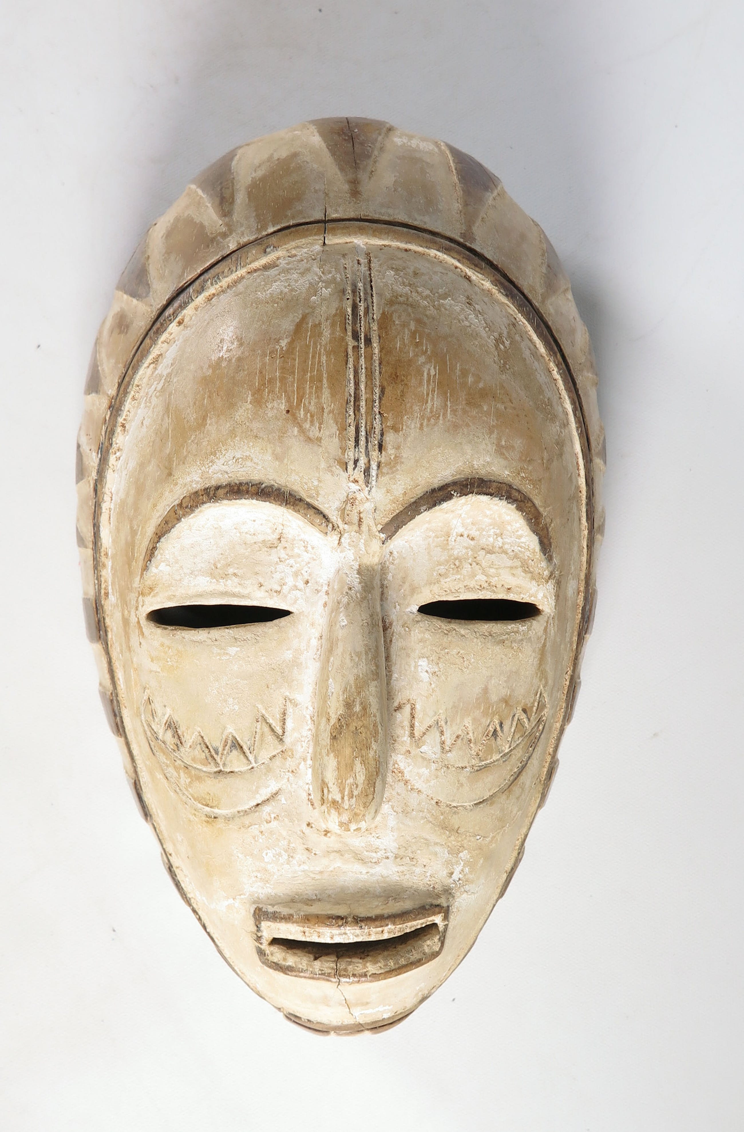 Houten gestoken Fang (stam) masker met spleetogen en rechthoekige mond.