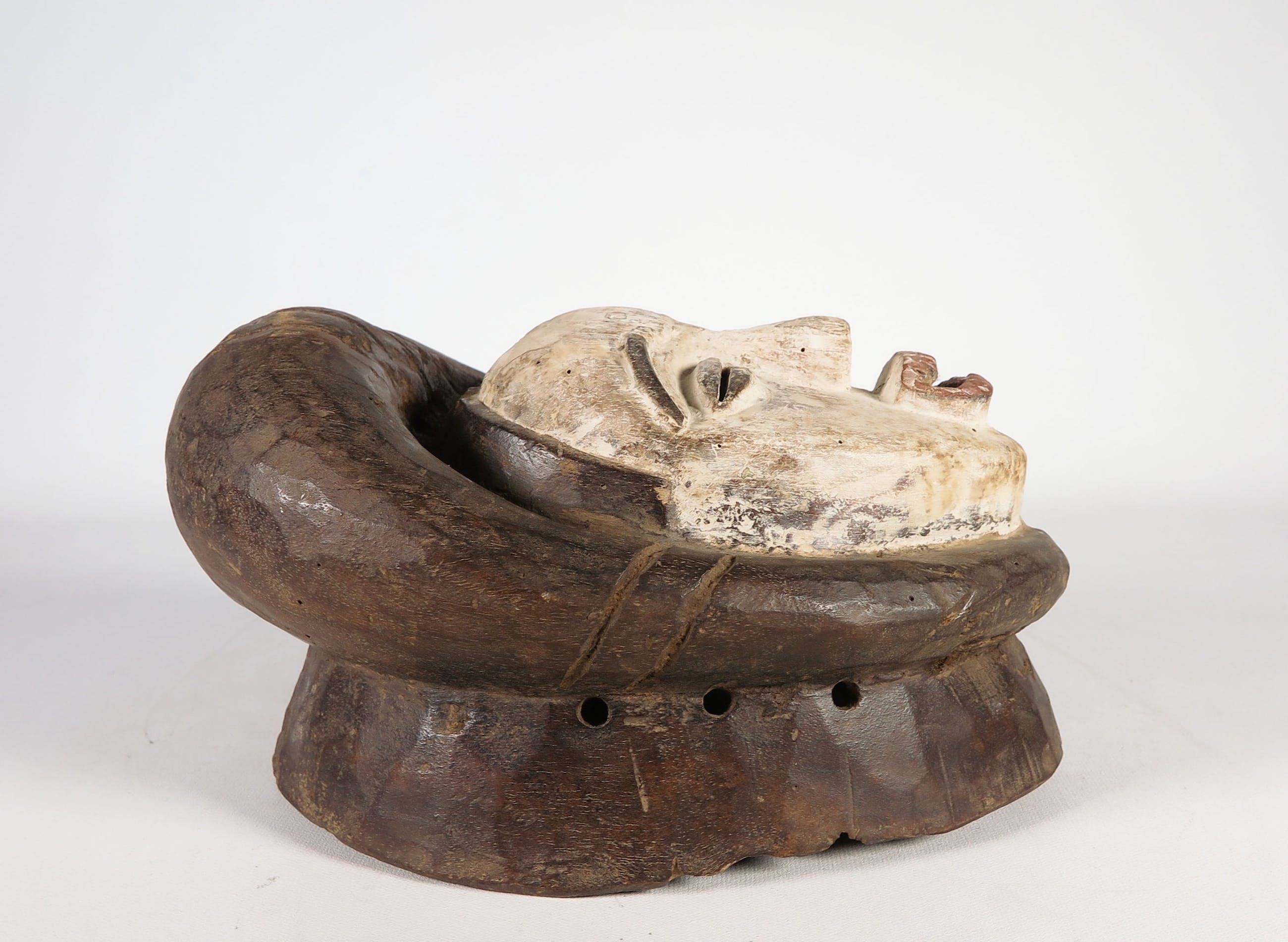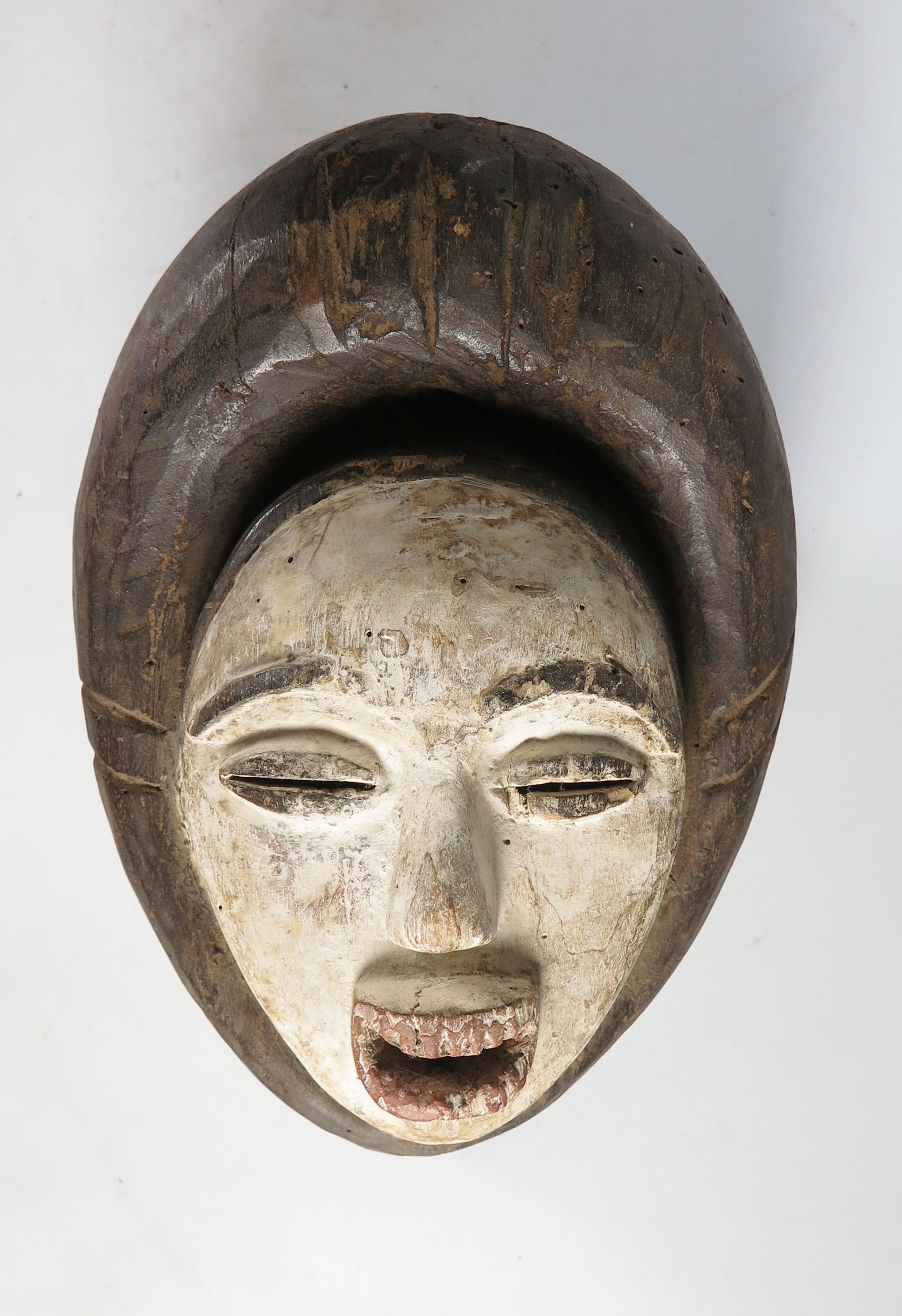 Houten gestoken Fang (stam) deels wit geschilderd masker met spleetogen en open mond.