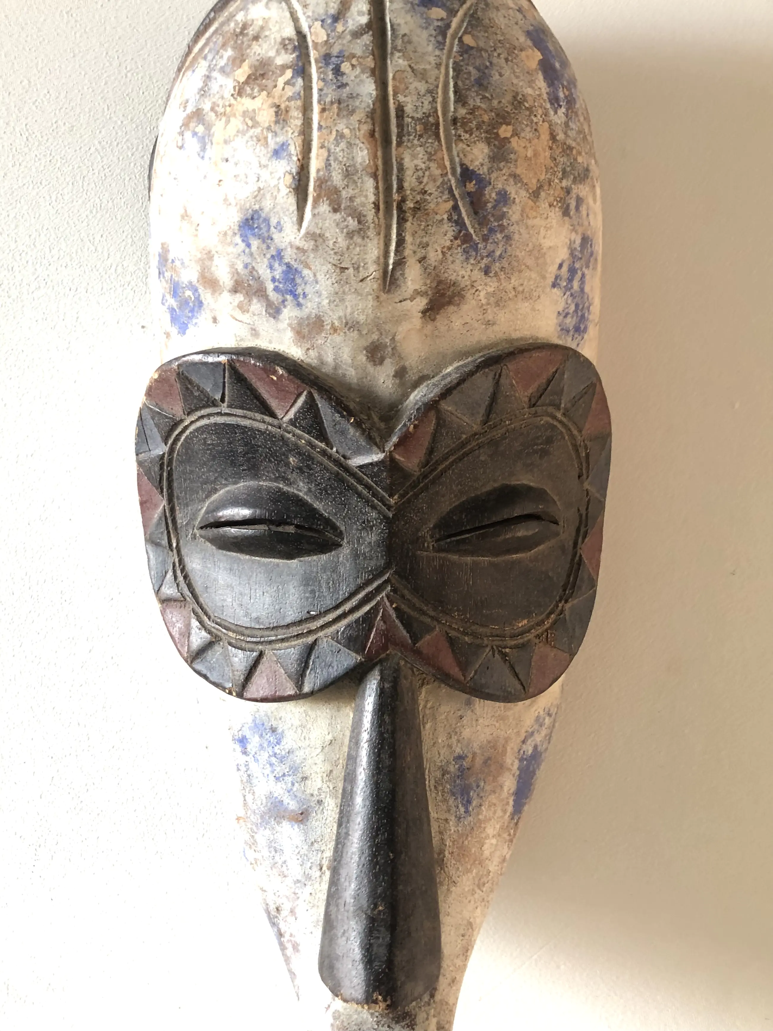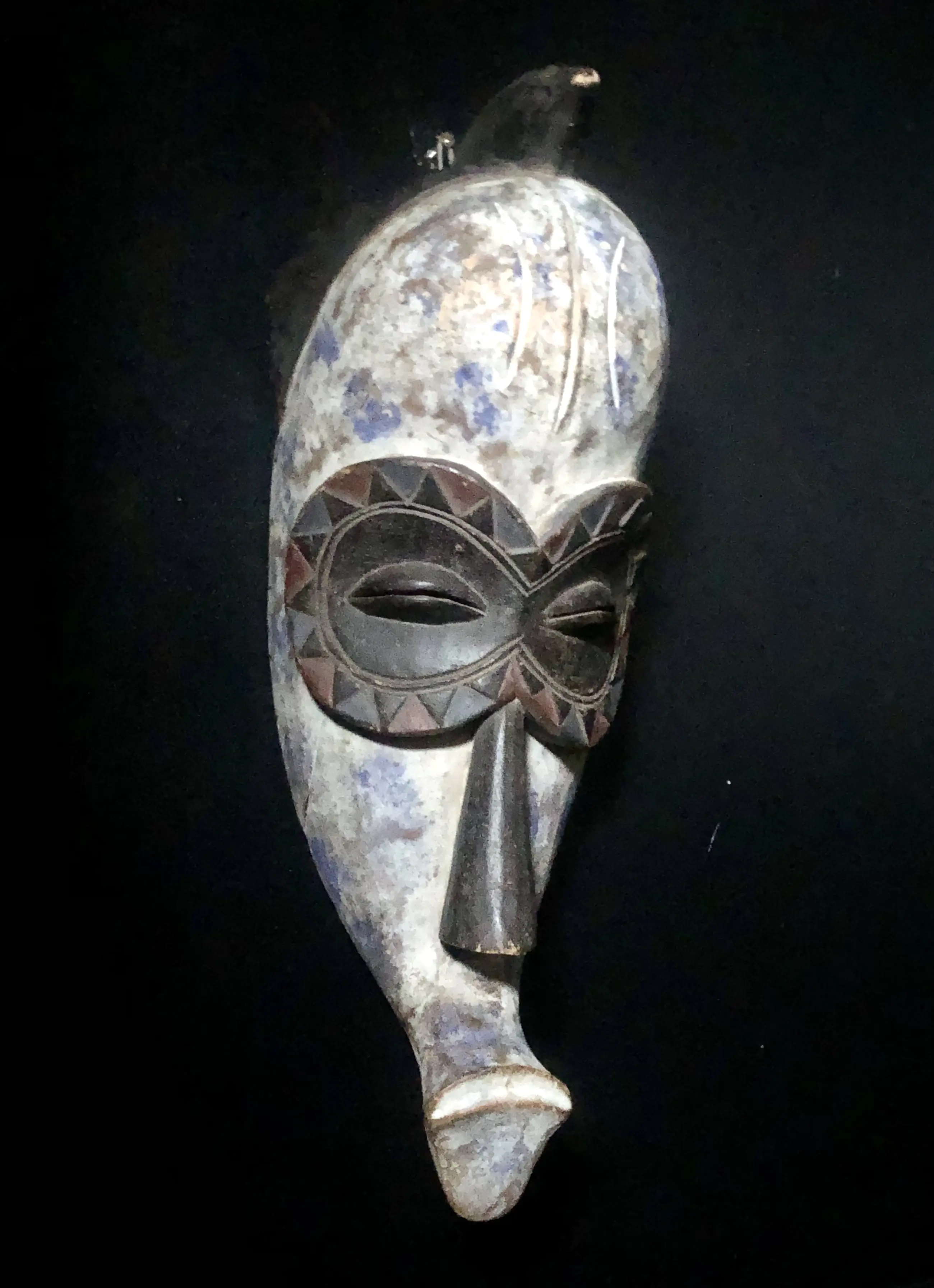 Rijk versiert Ngil masker met blauw en wit pigment. Ngil-maskers werden gedragen door het Fang-volk in Gabon en lange tijd beschouwd als een 'heilige graal' van de Afrikaanse kunst. Deze maskers werden gemaakt om te imponeren, en dat doen ze tot op de dag van vandaag.