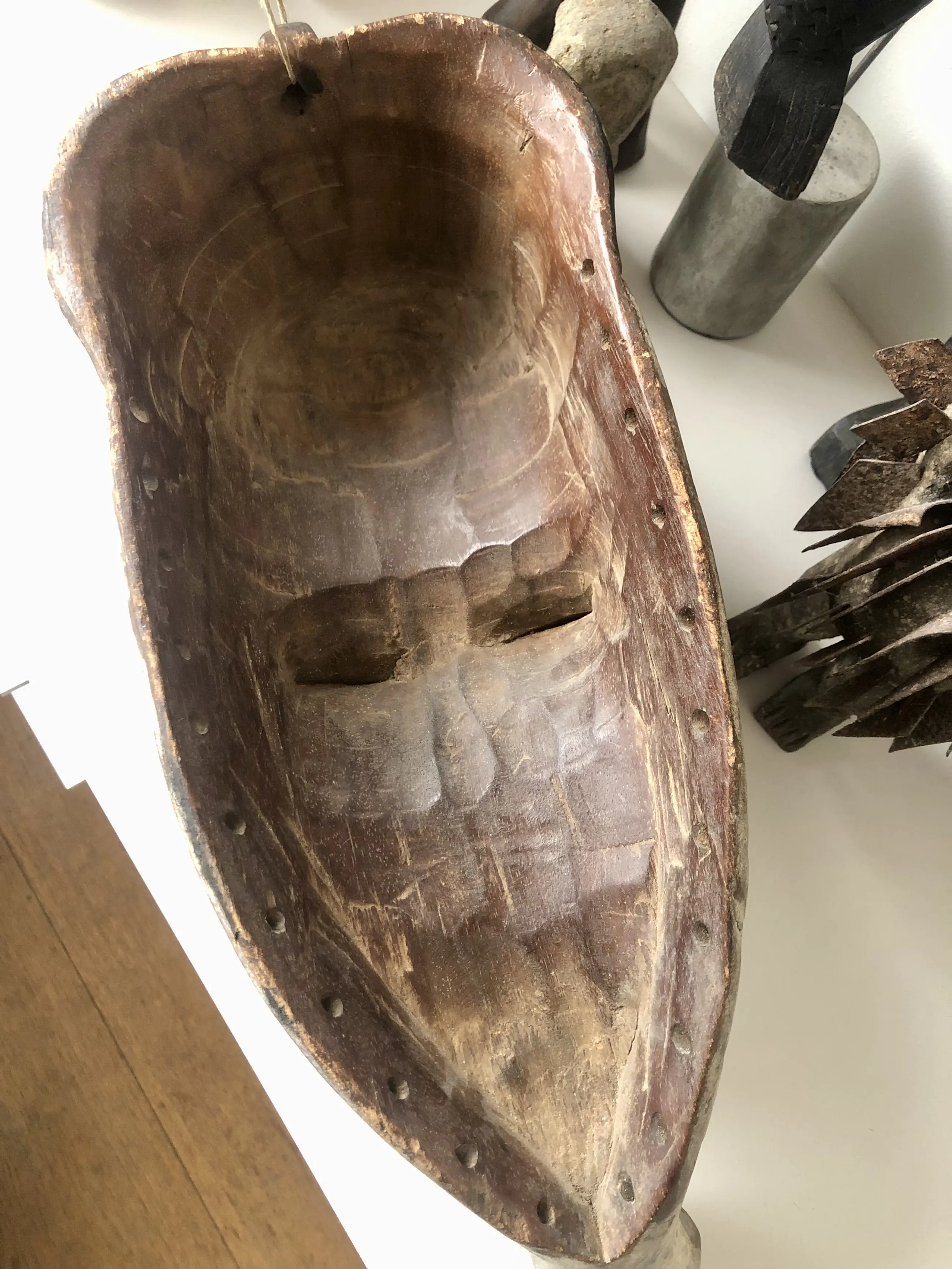 Het sebum patina aan de binnenkant van het masker getuigt van tribaal gebruik. Wordt wereldwijd en goed verpakt verzonden.