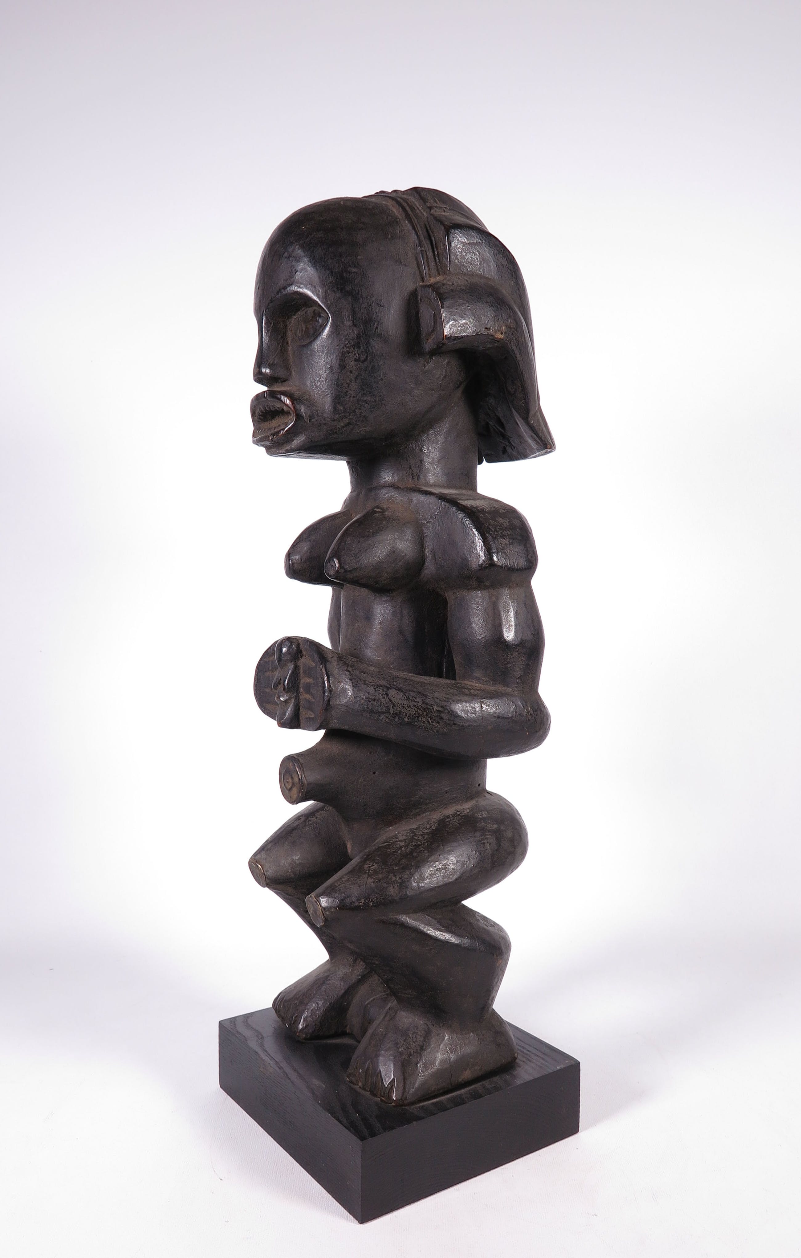Houten gestoken Fang Ntumu (stam) sculptuur van staand vrouwelijk figuur met uitstekende navel en een baby in de handen. Herkomst: Kameroen.