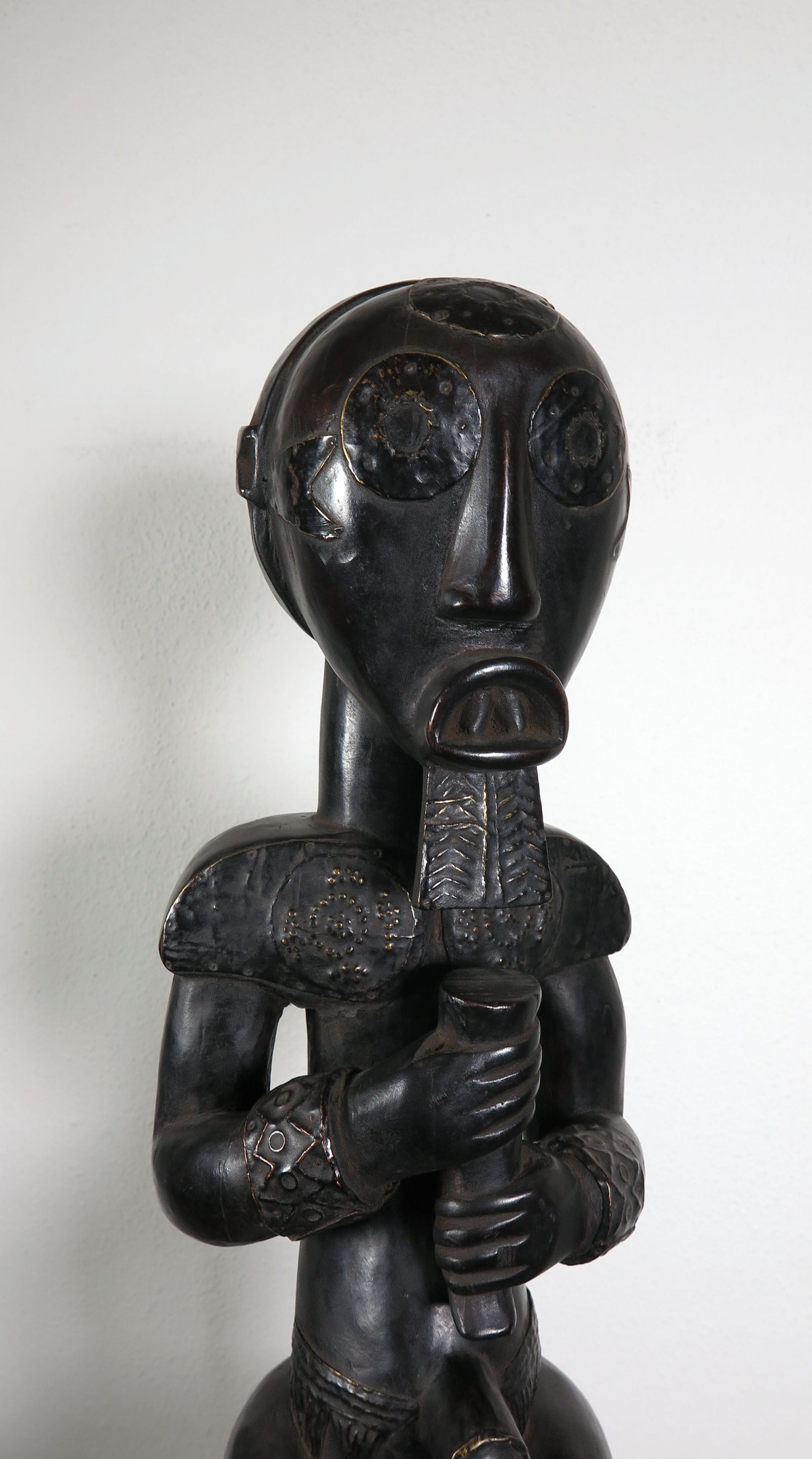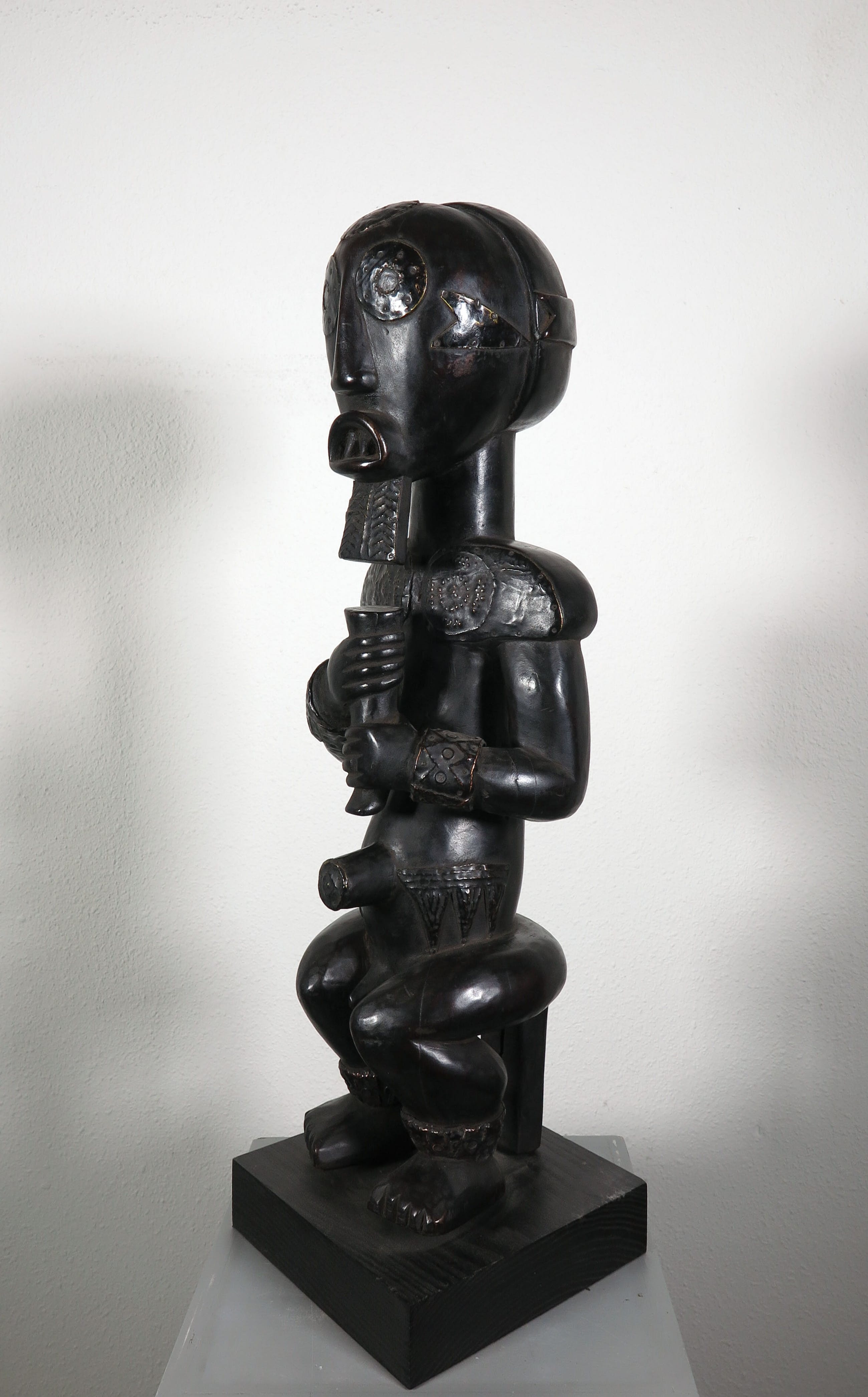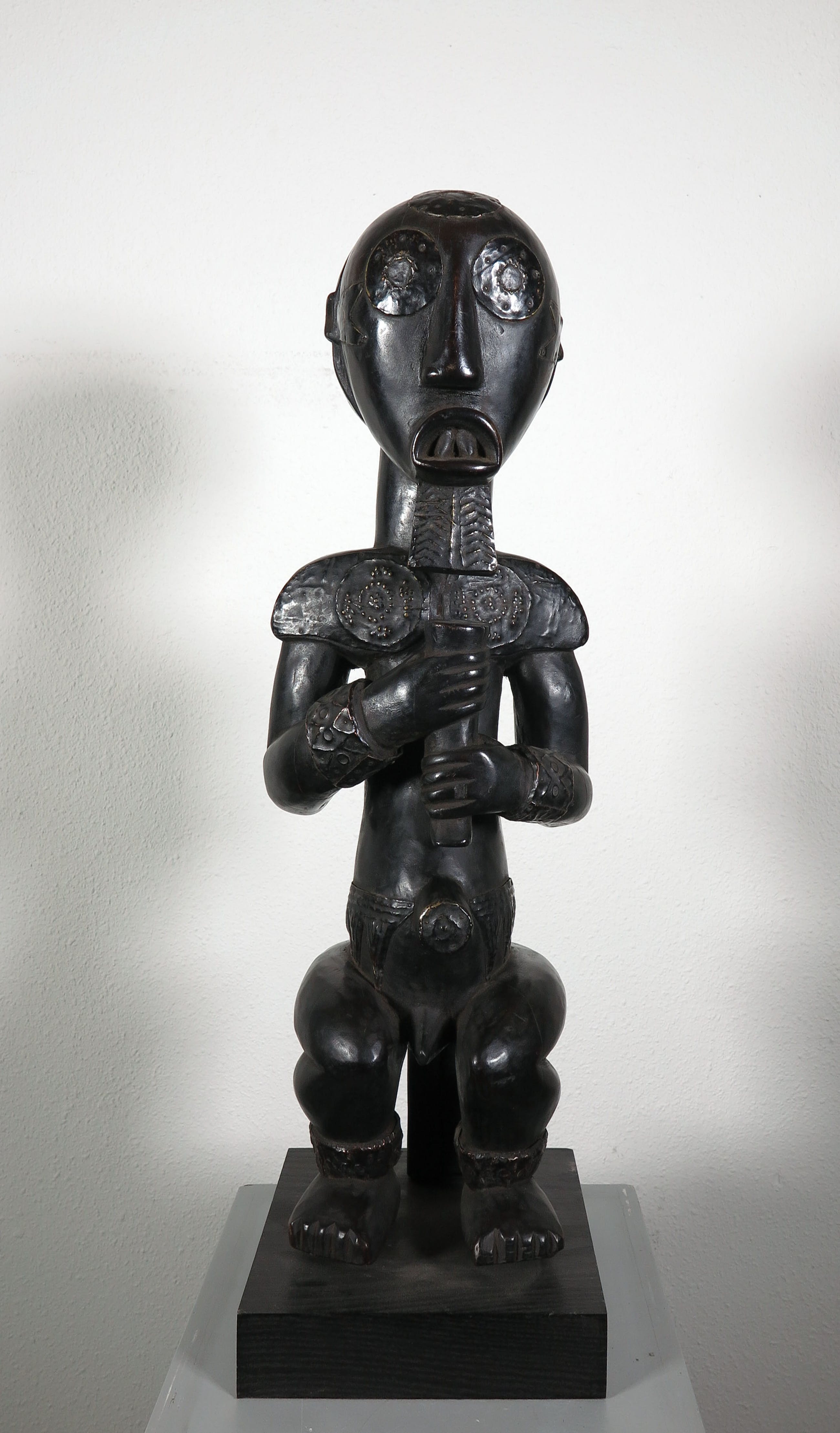 Houten gestoken Fang Ntumu (stam) sculptuur van zittend mannenfiguur, afgezet met koperen ornamenten en aangekleed met arm- en enkelbanden. Herkomst: Kameroen.