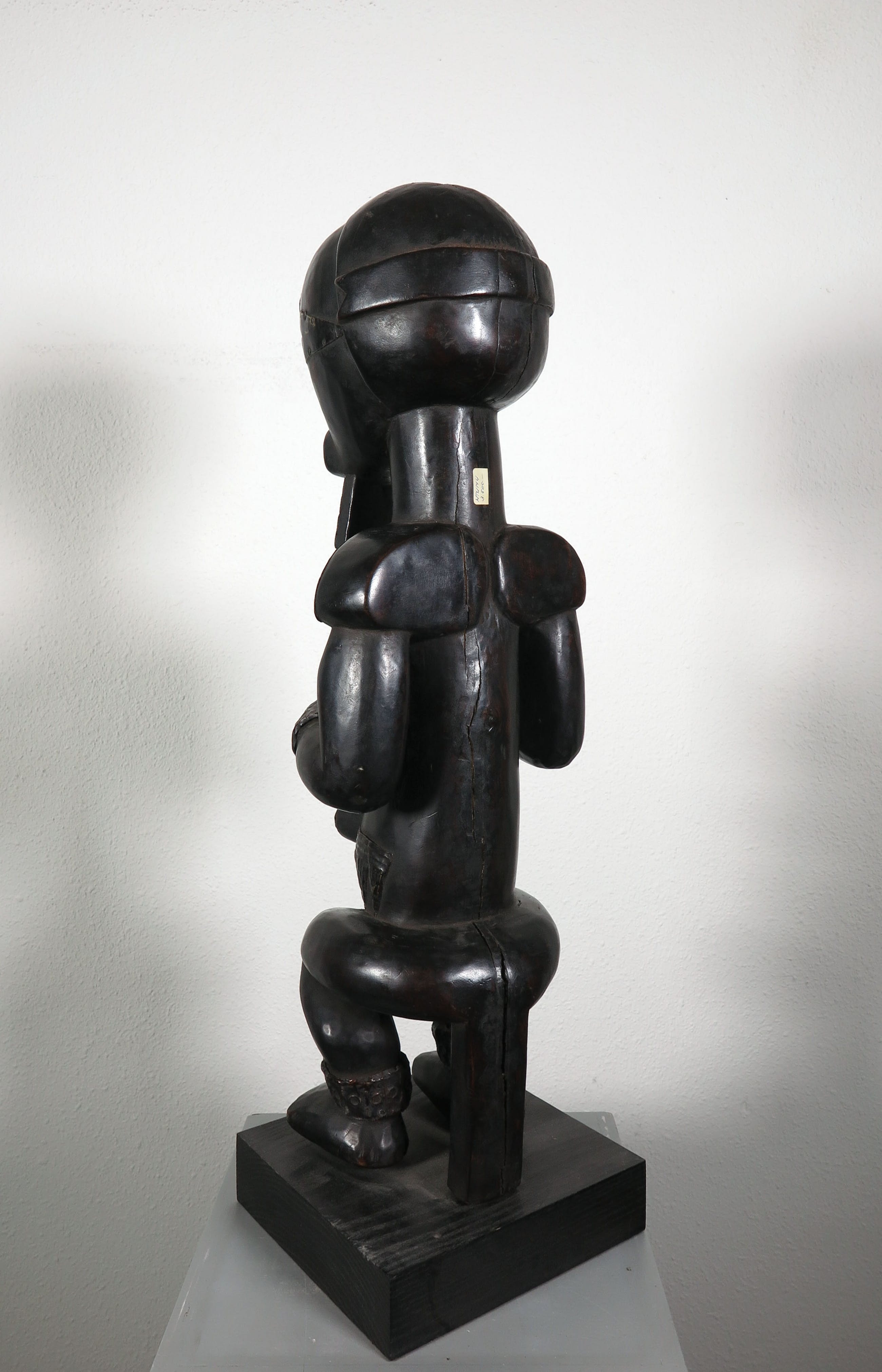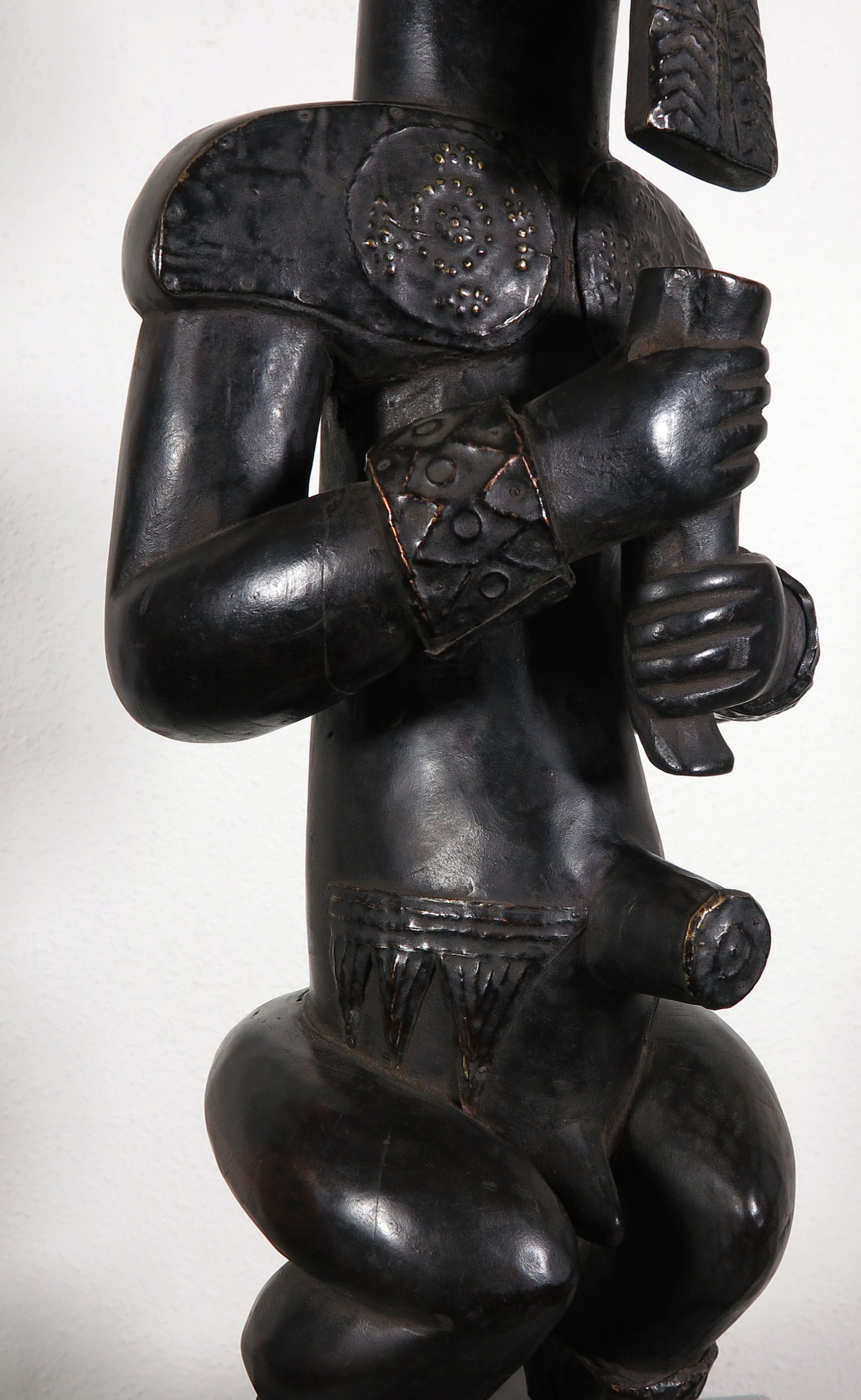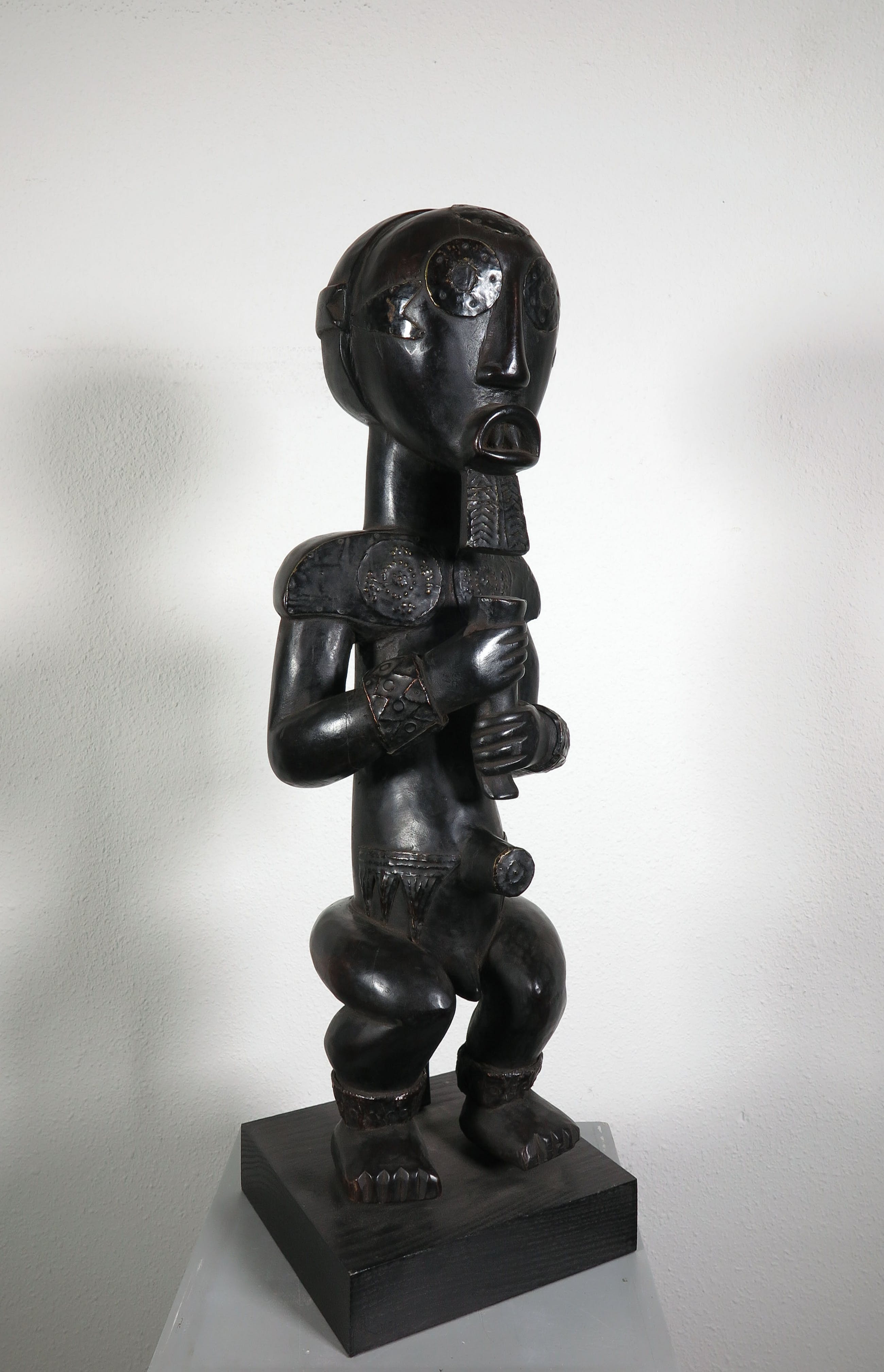 Houten gestoken Fang Ntumu (stam) sculptuur van zittend mannenfiguur, afgezet met koperen ornamenten en aangekleed met arm- en enkelbanden. Herkomst: Kameroen.